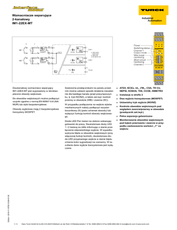 Wzmacniacze separujące 2-kanałowy IM1-22EX-MT Dwukanałowy wzmacniacz separujący IM1-22EX-MT jest wyposażony w iskrobezpieczne obwody wejściowe. Do obwodów wejściowych można podłączyć czujniki zgodne z normą EN 60947-5-6 (NAMUR) lub styki bezpotencjałowe. Obwody wyjściowe mają 2 bezpotencjałowe tranzystory MOSFET. Sześcioma przełącznikami na panelu przednim można ustawić sposób działania niezależnie dla każdego kanału (prąd pracy/spoczynku, tj. tryb NO/NZ), a także zał./wył. kontroli przerwy w obwodzie (WB) i zwarcia (SC). W przypadku podłączenia na wejście styków mechanicznych należy podłączyć rezystor bocznikowy (II) (patrz schemat obwodu) lub wyłączyć funkcję kontroli obwodu wejściowego. C US ■ Instalacja w strefie 2 ■ Dwa wyjścia tranzystorowe (MOSFET) ■ Ustawialny tryb wyjścia (NO/NZ) ■ Kontrola obwodów wejściowych pod względem zwarcia/przerwy w obwodzie (przełącznik zał./wył.) ■ Pełna separacja galwaniczna ■ Monitorowanie obwodów wejściowych pod kątem przerwania i zwarcia w przypadku zastosowania wartości „1” na wejściu Edition • 2016-11-10T05:15:58+01:00 Dioda LED Pwr świeci na zielono wskazując gotowość do pracy. Dwukolorowe diody LED 1 i 2 świecą na żółto informując o stanie przełączania odpowiedniego wyjścia. W wypadku wykrycia błędu w obwodzie wejściowym (przy włączonej funkcji kontroli), dwukolorowa dioda LED przypisanego wejścia w stanie błędu zmienia kolor sygnalizacji na czerwony. W rezultacie dane wyjście tranzystorowe jest wyłączane. ■ ATEX, IECEx, UL, FM , CSA, TR CU, NEPSI, KOSHA, TIIS, CCOE, INMETRO 1/3 Hans Turck GmbH & Co.KG ñ D-45472 Mülheim an der Ruhr ñ Witzlebenstraße 7 ñ Tel. 0208 4952-0 ñ Fax 0208 4952-264 ñ [email protected] ñ www.turck.com Wzmacniacze separujące 2-kanałowy IM1-22EX-MT Typ Nr kat. IM1-22EX-MT 7541213 Napięcie nominalne Napięcie zasilania Częstotliwość Napięcie zasilania Pobór mocy Zasilanie uniwersalne 20…250 VAC 40…70 Hz 20…125 VDC ð3W Wejście NAMUR NAMUR Kontrola obwodu wejściowego Napięcie bez obciążenia Prąd zwarcia Rezystancja wejścia Rezystancja przewodu Próg załączenia: Próg wyłączenia: Próg sygnalizacji przerwy w obwodzie Wartość progowa zwarcia EN 60947-5-6 Przełączanie zał./wył. 8.2 VDC 8.2 mA 1 kò ð 50 ò 1.75 mA 1.55 mA ð 0.06 mA ï 6.4 mA Półprzewodnikowy obwód wyjściowy Obwody wyjściowe (dwustanowe) Napięcie przełączania Napięcie przełączania Prąd przełączania na wyjście Częstotliwość przełączania 2 x MOSFET (bezpotencjałowe, zabezpieczenie przed zwarciem) ð 250 VAC ð 120 VDC ð 0.1 A ð 1000 Hz Separacja galwaniczna Napięcie testowe 2,5 kV Ważna informacja Dopuszczenie Ex zgodne z odpowiednimi certyfikatami Zastosowanie kategoria ochrony przed zapłonem Wartość maksymalna: Dopuszczenie Ex zgodne z odpowiednimi certyfikatami Zastosowanie Stopień ochrony Wartość maksymalna: Charakterystyka W przypadku aplikacji Ex zastosowanie mają wartości określone w stosownych certyfikatach Ex (ATEX, IECEx, UL itp.). TÜV 04 ATEX 2553 II (1) G, II (1) D [Ex ia Ga] IIC; [Ex ia Da] IIIC Terminal zaciskowy: 1+4 / 2+5 TÜV 06 ATEX 552968 X II 3 G Ex nA [ic Gc] IIC/IIB T4 Gc Terminal zaciskowy: 1+4 / 2+5 liniowe Wskazanie Gotowość do pracy Stan przełączania Wskazanie błędu zielony żółta czerwona Dane mechaniczne Klasa ochrony Klasa palności zgodnie z UL 94 Temperatura pracy Edition • 2016-11-10T05:15:58+01:00 Dimensions Temperatura składowania Wilgotność względna Wymiary Weight Instrukcja montażu Materiał obudowy Połączenie elektryczne Przekrój zacisku Moment dokręcający 2/3 IP20 V-0 -25 …+70 °C -25 ... +60 °C für UL, FM, TIIS -40…+80 °C ð 95 % 104 x 18 x 110 mm 145 g Szyna DIN (NS35) lub panel poliwęglan/ABS 4 x 3-stykowe zdejmowalne terminale zaciskowe, zabezpieczenie przed odwrotną polaryzacją, połączenie śrubowe 1 x 2,5 mm / 2 x 1,5 mm 0.5 Nm 2 2 Hans Turck GmbH & Co.KG ñ D-45472 Mülheim an der Ruhr ñ Witzlebenstraße 7 ñ Tel. 0208 4952-0 ñ Fax 0208 4952-264 ñ [email protected] ñ www.turck.com Wzmacniacze separujące 2-kanałowy IM1-22EX-MT Akcesoria montażowe Typ Nr kat. IM-CC-3X2BU/2BK 6900475 Rysunek wymiarowy Terminale zaciskowe dla modułów serii IM (urządzenia Ex o szerokości 18 mm) zawierają: 2 szt. 3-polowych, niebieskich terminali i 2 szt. 3-polowych, czarnych terminali. WM1 0912101 Moduł rezystora WM1 przeznaczony jest do pracy przy kontroli połączenia pomiędzy stykiem mechanicznym a urządzeniem przetwarzającym firmy TURCK. Obwód wejściowy przetwornika sygnałowego przystosowany jest dla czujników zgodnych z EN60947-5-6 (NAMUR) i posiada funkcję kontroli Edition • 2016-11-10T05:15:58+01:00 zwarcia oraz przerwy w obwodzie. 3/3 Hans Turck GmbH & Co.KG ñ D-45472 Mülheim an der Ruhr ñ Witzlebenstraße 7 ñ Tel. 0208 4952-0 ñ Fax 0208 4952-264 ñ [email protected] ñ www.turck.com