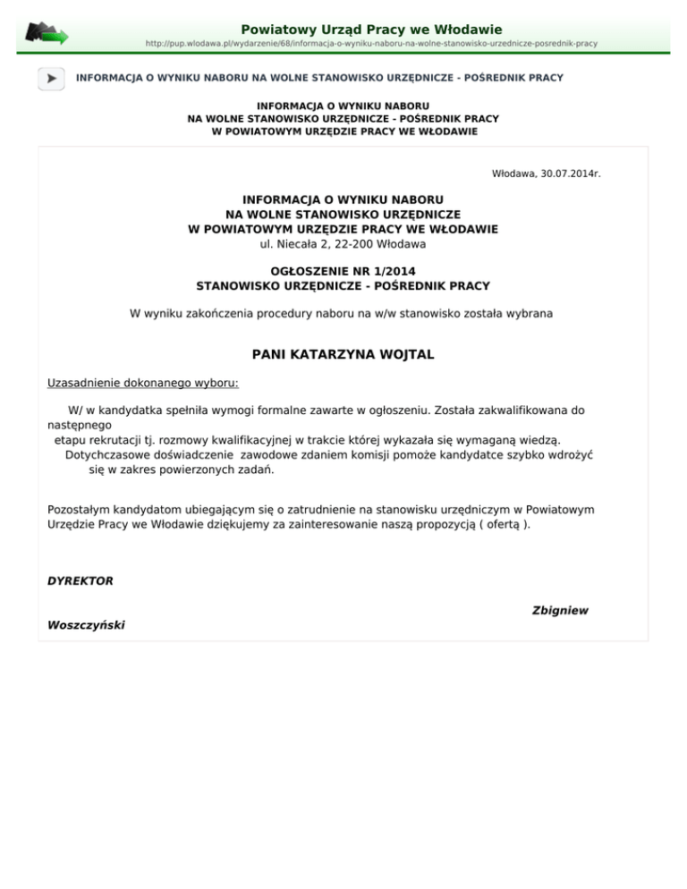 Powiatowy Urząd Pracy we Włodawie http://pup.wlodawa.pl/wydarzenie/68/informacja-o-wyniku-naboru-na-wolne-stanowisko-urzednicze-posrednik-pracy INFORMACJA O WYNIKU NABORU NA WOLNE STANOWISKO URZĘDNICZE - POŚREDNIK PRACY INFORMACJA O WYNIKU NABORU NA WOLNE STANOWISKO URZĘDNICZE - POŚREDNIK PRACY W POWIATOWYM URZĘDZIE PRACY WE WŁODAWIE Włodawa, 30.07.2014r. INFORMACJA O WYNIKU NABORU NA WOLNE STANOWISKO URZĘDNICZE W POWIATOWYM URZĘDZIE PRACY WE WŁODAWIE ul. Niecała 2, 22-200 Włodawa OGŁOSZENIE NR 1/2014 STANOWISKO URZĘDNICZE - POŚREDNIK PRACY W wyniku zakończenia procedury naboru na w/w stanowisko została wybrana PANI KATARZYNA WOJTAL Uzasadnienie dokonanego wyboru: W/ w kandydatka spełniła wymogi formalne zawarte w ogłoszeniu. Została zakwalifikowana do następnego etapu rekrutacji tj. rozmowy kwalifikacyjnej w trakcie której wykazała się wymaganą wiedzą. Dotychczasowe doświadczenie zawodowe zdaniem komisji pomoże kandydatce szybko wdrożyć się w zakres powierzonych zadań. Pozostałym kandydatom ubiegającym się o zatrudnienie na stanowisku urzędniczym w Powiatowym Urzędzie Pracy we Włodawie dziękujemy za zainteresowanie naszą propozycją ( ofertą ). DYREKTOR Zbigniew Woszczyński
