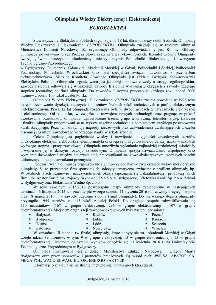 Olimpiada Wiedzy Elektrycznej i Elektronicznej EUROELEKTRA Stowarzyszenie Elektryków Polskich organizuje od 18 lat, dla młodzieży szkół średnich, Olimpiadę Wiedzy Elektrycznej i Elektronicznej EUROELEKTRA. Olimpiada znajduje się w rejestrze olimpiad Ministerstwa Edukacji Narodowej. Za organizację Olimpiady odpowiedzialny jest Komitet Główny Olimpiady powoływany przez Prezesa Stowarzyszenia Elektryków Polskich. Komitet Główny Olimpiady tworzą głównie nauczyciele akademiccy, między innymi: Politechniki Białostockiej, Uniwersytetu Technologiczno-Przyrodniczego w Bydgoszczy, Politechniki Gdańskiej, Akademii Morskiej w Gdyni, Politechniki Łódzkiej, Politechniki Poznańskiej, Politechniki Wrocławskiej oraz inni specjaliści związani zawodowo z przemysłem elektrotechnicznym. Siedzibą Komitetu Głównego Olimpiady jest Oddział Bydgoski Stowarzyszenia Elektryków Polskich. Olimpiada organizowana jest jako trójstopniowe zawody o zasięgu ogólnopolskim. Zawody I stopnia odbywają się w szkołach, zawody II stopnia w dwunastu okręgach a zawody trzeciego stopnień (centralne) to finał olimpiady. Do zawodów I stopnia przystępuje każdego roku ponad 2000 uczniów z ponad 100 szkół z całej Polski. Olimpiada Wiedzy Elektrycznej i Elektronicznej EUROELEKTRA została powołana w 1998 roku na zapotrzebowanie dyrekcji, nauczycieli i uczniów średnich szkół technicznych o profilu elektrycznym i elektronicznym. Przez 12 lat olimpiada rozgrywana była w dwóch grupach tematycznych: elektrycznej i elektronicznej. Od kilku lat, w związku z rozwojem nowych technologii oraz pragnąc zaspokoić oczekiwania uczestników olimpiady, wprowadzono trzecią grupę tematyczną: teleinformatykę. Laureaci i finaliści olimpiady przyjmowani są na wyższe uczelnie techniczne z pominięciem zwykłego postępowania kwalifikacyjnego. Poza tym otrzymują nagrody rzeczowych oraz zaświadczenia zwalniające ich z części pisemnej egzaminu zawodowego kończącego naukę w szkole średniej. Celem Olimpiady jest pogłębianie wiedzy i rozwijanie umiejętności zawodowych uczniów w dziedzinie elektryki, elektroniki i teleinformatyki oraz lepsze przygotowanie do dalszej nauki w szkołach wyższego stopnia i pracy zawodowej. Olimpiada umożliwia wyłanianie najbardziej uzdolnionej młodzieży i wspieranie jej w dalszym rozwoju zawodowym. Olimpiada sprzyja nawiązywaniu współpracy oraz wymianie doświadczeń między nauczycielami, pracownikami naukowo-dydaktycznymi wyższych uczelni technicznych oraz pracownikami przemysłu. Podczas trwania olimpiady organizowane się imprezy dodatkowe zwiększające walory merytoryczne olimpiady. Są to prezentacje firm sponsorskich, odczyty tematyczne związane z profilem olimpiady itp. W ostatnich latach uczniowie i nauczyciele mieli okazją zapoznania się z działalnością i produkcją takich firm, jak: Apator Toruń SA, Pojazdy Szynowe PESA SA w Bydgoszczy, Telefonika Kable Sp. z o.o. Zakład w Bydgoszczy oraz Elektrownie Wodne Sp. z o.o. W roku szkolnym 2015/2016 poszczególne etapy olimpiady zaplanowano w następujących terminach: 6 listopada 2015 r. – zawody pierwszego stopnia, 11 stycznia 2016 r. – zawody drugiego stopnia oraz 18 marca 2016 r. – zawody trzeciego stopnia (finał olimpiady). Do pierwszego stopnia olimpiady przystąpiło 1945 uczniów ze 113 szkół z całej Polski. Do drugiego stopnia zakwalifikowało się 570 uczestników (167 w grupie elektrycznej, 296 w grupie elektronicznej i 107 w grupie teleinformatycznej). Miejscem organizacji zawodów okręgowych były następujące miasta: Białystok Kraków Poznań Bydgoszcz Lublin Rzeszów Gdańsk Łódź Szczecin Katowice Nowy Sącz Wrocław W zawodach III stopnia (w finale) olimpiady, które odbyły się na Akademii Morskiej w Gdyni wzięło udział 39 uczniów, w tym: 9 w grupie elektrycznej, 15 w grupie elektronicznej i 15 w grupie teleinformatycznej. Uroczyste ogłoszenie wyników odbędzie się 13 kwietnia 2016 r. na Uniwersytecie Technologiczno-Przyrodniczym w Bydgoszczy. Olimpiada finansowana jest z dotacji Ministerstwa Edukacji Narodowej i Urzędu Miasta Bydgoszczy oraz przez sponsorów i partnerów branżowych. Są wśród nich: PSE SA. APATOR SA, MEGA-POL, WAGO ELWAG, ELTOR, ENERGO-PARTNER. Informacje o znajdują się na stronie internetowej: www.euroelektra.edu.pl. Bydgoszcz, 21 marca 2016