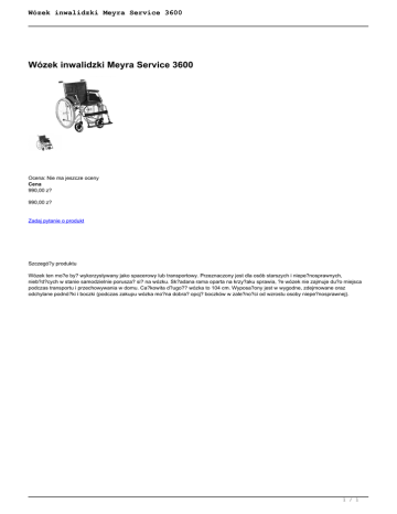 Wózek inwalidzki Meyra Service 3600 Wózek inwalidzki Meyra Service 3600 Ocena: Nie ma jeszcze oceny Cena 990,00 z? 990,00 z? Zadaj pytanie o produkt Szczegó?y produktu Wózek ten mo?e by? wykorzystywany jako spacerowy lub transportowy. Przeznaczony jest dla osób starszych i niepe?nosprawnych, nieb?d?cych w stanie samodzielnie porusza? si? na wózku. Sk?adana rama oparta na krzy?aku sprawia, ?e wózek nie zajmuje du?o miejsca podczas transportu i przechowywania w domu. Ca?kowita d?ugo?? wózka to 104 cm. Wyposa?ony jest w wygodne, zdejmowane oraz odchylane podnó?ki i boczki (podczas zakupu wózka mo?na dobra? opcj? boczków w zale?no?ci od wzrostu osoby niepe?nosprawnej). 1 / 1 Powered by TCPDF (www.tcpdf.org)
