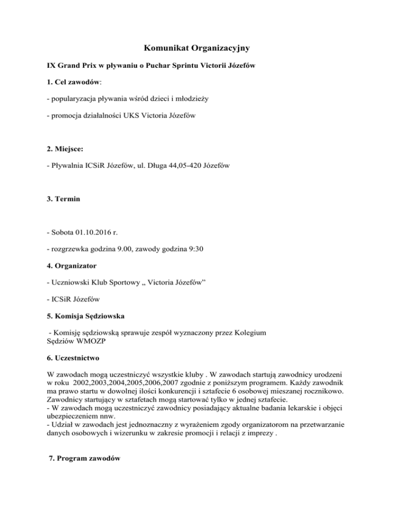 Komunikat Organizacyjny IX Grand Prix w pływaniu o Puchar Sprintu Victorii Józefów 1. Cel zawodów: - popularyzacja pływania wśród dzieci i młodzieży - promocja działalności UKS Victoria Józefów 2. Miejsce: - Pływalnia ICSiR Józefów, ul. Długa 44,05-420 Józefów 3. Termin - Sobota 01.10.2016 r. - rozgrzewka godzina 9.00, zawody godzina 9:30 4. Organizator - Uczniowski Klub Sportowy „ Victoria Józefów” - ICSiR Józefów 5. Komisja Sędziowska - Komisję sędziowską sprawuje zespół wyznaczony przez Kolegium Sędziów WMOZP 6. Uczestnictwo W zawodach mogą uczestniczyć wszystkie kluby . W zawodach startują zawodnicy urodzeni w roku 2002,2003,2004,2005,2006,2007 zgodnie z poniższym programem. Każdy zawodnik ma prawo startu w dowolnej ilości konkurencji i sztafecie 6 osobowej mieszanej rocznikowo. Zawodnicy startujący w sztafetach mogą startować tylko w jednej sztafecie. - W zawodach mogą uczestniczyć zawodnicy posiadający aktualne badania lekarskie i objęci ubezpieczeniem nnw. - Udział w zawodach jest jednoznaczny z wyrażeniem zgody organizatorom na przetwarzanie danych osobowych i wizerunku w zakresie promocji i relacji z imprezy . 7. Program zawodów Dziewczęta 1. 50 m st. dowolnym (rocznik 2007,2006,2005,2004,2003,2002) 3. 50 m st. klasycznym (rocznik 2007,2006,2005,2004,2003,2002) 5.50 m st. grzbietowym (rocznik 2007,2006,2005,2004,2003,2002,) 7. 50 m st. motylkowym (tylko rocznik 2006,2005,2004,2003,2002) Chłopcy 2. 50 m st. dowolnym (rocznik 2007,2006,2005,2004,2003,2002) 4. 50 m st. klasycznym (rocznik 2007,2006,2005,2004,2003,2002) 6.50 m st. grzbietowym (rocznik 2007,2006,2005,2004,2003,2002) 8. 50 m st. motylkowym (tylko rocznik 2006,2005,2004,2003,2002) 9. 6 x 50 m st. dowolny kobiety ( po jednej zawodniczce z każdego rocznika ) 10. 6 x 50 m st. dowolny ( po jednym zawodniku z każdego rocznika ) 8. Przepisy techniczne - Zawody zostaną rozegrane seriami na czas. Pomiar czasu – ręczny. - Zawodnik ma prawo startu w dowolnej ilości konkurencji i w sztafecie. - Zawodnicy będą rozstawieni na podstawie zgłoszonych czasów w seriach od najszybszej do najwolniejszej. - Zawody zostaną przeprowadzone zgodnie z przepisami PZP. W sprawach nie objętych regulaminem decyduje Sędzia Główny w porozumieniu z organizatorem. - W wyścigach sztafetowych (chłopcy i dziewczęta) w razie braku starszego rocznika dopuszcza się start zawodnika młodszego. 9. Nagrody i ocena zawodów - Najlepszych 3 zawodników w każdym roczniku, w każdej indywidualnej konkurencji otrzyma medale i dyplomy. - Najlepsze 3 sztafety w kat. chłopców i dziewcząt otrzymają Puchary Prezesa Victorii Józefów oraz medale. 10. Opłaty startowe i zasady finansowania - Opłata startowa wynosi 15 złotych od startu – płatna w biurze zawodów przed zawodami. - Opłata startowa będzie pobierana za wszystkich zgłoszonych zawodników z poszczególnych klubów. -Zawodnicy nie wycofani w przewidzianym komunikatem czasie nie będą zwolnieni z opłat startowych. - Koszty organizacyjne pokrywa organizator. - Koszty uczestnictwa pokrywają kluby. - Klub posiada ubezpieczenie NNW „PZU SPORT” 11. Zgłoszenie UWAGA: Wszystkie zgłoszenia na zawody należy wypełniać w programie Entry Edytor i wysłać na adres e-mailowy [email protected] Zgłoszenia proszę nadsyłać do 29.09.2016 r., Lista zgłoszonych zawodników ukaże się na stronie internetowej w dniu 30.09.2016 r. Zgodnie z regulaminem PZP po opublikowaniu w internecie listy zgłoszonych zawodników zmiany mogą być dokonane wyłącznie: pocztą elektroniczną do dnia 30.09.2016 r. do godziny 16:00, i dotyczyć: - wycofania zawodnika z konkurencji - wpisania na miejsce wycofanego zawodnika w tej samej konkurencji innego reprezentanta tego samego klubu. - za zawodników nie wykreślonych w terminie będzie pobierana opłata startowa. Zgłoszenie nadesłane po terminie nie będą włączone do zawodów. 13. Dodatkowe informacje kontakt: zarzą[email protected]