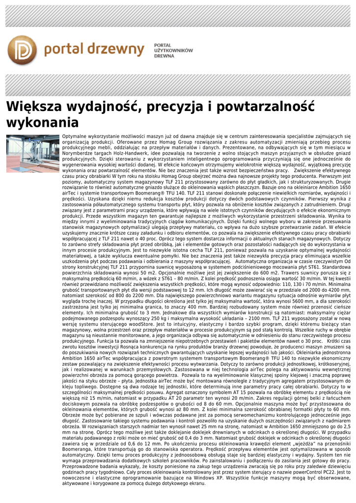 Większa wydajność, precyzja i powtarzalność wykonania Optymalne wykorzystanie możliwości maszyn już od dawna znajduje się w centrum zainteresowania specjalistów zajmujących się organizacją produkcji. Oferowane przez Homag Group rozwiązania z zakresu automatyzacji zmieniają przebieg procesu produkcyjnego mebli, oddziałując na przepływ materiałów i danych. Prezentowane, na odbywających się w tym miesiącu w Norymberdze targach Holz-Handwerk, idee pozwalają na tworzenie z wolno stojących maszyn przyjaznych w obsłudze gniazd produkcyjnych. Dzięki sterowaniu z wykorzystaniem inteligentnego oprogramowania przyczyniają się one jednocześnie do wygenerowania wysokiej wartości dodanej. W efekcie końcowym otrzymujemy wielokrotnie większą wydajność, wyjątkową precyzję wykonania oraz powtarzalność elementów. Nie bez znaczenia jest także wzrost bezpieczeństwa pracy. Zwiększenie efektywnego czasu pracy obrabiarki W tym roku na stoisku Homag Group obejrzeć można dwa najnowsze projekty tego producenta. Pierwszym jest poziomy, automatyczny system magazynowy TLF 211 przystosowany zarówno do płyt gładkich, jak i strukturyzowanych. Drugie rozwiązanie to również automatyczne gniazdo służące do okleinowania wąskich płaszczyzn. Bazuje ono na okleiniarce Ambition 1650 airTec i systemie transportowym Boomerang® TFU 140. TLF 211 stanowi doskonałe połączenie niewielkich rozmiarów, wydajności i prędkości. Uzyskana dzięki niemu redukcja kosztów produkcji dotyczy dwóch podstawowych czynników. Pierwszy wynika z zastosowania półautomatycznego systemu transportu płyt, który pozwala na obniżenie kosztów związanych z zatrudnieniem. Drugi związany jest z parametrami pracy urządzenia, które wpływają na wiele istotnych czynników decydujących o efekcie ekonomicznym produkcji. Przede wszystkim magazyn ten gwarantuje najlepsze z możliwych wykorzystanie przestrzeni składowania. Wynika to między innymi z wyeliminowania tradycyjnych ciągów komunikacyjnych. Dzięki funkcji wolnego wyboru w zakresie przesuwania stanowisk magazynowych optymalizacji ulegają przepływy materiału, co wpływa na dużo szybsze przetwarzanie zadań. W efekcie uzyskujemy znacznie krótsze czasy załadunku i odbioru elementów, co pozwala na zwiększenie efektywnego czasu pracy obrabiarki współpracującej z TLF 211 nawet o 40 proc. Oprócz tego system dostarcza informacji o aktualnych stanach magazynowych. Dotyczy to zarówno strefy składowania płyt przed obróbką, jak i elementów gotowych oraz pozostałości nadających się do wykorzystania w innym procesie produkcyjnym. Jest to niezwykle istotna cecha TLF 211, ponieważ pozwala na uzyskanie optymalnej wydajności materiałowej, a także wyklucza ewentualne pomyłki. Nie bez znaczenia jest także niezwykła precyzja pracy eliminująca wszelkie uszkodzenia płyt podczas podawania i odbierania z maszyny współpracującej. Automatyczna organizacja w czasie rzeczywistym Od strony konstrukcyjnej TLF 211 przypomina suwnicę wyposażoną w systemem podciśnieniowego mocowania płyt ST61. Standardowa powierzchnia składowania wynosi 50 m2. Opcjonalnie możliwe jest jej zwiększenie do 600 m2. Trawers suwnicy porusza się z maksymalną prędkością 60 m/min, a wózek z ST61 – 80 m/min. Z kolei prędkość podnoszenia osiąga wartość 30 m/min. W tej kwestii również przewidziano możliwość zwiększenia wszystkich prędkości, które mogą wynosić odpowiednio: 110, 130 i 70 m/min. Minimalna grubość transportowanych płyt dla wersji podstawowej to 12 mm. Ich długość może zawierać się w przedziale od 2000 do 4200 mm, natomiast szerokość od 800 do 2200 mm. Dla największego powierzchniowo wariantu magazynu sytuacja odnośnie wymiarów płyt wygląda trochę inaczej. W przypadku długości określona jest tylko jej maksymalna wartość, która wynosi 5600 mm, a dla szerokości zastrzeżona jest tylko jej minimalna granica, to znaczy 400 mm. Bardziej rozbudowany system może również przenosić cieńsze elementy. Ich minimalna grubość to 3 mm. Jednakowe dla wszystkich wymiarów konstrukcji są natomiast: maksymalny ciężar podejmowanego podzespołu wynoszący 250 kg i maksymalna wysokość układania – 2100 mm. TLF 211 wyposażony został w nową wersję systemu sterującego woodStore. Jest to intuicyjny, elastyczny i bardzo szybki program, dzięki któremu bieżący stan magazynowy, wolna przestrzeń oraz przepływ materiałów w procesie produkcyjnym są pod stałą kontrolą. Wszelkie ruchy w obrębie magazynu są nieustannie monitorowane, a jego organizacja odbywa się automatycznie w odniesieniu do stanu rzeczywistego procesu produkcyjnego. Funkcja ta pozwala na zmniejszenie niepotrzebnych przestawień i pakietów elementów nawet o 30 proc. Krótki czas zwrotu kosztów inwestycji Rosnąca konkurencja na rynku produktów branży drzewnej powoduje, że producenci maszyn zmuszeni są do poszukiwania nowych rozwiązań technicznych gwarantujących uzyskanie lepszej wydajności lub jakości. Okleiniarka jednostronna Ambition 1650 airTec współpracująca z powrotnym systemem transportowym Boomerang® TFU 140 to niezwykle ekonomiczny zestaw pozwalający na zwiększenie efektywności procesu wytwarzania. Dotyczy to zarówno produkcji jednostkowej, krótkoseryjnej, jak i realizowanej w warunkach przemysłowych. Zastosowana w niej technologia airTec polega na aktywowaniu wewnętrznej powierzchni obrzeża za pomocą gorącego powietrza. Pozwala to na wyeliminowanie klasycznej spoiny klejowej i znaczną poprawę jakości na styku obrzeże – płyta. Jednostka airTec może być montowana równolegle z tradycyjnym agregatem przystosowanym do kleju topliwego. Dostępne są dwa rodzaje tej jednostki, które determinują inne parametry pracy całej obrabiarki. Dotyczy to w szczególności maksymalnej prędkości posuwu. Agregat oznaczony symbolem AT 15 pozwala na obróbkę elementu z prędkością nie większą 