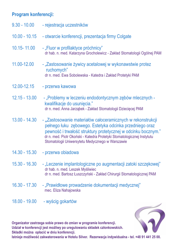 Program konferencji: 9.30 - 10.00 - rejestracja uczestników 10.00 - 10.15 - otwarcie konferencji, prezentacja firmy Colgate 10.15- 11.00 - „Fluor w profilaktyce próchnicy” dr hab. n. med. Katarzyna Grocholewicz - Zakład Stomatologii Ogólnej PAM 11.00-12.00 - „Zastosowanie żywicy acetalowej w wykonawstwie protez ruchomych” dr n. med. Ewa Sobolewska - Katedra i Zakład Protetyki PAM 12.00-12.15 - przerwa kawowa 12.15 - 13.00 - „Problemy w leczeniu endodontycznym zębów mlecznych kwalifikacje do usunięcia.” dr n. med. Anna Jarząbek - Zakład Stomatologii Dziecięcej PAM 13.00 - 14.30 - „Zastosowanie materiałów całoceramicznych w rekonstrukcji pełnego łuku zębowego. Estetyka odcinka przedniego oraz pewność i trwałość struktury protetycznej w odcinku bocznym.” dr n. med. Piotr Okoński - Katedra Protetyki Stomatologicznej Instytutu Stomatologii Uniwersytetu Medycznego w Warszawie 14.30 - 15.30 - przerwa obiadowa 15.30 - 16.30 - „Leczenie implantologiczne po augmentacji zatoki szczękowej” dr hab. n. med. Leszek Myśliwiec dr n. med. Bartosz Łuszczyński - Zakład Chirurgii Stomatologicznej PAM 16.30 - 17.30 - „Prawidłowe prowadzenie dokumentacji medycznej” mec. Eliza Nahajowska 18.00 - 19.00 - wyścig gokartów Organizator zastrzega sobie prawo do zmian w programie konferencji. Udział w konferencji jest możliwy po uregulowaniu składek członkowskich. Składki można opłacić w dniu konferencji. Istnieje możliwość zakwaterowania w Hotelu Silver. Rezerwacja indywidualna - tel. +48 91 441 25 00.
