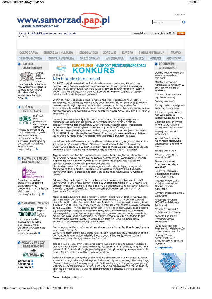 Serwis Samorządowy PAP SA Strona 1 28.03.2006 szukaj ... Jesteś 3 183 157 gościem na naszej stronie Oferta BGK zawiera wiele unikatowych instrumentów wspierania rozwoju samorządów - mówi Mirosław Czekaj, wiceprezes Zarządu BGK. BOŚ S.A. jest partnerem co trzeciego samorządu w Polsce. W styczniu br. bank otrzymał nagrodę „za nowoczesną, kompleksową ofertę bankową, dostosowaną do potrzeb i oczekiwań samorządów terytorialnych Świadczymy usługi związane z podpisem elektronicznym, proponujemy organizację elektronicznych przetargów i aukcji Przepisy regulujące status i nabywanie cechy organizacji poŜytku publicznego mają ogromne znaczenie dla jednostek samorządowych 21.02.2006 Niech angielski nie dzieli Od 2007 r. język angielski ma być obowiązkowy od pierwszej klasy szkoły podstawowej. Pomysł popierają samorzadowcy, ale co najmniej dyskusyjna wydaje im się propozycja resortu edukacji, aby premiować te gminy, które w 2006 r. znajdą anglistów i wprowadzą program. MoŜe to pogłębić przepaść między biednymi i bogatymi gminami. W ministerstwie edukacji i nauki pracują nad wprowadzeniem nauki języka angielskiego od pierwszej klasy szkoły podstawowej. Do tej pory przygotowano projekt nowelizacji rozporządzenia mający zwiększyć liczbę studentów zdobywających kwalifikacje do nauczania języków obcych. Prace rozpoczął zespół przygotowujący odpowiednią korektę podstawy programowej dla klas I-III szkoły podstawowej. Na zrealizowanie pomysły tylko podczas czterech miesięcy nowego roku szkolnego (od września do grudnia) potrzebne będzie około 27 mln zł. Jak poinformował nas Mieczysław Grabianowski, rzecznik MEiN, środki będą przekazane tym samorządom, które zaczną realizować program. Obliczono, Ŝe w pierwszym roku realizacji programu konieczne jest stworzenie około 2200 etatów dla anglistów. Gminy, które znajdą nauczycieli angielskiego juŜ w 2006 r. mogą liczyć na dodatkowe wsparcie z budŜetu państwa. „W takim razie dofinansowanie z budŜetu państwa dostaną te gminy, które i tak sobie poradzą” – uwaŜa Marek Olszewski, wójt gminy Lubicz. „Pomysł ma wyrównywać szanse, a w gruncie rzeczy róŜnica moŜe się pogłębić, bo biednych gmin nie będzie stać na wprowadzenie języka angielskiego” – ostrzega. Miasto wstrzymało egzekucję komorniczą w stołecznym klubie Le Madame Centrum Ratownictwa będzie wcześniej Działaj lokalnie V Radny z Miastka odpowie za jazdę po pijanemu 4 kwietnia głosowanie nad wnioskiem o samorozwiązanie Sejmu Częstochowa: Pierwsze w Polsce głosowanie maszynami wyborczymi Więcej na kontrakt wojewódzki Wyniki "Konkursu na najbardziej efektywną energetycznie gminę w Polsce” Pociągi bez zmian Jego zdaniem problem tak naprawdę nie tkwi w braku anglistów, ale w tym, Ŝe nauczyciele języków często nie posiadają dostatecznych kwalifikacji. Z raportu NajwyŜszej Izby Kontroli wynika jednoznacznie, Ŝe organizacja nauczania języków obcych w szkołach publicznych jest zła. „Jeśli dziecko ma być uczone od samego początku źle, to lepiej w ogóle nie rozpoczynać takiej nauki” – uwaŜa. Nauczyciele o wysokich kwalifikacjach językowych dostają duŜe lepiej płatne prace niŜ etat nauczyciela w wiejskiej szkole. Kłodzko: „Jak Ŝyć z powodziami?" Zdaniem Olszewskiego, wyjściem z tej sytuacji moŜe być zatrudnienie szkół językowych, które prowadziłyby lekcje np. w gminach wiejskich. „To rozwiązuje problem braku nauczycieli, a wcale nie musi pociągać za sobą wyŜszych kosztów” – uwaŜa. „Jednak do realizacji tego pomysłu potrzebna jest zmiana Karty Nauczyciela” – dodaje. "Gazeta Wyborcza": Kolejne pomorskie szpitale zostały oddłuŜone JeŜeli resort edukacji będzie premiował gminy, które juŜ w 2006 r. wprowadzą język angielski od pierwszej klasy szkoły podstawowej, to na dofinansowanie moŜe liczyć Koszalin. Prezydent Mirosław Mikietyński zdecydował bowiem, Ŝe od 1 września 2006 roku we wszystkich dwunastu szkołach podstawowych Koszalina ponad 850 uczniów rozpoczynających naukę w klasach pierwszych będzie uczyć się angielskiego. Prezydent Koszalina zdecydował o sfinansowaniu z budŜetu miasta godziny nauki języka angielskiego w tygodniu. Na realizację pomysłu w pierwszym roku będzie potrzebne 65 tysięcy złotych. W 2007 r. będzie to juŜ zdecydowanie wyŜsza kwota ze względu na fakt, Ŝe uczyć się będą klasy pierwsze i kontynuować naukę klasy drugie. Na dotację z budŜetu państwa nie zamierza czekać Jerzy Szydłowski, wójt gminy Lelów (woj. śląskie). „Głównym moim celem jako wójta jest to, aby kaŜde dziecko urodzone w gminie po skończeniu gimnazjum władało bardzo dobrze dwoma językami obcymi i doskonale znało obsługę komputera” – mówi. Jak podkreśla, jego gmina zamierza pozyskiwać pieniądze na naukę języków z grantów i konkursów. W 2005 roku wójt pozyskał m.in. z funduszy unijnych dla gminy około 7,5 mln zł. Część pieniędzy przeznaczył na sprzęt komputerowy dla dzieci. Teraz zamierza zadbać o naukę języków. poradniki szkolenia seminaria Donald Tusk o wyborach samorządowych w miastach Powiat raciborski: Starosta z wizytą w Wrexham Przemyśl: Pierwsze posiedzenie Zespołu Konsultacyjnego Gdynia: Prace społecznie uŜyteczne Nieporęt: Program IKONKA w Bibliotece Publicznej "Kurier Szczeciński": Szanse niezbyt równe "Gazeta Lubuska": Urzędnicy groŜą zmarłemu "Głos Wielkopolski": Poznańskich działkowców czeka przeprowadzka Liderzy PO nie porozumieli się z prezydentem w sprawie wyborów « poprzednie Jednak niektórych gminy nie będzie stać na sfinansowanie z własnego budŜetu wprowadzenia języka angielskiego od I klasy szkoły podstawowej. Nie pozyskają równieŜ pieniędzy z funduszy unijnych. Jeśli naukę angielskiego mają rozpocząć wszyscy pierwszoklasiści w Polsce, a ich edukacja ma być niezaleŜna od tego, Ŝe pochodzą