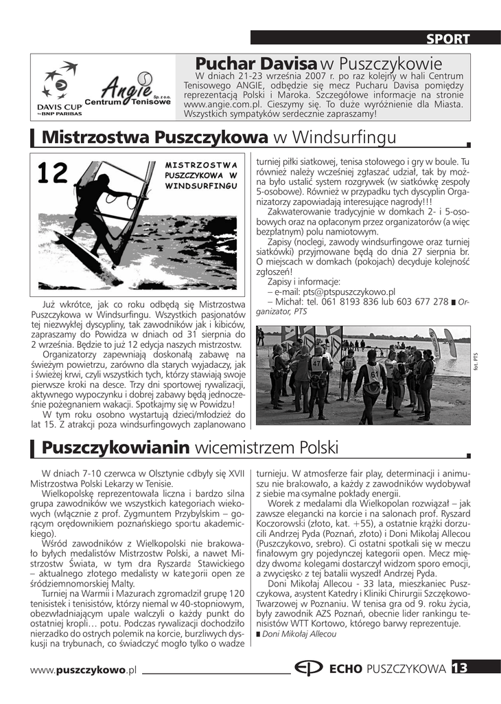 SPORT Puchar Davisa w Puszczykowie W dniach 21-23 września 2007 r. po raz kolejny w hali Centrum Tenisowego ANGIE, odbędzie się mecz Pucharu Davisa pomiędzy reprezentacją Polski i Maroka. Szczegółowe informacje na stronie www.angie.com.pl. Cieszymy się. To duże wyróżnienie dla Miasta. Wszystkich sympatyków serdecznie zapraszamy! Mistrzostwa Puszczykowa w Windsurfingu ganizator, PTS fot. PTS Już wkrótce, jak co roku odbędą się Mistrzostwa Puszczykowa w Windsurfingu. Wszystkich pasjonatów tej niezwykłej dyscypliny, tak zawodników jak i kibiców, zapraszamy do Powidza w dniach od 31 sierpnia do 2 września. Będzie to już 12 edycja naszych mistrzostw. Organizatorzy zapewniają doskonałą zabawę na świeżym powietrzu, zarówno dla starych wyjadaczy, jak i świeżej krwi, czyli wszystkich tych, którzy stawiają swoje pierwsze kroki na desce. Trzy dni sportowej rywalizacji, aktywnego wypoczynku i dobrej zabawy będą jednocześnie pożegnaniem wakacji. Spotkajmy się w Powidzu! W tym roku osobno wystartują dzieci/młodzież do lat 15. Z atrakcji poza windsurfingowych zaplanowano turniej piłki siatkowej, tenisa stołowego i gry w boule. Tu również należy wcześniej zgłaszać udział, tak by można było ustalić system rozgrywek (w siatkówkę zespoły 5-osobowe). Również w przypadku tych dyscyplin Organizatorzy zapowiadają interesujące nagrody!!! Zakwaterowanie tradycyjnie w domkach 2- i 5-osobowych oraz na opłaconym przez organizatorów (a więc bezpłatnym) polu namiotowym. Zapisy (noclegi, zawody windsurfingowe oraz turniej siatkówki) przyjmowane będą do dnia 27 sierpnia br. O miejscach w domkach (pokojach) decyduje kolejność zgłoszeń! Zapisy i informacje: – e-mail: [email protected] – Michał: tel. 061 8193 836 lub 603 677 278 Or- Puszczykowianin wicemistrzem Polski W dniach 7-10 czerwca w Olsztynie odbyły się XVII Mistrzostwa Polski Lekarzy w Tenisie. Wielkopolskę reprezentowała liczna i bardzo silna grupa zawodników we wszystkich kategoriach wiekowych (włącznie z prof. Zygmuntem Przybylskim – gorącym orędownikiem poznańskiego sportu akademickiego). Wśród zawodników z Wielkopolski nie brakowało byłych medalistów Mistrzostw Polski, a nawet Mistrzostw Świata, w tym dra Ryszarda Stawickiego – aktualnego złotego medalisty w kategorii open ze śródziemnomorskiej Malty. Turniej na Warmii i Mazurach zgromadził grupę 120 tenisistek i tenisistów, którzy niemal w 40-stopniowym, obezwładniającym upale walczyli o każdy punkt do ostatniej kropli… potu. Podczas rywalizacji dochodziło nierzadko do ostrych polemik na korcie, burzliwych dyskusji na trybunach, co świadczyć mogło tylko o wadze www.puszczykowo.pl turnieju. W atmosferze fair play, determinacji i animuszu nie brakowało, a każdy z zawodników wydobywał z siebie maksymalne pokłady energii. Worek z medalami dla Wielkopolan rozwiązał – jak zawsze elegancki na korcie i na salonach prof. Ryszard Koczorowski (złoto, kat. +55), a ostatnie krążki dorzucili Andrzej Pyda (Poznań, złoto) i Doni Mikołaj Allecou (Puszczykowo, srebro). Ci ostatni spotkali się w meczu finałowym gry pojedynczej kategorii open. Mecz między dwoma kolegami dostarczył widzom sporo emocji, a zwycięsko z tej batalii wyszedł Andrzej Pyda. Doni Mikołaj Allecou - 33 lata, mieszkaniec Puszczykowa, asystent Katedry i Kliniki Chirurgii SzczękowoTwarzowej w Poznaniu. W tenisa gra od 9. roku życia, były zawodnik AZS Poznań, obecnie lider rankingu tenisistów WTT Kortowo, którego barwy reprezentuje. Doni Mikołaj Allecou ECHO PUSZCZYKOWA 13