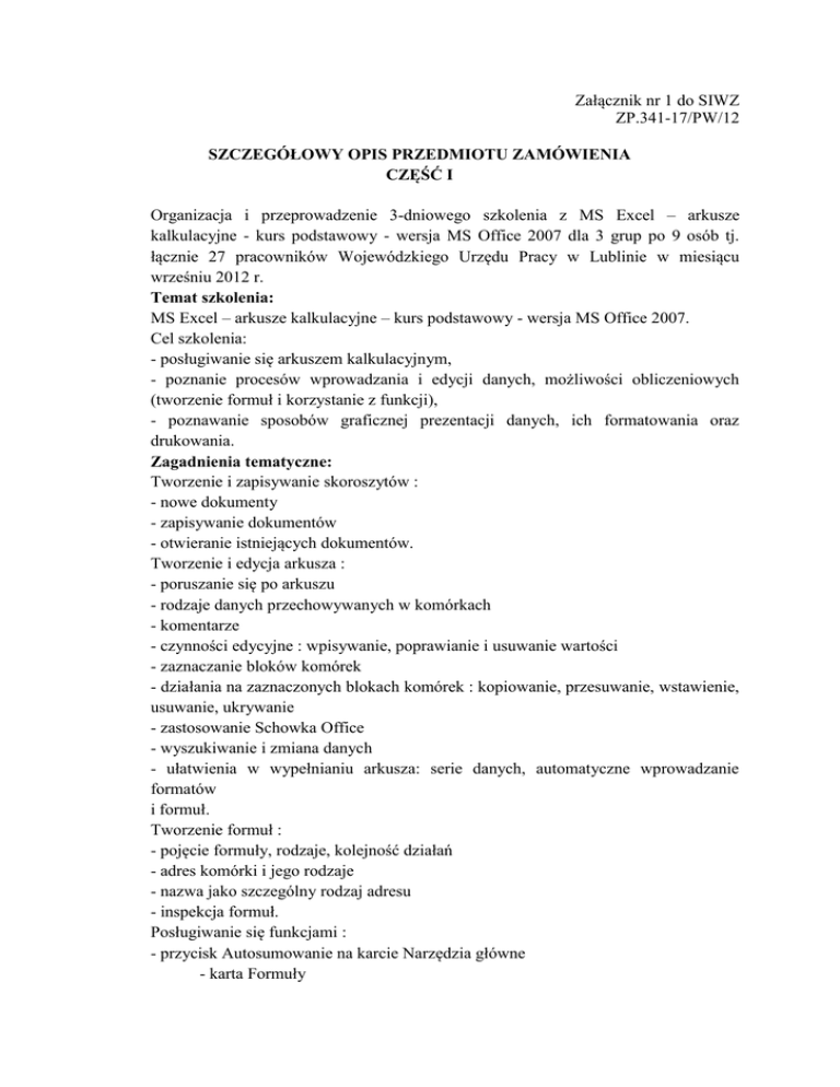 Załącznik nr 1 do SIWZ ZP.341-17/PW/12 SZCZEGÓŁOWY OPIS PRZEDMIOTU ZAMÓWIENIA CZĘŚĆ I Organizacja i przeprowadzenie 3-dniowego szkolenia z MS Excel – arkusze kalkulacyjne - kurs podstawowy - wersja MS Office 2007 dla 3 grup po 9 osób tj. łącznie 27 pracowników Wojewódzkiego Urzędu Pracy w Lublinie w miesiącu wrześniu 2012 r. Temat szkolenia: MS Excel – arkusze kalkulacyjne – kurs podstawowy - wersja MS Office 2007. Cel szkolenia: - posługiwanie się arkuszem kalkulacyjnym, - poznanie procesów wprowadzania i edycji danych, możliwości obliczeniowych (tworzenie formuł i korzystanie z funkcji), - poznawanie sposobów graficznej prezentacji danych, ich formatowania oraz drukowania. Zagadnienia tematyczne: Tworzenie i zapisywanie skoroszytów : - nowe dokumenty - zapisywanie dokumentów - otwieranie istniejących dokumentów. Tworzenie i edycja arkusza : - poruszanie się po arkuszu - rodzaje danych przechowywanych w komórkach - komentarze - czynności edycyjne : wpisywanie, poprawianie i usuwanie wartości - zaznaczanie bloków komórek - działania na zaznaczonych blokach komórek : kopiowanie, przesuwanie, wstawienie, usuwanie, ukrywanie - zastosowanie Schowka Office - wyszukiwanie i zmiana danych - ułatwienia w wypełnianiu arkusza: serie danych, automatyczne wprowadzanie formatów i formuł. Tworzenie formuł : - pojęcie formuły, rodzaje, kolejność działań - adres komórki i jego rodzaje - nazwa jako szczególny rodzaj adresu - inspekcja formuł. Posługiwanie się funkcjami : - przycisk Autosumowanie na karcie Narzędzia główne - karta Formuły - edycja funkcji - przykłady zastosowania funkcji. Formatowanie komórek : - czcionka, kolor tekstu i wypełnienia, obramowanie - rozmieszczenie tekstu w komórce - podstawowe formaty liczbowe - formatowanie przycisków stylów - malarz formatów - podstawy formatowania warunkowego. Formatowanie arkusz i skoroszytu : - rozmiar i orientacja strony, marginesy - niestandardowy podział arkusza na strony - nagłówki i stopki - motywy. Działania na arkuszach : - zaznaczanie arkuszy - menu podręczne arkuszy - dodawanie usuwanie arkuszy - zmiana nazwy i koloru arkusza - kopiowanie i przenoszenie w obrębie tego samego skoroszytu. Podstawy tworzenia wykresów : - typy wykresów - przygotowywanie danych - przycisk Wykresy. Drukowanie : - sposoby drukowania - opcje drukowania. Podstawy tabel : - zasady tworzenia - przekształcanie zakresu danych w tabelę - karta Projektowanie - proste sortowanie - podstawy filtrowania. Organizacja pracy : - dostosowanie paska Szybki i dostęp, Wstążki i paska stanu - podział i blokowanie okna - praca z kilkoma skoroszytami. Miejsce szkolenia : Lublin. Harmonogram: Rozpoczęcie szkolenia pierwszego, drugiego i trzeciego dnia o godz. 8:00, prowadzenie każdego dnia szkolenia przez 8 godzin (1 godz. szkoleniowa = 45 min.); zakończenie pierwszego, drugiego i trzeciego dnia o godz. 15:00, z uwzględnieniem 3 2 Załącznik nr 1 do SIWZ ZP.341-17/PW/12 przerw kawowych w trakcie dnia szkoleniowego dla wszystkich uczestników szkolenia. Serwis kawowy: (kawa, herbata, mleko do kawy), woda mineralna, napoje - soki, ciastka (trzy dni, uzupełniany na bieżąco). Wykładowca: - spełniający wymagania opisane w SIWZ W ramach realizacji szkolenia Wykonawca zapewni: - salę szkoleniową przystosowaną do prowadzenia zajęć dydaktycznych wyposażoną w rzutnik multimedialny, projektor, ekran oraz 9 stanowisk komputerowych z siecią wewnętrzną dla każdego szkolonego pracownika, - warunki pracy osób szkolących się w trakcie trwania szkolenia zgodne z przepisami bezpieczeństwa i higieny pracy, - swobodny dostęp do sanitariatów, - wystarczającą liczbę własnych licencji na oprogramowanie wykorzystywane przy realizacji szkolenia, - zastępczą infrastrukturę informatyczną dla szkoleń komputerowych w przypadku awarii sprzętu, - przekazanie wszystkim uczestnikom szkolenia materiałów szkoleniowych odpowiadających zakresowi merytorycznemu szkolenia w postaci skryptów umożliwiających samodzielną naukę i materiały piśmiennicze (długopis, ołówek i notatnik), - certyfikat potwierdzający uczestnictwo w szkoleniu dla każdej osoby biorącej udział w szkoleniu. 3 Załącznik nr 1 do SIWZ ZP.341-17/PW/12