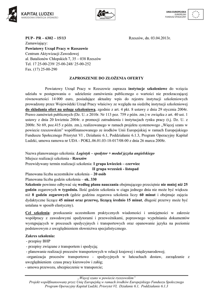 PUP– PR – 6302 – 15/13 Zamawiający: Powiatowy Urząd Pracy w Rzeszowie Centrum Aktywizacji Zawodowej al. Batalionów Chłopskich 7, 35 – 038 Rzeszów Tel. 17 25-00-239/ 25-00-248/ 25-00-252 Fax. (17) 25-00-290 Rzeszów, dn. 03.04.2013r. ZAPROSZENIE DO ZŁOŻENIA OFERTY Powiatowy Urząd Pracy w Rzeszowie zaprasza instytucje szkoleniowe do wzięcia udziału w postępowaniu o udzielenie zamówienia publicznego o wartości nie przekraczającej równowartości 14 000 euro, posiadające aktualny wpis do rejestru instytucji szkoleniowych prowadzony przez Wojewódzki Urząd Pracy właściwy ze względu na siedzibę instytucji szkoleniowej do składania ofert na usługę szkoleniową, zgodnie z art. 4 pkt. 8 ustawy z dnia 29 stycznia 2004r. Prawo zamówień publicznych (Dz. U. z 2010r. Nr 113 poz. 759 z późn. zm.) w związku z art. 40 ust. 1 ustawy z dnia 20 kwietnia 2004r. o promocji zatrudnienia i instytucjach rynku pracy (t.j. Dz. U. z 2008r. Nr 69, poz.415 z późn. zm.), realizowanego w ramach projektu systemowego „Więcej szans w powiecie rzeszowskim” współfinansowanego ze środków Unii Europejskiej w ramach Europejskiego Funduszu Społecznego Priorytet VI , Działanie 6.1, Poddziałanie 6.1.3, Program Operacyjny Kapitał Ludzki, umowa ramowa nr UDA - POKL.06.01.03-18-017/08-00 z dnia 26 marca 2008r. Nazwa planowanego szkolenia: Logistyk – spedytor + moduł języka angielskiego Miejsce realizacji szkolenia - Rzeszów Przewidywany termin realizacji szkolenia: I grupa kwiecień – czerwiec II grupa wrzesień - listopad Planowana liczba uczestników szkolenia – 20 osób Planowana liczba godzin szkolenia – ok. 330 Szkolenie powinno odbywać się według planu nauczania obejmującego przeciętnie nie mniej niż 25 godzin zegarowych w tygodniu. Ilość godzin szkolenia w ciągu jednego dnia nie może być większa niż 8 godzin zegarowych (gdzie godzina zegarowa szkolenia liczy 60 minut i obejmuje zajęcia dydaktyczne liczące 45 minut oraz przerwę, liczącą średnio 15 minut, długość przerwy może być ustalana w sposób elastyczny). Cel szkolenia: przekazanie uczestnikom praktycznych wiadomości i umiejętności w zakresie współpracy z zawodowymi spedytorami i przewoźnikami, poprawnego wypełniania dokumentów występujących w procesach spedycyjnych i transportowych oraz opanowanie języka na poziomie podstawowym z uwzględnieniem słownictwa specjalistycznego. Zakres szkolenia: - przepisy BHP - przepisy związane z transportem i spedycją; - planowanie realizacji procesów transportowych w relacji krajowej i międzynarodowej; -organizacja procesów transportowo - spedycyjnych w łańcuchach dostaw, zarządzanie z uwzględnieniem czasu pracy kierowców i załóg; - umowa przewozu, ubezpieczenie w transporcie; „Więcej szans w powiecie rzeszowskim” Projekt współfinansowany przez Unię Europejską w ramach środków Europejskiego Funduszu Społecznego Program Operacyjny Kapitał Ludzki, Priorytet VI, Działanie 6.1, Poddziałanie 6.1.3 - narzędzia informatyczne w logistyce i spedycji; - standardy identyfikacji ładunków w procesach przewozowych; - elektroniczne platformy logistyczne; - moduł języka angielskiego (ok.100 h); - 1 tygodniowa praktyka u pracodawców ( maksymalnie 3 osoby u jednego pracodawcy; proponowana liczba godzin – 6 godzin dziennie) Ofertę szkoleniową wraz z zaakceptowanym wzorem umowy o świadczenie usług należy dostarczyć Zamawiającemu do dnia: 10.04.2013r. (pocztą/faxem/osobiście/e-mail) wyłącznie na załączonych wzorach formularzy: 1. Formularz szkoleniowy 2. Program szkolenia 3. Umowa o świadczenie usług 4. Harmonogram 5. Zaświadczenie Informujemy, iż złożenie oferty szkoleniowej nie będzie wiązało stron. W trakcie oceny oferty szkoleniowej Urząd Pracy może zwracać się do instytucji szkoleniowej o dodatkowe informacje niezbędne przy dokonywaniu oceny. Dodatkowe informacje można uzyskać: osobiście: Centrum Aktywizacji Zawodowej al. Batalionów Chłopskich 7, 35 – 038 Rzeszów e – mailem : Agata Hajduk-Bieleń (17 25-00-252) [email protected] Ewa Wilk (17 25-00-239) [email protected] „Więcej szans w powiecie rzeszowskim” Projekt współfinansowany przez Unię Europejską w ramach środków Europejskiego Funduszu Społecznego Program Operacyjny Kapitał Ludzki, Priorytet VI, Działanie 6.1, Poddziałanie 6.1.3