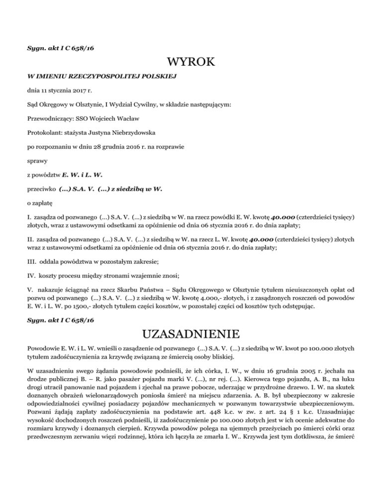 Sygn. akt I C 658/16 WYROK W IMIENIU RZECZYPOSPOLITEJ POLSKIEJ dnia 11 stycznia 2017 r. Sąd Okręgowy w Olsztynie, I Wydział Cywilny, w składzie następującym: Przewodniczący: SSO Wojciech Wacław Protokolant: stażysta Justyna Niebrzydowska po rozpoznaniu w dniu 28 grudnia 2016 r. na rozprawie sprawy z powództw E. W. i L. W. przeciwko (...) S.A. V. (...) z siedzibą w W. o zapłatę I. zasądza od pozwanego (...) S.A. V. (...) z siedzibą w W. na rzecz powódki E. W. kwotę 40.000 (czterdzieści tysięcy) złotych, wraz z ustawowymi odsetkami za opóźnienie od dnia 06 stycznia 2016 r. do dnia zapłaty; II. zasądza od pozwanego (...) S.A. V. (...) z siedzibą w W. na rzecz L. W. kwotę 40.000 (czterdzieści tysięcy) złotych wraz z ustawowymi odsetkami za opóźnienie od dnia 06 stycznia 2016 r. do dnia zapłaty; III. oddala powództwa w pozostałym zakresie; IV. koszty procesu między stronami wzajemnie znosi; V. nakazuje ściągnąć na rzecz Skarbu Państwa – Sądu Okręgowego w Olsztynie tytułem nieuiszczonych opłat od pozwu od pozwanego (...) S.A. V. (...) z siedzibą w W. kwotę 4.000,- złotych, i z zasądzonych roszczeń od powodów E. W. i L. W. po 1500,- złotych tytułem części kosztów, w pozostałej części od kosztów tych odstępując. Sygn. akt I C 658/16 UZASADNIENIE Powodowie E. W. i L. W. wnieśli o zasądzenie od pozwanego (...) S.A. V. (...) z siedzibą w W. kwot po 100.000 złotych tytułem zadośćuczynienia za krzywdę związaną ze śmiercią osoby bliskiej. W uzasadnieniu swego żądania powodowie podnieśli, że ich córka, I. W., w dniu 16 grudnia 2005 r. jechała na drodze publicznej B. – R. jako pasażer pojazdu marki V. (...), nr rej. (...). Kierowca tego pojazdu, A. B., na łuku drogi utracił panowanie nad pojazdem i zjechał na prawe pobocze, uderzając w przydrożne drzewo. I. W. na skutek doznanych obrażeń wielonarządowych poniosła śmierć na miejscu zdarzenia. A. B. był ubezpieczony w zakresie odpowiedzialności cywilnej posiadaczy pojazdów mechanicznych w pozwanym towarzystwie ubezpieczeniowym. Pozwani żądają zapłaty zadośćuczynienia na podstawie art. 448 k.c. w zw. z art. 24 § 1 k.c. Uzasadniając wysokość dochodzonych roszczeń podnieśli, iż zadośćuczynienie po 100.000 złotych jest w ich ocenie adekwatne do rozmiaru krzywdy i doznanych cierpień. Krzywda powodów polega na ujemnych przeżyciach po śmierci córki oraz przedwczesnym zerwaniu więzi rodzinnej, która ich łączyła ze zmarła I. W.. Krzywda jest tym dotkliwsza, że śmierć dotknęła młodą, zaledwie 21 letnią, w pełni zdrową dziewczynę. W chwili zdarzenia córka powodów była zaręczona i planowała założenie własnej rodziny. Wymieniona rozwijała się zawodowo, aby pomagać finansowo swoim rodzicom. W odpowiedzi na pozew z dnia 16 grudnia 2016 r. pozwany (...) S.A. V. (...) z siedzibą w W. wniósł o oddalenie obu powództw w całości i zasądzenie na swoją rzecz kosztów procesu od każdego z powodów według norm przepisanych. Pozwany podniósł, że w toku postępowania likwidacyjnego zawarł z powodami ugodę, na mocy której przyznał im odszkodowanie za pogorszenie się ich sytuacji życiowej na skutek śmierci córki, w kwotach po 12.500 złotych. Strony ugody oświadczyły, że odszkodowanie to zaspokaja roszczenia powodów obecne jak i mogące powstać w przyszłości jako następstwa tego wypadku, wobec czego zrzekli się oni wszelkich dalszych roszczeń z tego tytułu tak w stosunku do sprawcy, jak i jego ubezpieczyciela. Pozwany ocenił zgłoszone roszczenie jako całkowicie bezzasadne, podnosząc, że więzi duchowe i emocjonalne z osobą bliską nie należą do katalogu dóbr osobistych określonego w art. 23 k.c. Nadto powodowie nie wskazali i nie opisali zakresu cierpień, który rzutowałby na wysokość wypłaconego zadośćuczynienia. Nie wykazali trwałości i intensywności, a także treści łączących ich z I. W. relacji. Dodatkowo od śmierci poszkodowanej minęło ponad 11 lat, co w sposób istotny wpływa na osłabienie ujemnych doznań związanych ze śmiercią osoby bliskiej. Niezależnie od powyższego pozwany określił dochodzone roszczenia jako wygórowane. Sąd ustalił następujący stan faktyczny: W dniu 16 grudnia 2015 r. I. W. jechała na drodze publicznej B. – R., gm. L., jako pasażer pojazdu marki V. (...), nr rej. (...). Poza powódką w pojeździe znajdowali się kierujący nim A. B., oraz pasażerowie M. W. (1) i P. M.. Powódka zajmowała miejsce z tyłu za fotelem kierowcy. Jadąc z nadmierną prędkością na łuku drogi A. B. utracił panowanie nad pojazdem, po czym zjechał na prawe pobocze, uderzając w przydrożne drzewo. W wyniku rozległych obrażeń czaszkowo-mózgowych śmierć na miejscu poniosła pasażerka I. W.. (dowód: wyrok S. R.w O.z dnia 06 października 2014 r., sygn. akt (...), k. (...)) Kierujący pojazdem marki V. (...), nr rej. (...), A. B., w chwili wypadku był ubezpieczony w zakresie odpowiedzialności cywilnej posiadaczy pojazdów mechanicznych w pozwanym (...) S.A. V. (...) z siedzibą w W.. (bezsporne, polisa OC, k.(...)) Prawomocnym wyrokiem S. R.w O. z dnia 06 lipca 2006 r., sygn. akt (...)A. B. został skazany za popełnienie przestępstwa z art. 177 § 2 k.k. w zb. z art. 177 § 1 k.k. w zw. z art. 11 § 2 k.k., za co wymierzono mu karę 2 lat pozbawienia wolności z warunkowym zawieszeniem wykonania na okres lat 5. (dowód: wyrok S. R.w O. z dnia 06.07.2006 r., sygn. akt(...), k. (...), wyrok S. O. w O. z dnia 19.10.2006 r., sygn. akt (...), k. (...)) W okresie przed wypadkiem I. W. zamieszkiwała wspólnie z rodzicami i swoimi siostrami w miejscowości Z., gm. L.. Wymieniona była w tym czasie zaręczona i planowała założenie swojej rodziny. Pracowała w S. R.w L. W., początkowo jako stażystka, następnie w ramach umowy zlecenia, a od 02 maja 2005 r. - umowy o pracę. W wolnych chwilach zajmowała się czytaniem książek. (dowód: zeznania A. 