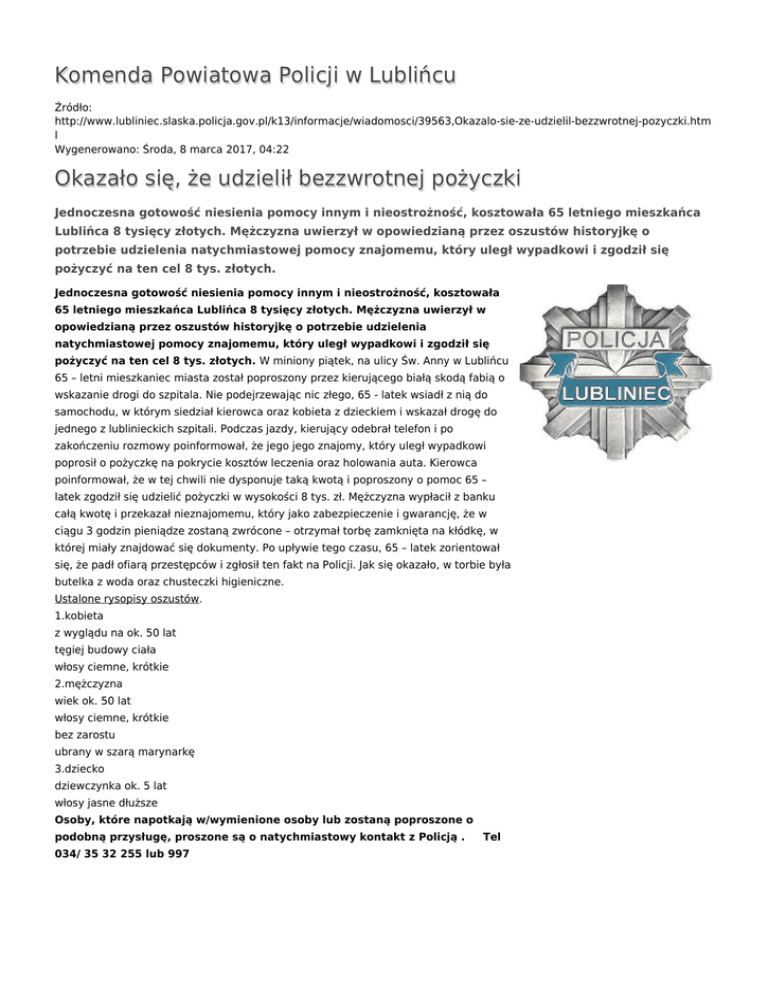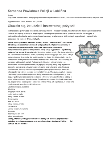 Komenda Powiatowa Policji w Lublińcu Źródło: http://www.lubliniec.slaska.policja.gov.pl/k13/informacje/wiadomosci/39563,Okazalo-sie-ze-udzielil-bezzwrotnej-pozyczki.htm l Wygenerowano: Środa, 8 marca 2017, 04:22 Okazało się, że udzielił bezzwrotnej pożyczki Jednoczesna gotowość niesienia pomocy innym i nieostrożność, kosztowała 65 letniego mieszkańca Lublińca 8 tysięcy złotych. Mężczyzna uwierzył w opowiedzianą przez oszustów historyjkę o potrzebie udzielenia natychmiastowej pomocy znajomemu, który uległ wypadkowi i zgodził się pożyczyć na ten cel 8 tys. złotych. Jednoczesna gotowość niesienia pomocy innym i nieostrożność, kosztowała 65 letniego mieszkańca Lublińca 8 tysięcy złotych. Mężczyzna uwierzył w opowiedzianą przez oszustów historyjkę o potrzebie udzielenia natychmiastowej pomocy znajomemu, który uległ wypadkowi i zgodził się pożyczyć na ten cel 8 tys. złotych. W miniony piątek, na ulicy Św. Anny w Lublińcu 65 – letni mieszkaniec miasta został poproszony przez kierującego białą skodą fabią o wskazanie drogi do szpitala. Nie podejrzewając nic złego, 65 - latek wsiadł z nią do samochodu, w którym siedział kierowca oraz kobieta z dzieckiem i wskazał drogę do jednego z lublinieckich szpitali. Podczas jazdy, kierujący odebrał telefon i po zakończeniu rozmowy poinformował, że jego jego znajomy, który uległ wypadkowi poprosił o pożyczkę na pokrycie kosztów leczenia oraz holowania auta. Kierowca poinformował, że w tej chwili nie dysponuje taką kwotą i poproszony o pomoc 65 – latek zgodził się udzielić pożyczki w wysokości 8 tys. zł. Mężczyzna wypłacił z banku całą kwotę i przekazał nieznajomemu, który jako zabezpieczenie i gwarancję, że w ciągu 3 godzin pieniądze zostaną zwrócone – otrzymał torbę zamknięta na kłódkę, w której miały znajdować się dokumenty. Po upływie tego czasu, 65 – latek zorientował się, że padł ofiarą przestępców i zgłosił ten fakt na Policji. Jak się okazało, w torbie była butelka z woda oraz chusteczki higieniczne. Ustalone rysopisy oszustów. 1.kobieta z wyglądu na ok. 50 lat tęgiej budowy ciała włosy ciemne, krótkie 2.mężczyzna wiek ok. 50 lat włosy ciemne, krótkie bez zarostu ubrany w szarą marynarkę 3.dziecko dziewczynka ok. 5 lat włosy jasne dłuższe Osoby, które napotkają w/wymienione osoby lub zostaną poproszone o podobną przysługę, proszone są o natychmiastowy kontakt z Policją . 034/ 35 32 255 lub 997 Tel Ocena: 0/5 (0) Tweetnij