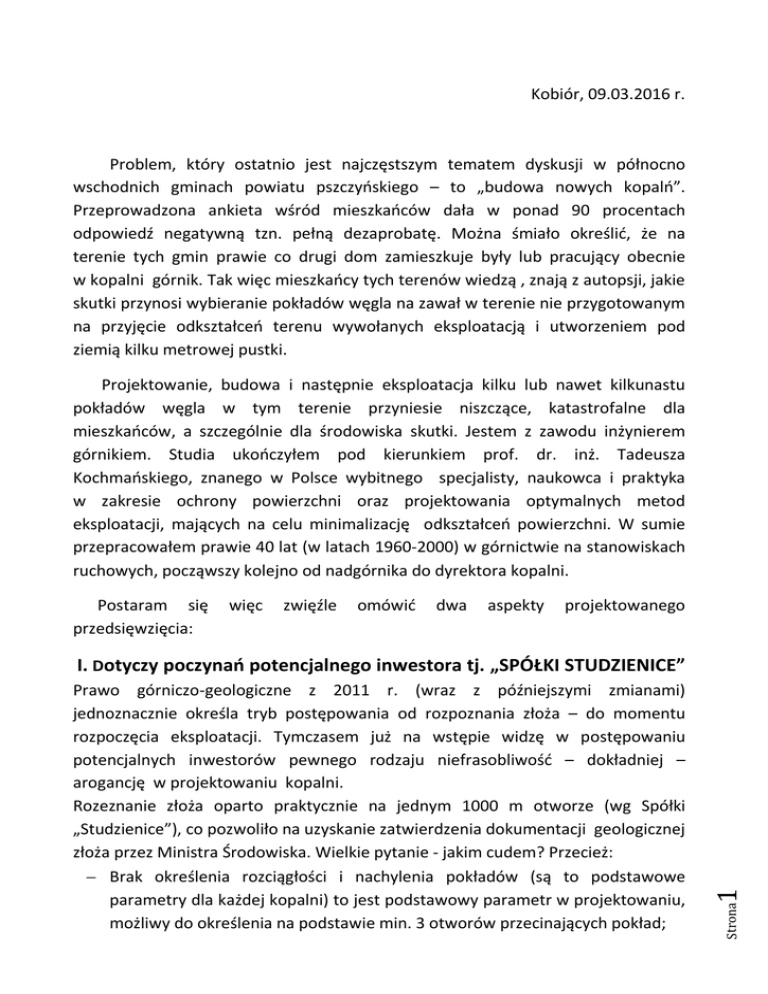 Kobiór, 09.03.2016 r. Problem, który ostatnio jest najczęstszym tematem dyskusji w północno wschodnich gminach powiatu pszczyńskiego – to „budowa nowych kopalń”. Przeprowadzona ankieta wśród mieszkańców dała w ponad 90 procentach odpowiedź negatywną tzn. pełną dezaprobatę. Można śmiało określić, że na terenie tych gmin prawie co drugi dom zamieszkuje były lub pracujący obecnie w kopalni górnik. Tak więc mieszkańcy tych terenów wiedzą , znają z autopsji, jakie skutki przynosi wybieranie pokładów węgla na zawał w terenie nie przygotowanym na przyjęcie odkształceń terenu wywołanych eksploatacją i utworzeniem pod ziemią kilku metrowej pustki. Projektowanie, budowa i następnie eksploatacja kilku lub nawet kilkunastu pokładów węgla w tym terenie przyniesie niszczące, katastrofalne dla mieszkańców, a szczególnie dla środowiska skutki. Jestem z zawodu inżynierem górnikiem. Studia ukończyłem pod kierunkiem prof. dr. inż. Tadeusza Kochmańskiego, znanego w Polsce wybitnego specjalisty, naukowca i praktyka w zakresie ochrony powierzchni oraz projektowania optymalnych metod eksploatacji, mających na celu minimalizację odkształceń powierzchni. W sumie przepracowałem prawie 40 lat (w latach 1960-2000) w górnictwie na stanowiskach ruchowych, począwszy kolejno od nadgórnika do dyrektora kopalni. Postaram się przedsięwzięcia: więc zwięźle omówić dwa aspekty projektowanego Strona Prawo górniczo-geologiczne z 2011 r. (wraz z późniejszymi zmianami) jednoznacznie określa tryb postępowania od rozpoznania złoża – do momentu rozpoczęcia eksploatacji. Tymczasem już na wstępie widzę w postępowaniu potencjalnych inwestorów pewnego rodzaju niefrasobliwość – dokładniej – arogancję w projektowaniu kopalni. Rozeznanie złoża oparto praktycznie na jednym 1000 m otworze (wg Spółki „Studzienice”), co pozwoliło na uzyskanie zatwierdzenia dokumentacji geologicznej złoża przez Ministra Środowiska. Wielkie pytanie - jakim cudem? Przecież: Brak określenia rozciągłości i nachylenia pokładów (są to podstawowe parametry dla każdej kopalni) to jest podstawowy parametr w projektowaniu, możliwy do określenia na podstawie min. 3 otworów przecinających pokład; 1 I. Dotyczy poczynań potencjalnego inwestora tj. „SPÓŁKI STUDZIENICE” 2 Strona Sąsiadowanie z jedyną, graniczącą w tym terenie kopalnią „CZECZOTT” (budowa nowej kopalni w sąsiedztwie czynnego sąsiada jest odpowiedzią czy warto, lub jak nie popełniać jego błędów?) wręcz dyskredytuje budowę obok nowej kopalni – bowiem kopalnia ta zbudowana z wielkim rozmachem w latach 80-tych musiała zaniechać wydobycia z powodu niedostatecznego rozeznania złoża, źle opracowanej dokumentacji geologicznej, co później podczas wydobycia było ciągłym odkrywaniem zaburzeń geologicznych, niezliczonych uskoków o bardzo dużych zrzutach trudnych do sforsowania. Niedostatki dokumentacji geologicznej spowodowały nawet bardzo poważne błędy w projektowaniu rozcięcia kopalni - nie tylko koszty, a głównie błędy projektowe zaważyły o jej likwidacji. Znam ten temat z autopsji, oglądałem to własnymi oczami – jako pracownik JMGPW. Spółka „Studzienice” ten bardzo istotny , nawet podstawowy, wskaźnik w projektowaniu zupełnie zignorowała. Nigdy w projektowaniu nowej kopalni nie wolno „a priori” zakładać metody kierowania stropem. Tą metodę determinują bowiem warunki górniczogeologiczne, hydrogeologiczne i ekonomiczne, tj. przewidywane koszty wydobycia, technologia urabiania, a przede wszystkim skutki tej eksploatacji na powierzchni dla ludzi zamieszkujących nad nią i w pobliżu niej (zasięg wpływów i szkód dochodzi nawet do kilku kilometrów poza jej granicami) oraz przyrody, którą cenimy jako dobro najwyższe. W dzisiejszych czasach tego typu zamierzenia powinny być wyprzedzane „raportem oddziaływania inwestycji na środowisko”. Dopóki tego raportu nie ma, nie wolno mówić o budowaniu kopalni i straszyć nią społeczeństwo, które masowo przenosi swój byt na te tereny z walącego się Bytomia, Chorzowa, Katowic i Tychów. W samym Kobiórze w ostatnich latach wybudowano kilkaset nowych domów (bez zabezpieczeń prewencyjnych), z przekonaniem, że nie wystąpią tu nigdy szkody górnicze, a ich dzieci będą oddychać powietrzem pachnącym lasami kobiórskimi. Podobny proces ma miejsce we wszystkich miejscowościach okalających południowo –wschodnie obrzeże lasów kobiórskich – szczególnie dotyczy to Studzienic, Kobióra, Świerczyńca, Jankowic, Jankowic Osady, Międzyrzecza, Nowych Bojszów, Bojszów a nawet Frydka, Gilowic, Bierunia i Tychów. Podobny proces widać po południowo-zachodniej stronie lasów kobiórskich, tj. w okolicy Suszca. Założenie wydobycia 10 000 ton/dobę (3 mln ton rocznie) z jednej ściany, przy dzisiejszych technologiach jest jak najbardziej realne. Przy wydobyciu z pokładu o miąższości 2,5 m, w rzucie pionowym na powierzchnię, powstanie lej o powierzchni prawie 100 ha i głębokości 2,0 m. W rzeczywistości nigdy ten lej nie jest pionowy, zawsze „rozlewa” się na wszystkie strony z malejącą głębokością na odległość nawet do kilku kilometrów poza granice eksploatacji. Dla przykładu - dobowy postęp frontu o dł. 400 m (2 ściany) wyniesie około 7,5 m – tj. około 2,3 km w ciągu roku. Strona W moim rozważaniu nie mogę pominąć zagrożeń naturalnych tak lekko pominiętych w założeniach projektowych. Udostępnienie złoża z powierzchni dwoma upadowymi, o długości ok. 1,3 km każda, stwarza generalnie wydobywanie podpoziomowe, które obarczone jest w naszych przepisach surowymi rygorami dot. wentylacji, zagrożenia pożarowego, metanowego, w ogóle bezpieczeństwa załogi. Samo wykonanie upadowych w nieznanym górotworze jest z dużym znakiem zapytania – np. likwidacja kurzawek. W czasie eksploatacji jedna z nich będzie wyłączona