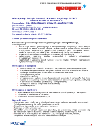 Oferta pracy: Zarządu Geodezji i Katastru Miejskiego GEOPOZ 61-655 Poznań ul. Gronowa 20 Stanowisko: ds. aktualizacji danych graficznych Wymiar etatu : pełny Forma nawiązania stosunku pracy: umowa o pracę Nr ref. ZG-ZKS.11000.5.2015 Publikacja: 10.07.2015 r. Termin składania ofert: 20.07.2015 r. Zakres podstawowych czynności Prowadzenie państwowego zasobu geodezyjnego i kartograficznego, w szczególności: • aktualizacja zasobu geodezyjnego i kartograficznego obejmująca bazy danych wchodzące w skład zbiorów danych przestrzennych infrastruktury informacji przestrzennej dotyczących: geodezyjnej ewidencji sieci uzbrojenia terenu, obiektów topograficznych BDOT500, szczegółowych osnów geodezyjnych, • prowadzenie metadanych w zakresie prowadzonych baz danych, • wykonywanie raportów, analiz, sprawozdań i statystyk dotyczących prowadzonych baz danych, • współudział w ustalaniu zasad wymiany danych między MODGiK i jednostkami wykonawstwa geodezyjnego. Wymagania niezbędne • • • • • • • pełna zdolność do czynności prawnych i korzystanie z pełni praw publicznych brak skazania prawomocnym wyrokiem sądu za umyślne przestępstwo ścigane z oskarŜenia publicznego lub umyślne przestępstwo skarbowe nieposzlakowana opinia obywatelstwo polskie wykształcenie wyŜsze kierunek/specjalność geodezja i kartografia lub inne wyŜsze z co najmniej rocznym doświadczeniem zawodowym (praca, praktyka) w ośrodku dokumentacji geodezyjnej i kartograficznej, umiejętność obsługi komputera (Pakiet Office), komunikatywność Wymagania dodatkowe • • • wykształcenie wyŜsze magisterskie kierunek/specjalność geodezja i kartografia uprawnienia zawodowe w zakresie 1 znajomość ustawy Prawo geodezyjne Warunki pracy • Stanowisko pracy mieści się w wielokondygnacyjnym budynku wyposaŜonym w windy (windy przystosowane dla osób niepełnosprawnych). • Oświetlenie stanowiska pracy naturalne i sztuczne • Przewaga wysiłku umysłowego • Charakter wykonywanych czynności powoduje, Ŝe pracownicy mogą poruszać się po wszystkich piętrach budynku, a takŜe załatwiać sprawy słuŜbowe poza nim • Podczas pracy wykorzystuje się komputer LCD, obsługuje drukarkę, telefon, urządzenia wielofunkcyjne, korzysta z materiałów biurowych Informacje dodatkowe Wskaźnik zatrudnienie osób niepełnosprawnych w naszej jednostce, w rozumieniu rehabilitacji zawodowej i społecznej oraz zatrudnianiu osób niepełnosprawnych, poprzedzającym datę upublicznienia ogłoszenia jest niŜszy niŜ 6%. Pierwszeństwo w zatrudnieniu przysługuje osobie niepełnosprawnej o ile znajdzie się więcej niŜ pięciu najlepszych kandydatów spełniających wymagania niezbędne oraz w stopniu spełniających wymagania dodatkowe. przepisów o w miesiącu w gronie nie największym Wymagane dokumenty Zachęcamy do skorzystania z wniosku on-line i przesyłania dokumentów aplikacyjnych drogą elektroniczną. 1. W przypadku aplikacji elektronicznej wymagane dokumenty: • • informacje obejmujące Ŝyciorys, list motywacyjny i wymagane oświadczenia formularz dostępny przy ogłoszeniu kopie świadectw pracy/dokumentów potwierdzających doświadczenie zawodowe oraz kopie dokumentów potwierdzających wykształcenie i kwalifikacje wymagane na stanowisku pracy, o ile nie zostaną dołączone do formularza jako załączniki prosimy przedstawić na rozmowie kwalifikacyjnej. 2. Dopuszcza się moŜliwość przesyłania dokumentów tradycyjną pocztą lub składania w Sali Obsługi Klienta ZGiKM GEOPOZ W przypadku aplikacji drogą tradycyjną kandydat jest zobowiązany złoŜyć następujące dokumenty: • • List motywacyjny, CV, oświadczenie o pełnej zdolności do czynności prawnych i korzystaniu z pełni praw publicznych, oświadczenie o niekaralności za umyślne przestępstwo ścigane z oskarŜenia publicznego lub umyślne przestępstwo skarbowe a takŜe oświadczenie dot. nieposzlakowanej opinii i obywatelstwa polskiego kopie świadectw pracy/ dokumentów potwierdzających doświadczenie zawodowe oraz kopie dokumentów potwierdzających wykształcenie i kwalifikacje wymagane na stanowisku pracy. 3. Kandydat, który zamierza skorzystać z pierwszeństwa w zatrudnieniu, gdy znajdzie się w gronie najlepszych kandydatów jest obowiązany do przedstawienia kopii dokumentu potwierdzającego niepełnosprawność. Informacje uzupełniające Dokumenty przesyłane pocztą lub składane osobiście w kancelarii - Sala Obsługi Klienta, winny zawierać wymienione wyŜej dokumenty wraz z podaniem numeru ref. ZG-ZKS.11000.5.2015 oraz zgodę na przetwarzanie danych osobowych. Decyduje dzień wpływu (dostarczenia) aplikacji do naszej jednostki. Informacja o wyniku naboru umieszczona zostanie na stronie internetowej Biuletynu Informacji Publicznej (www.geopoz.pl) oraz na tablicy ogłoszeń Zarządu Geodezji i Katastru Miejskiego GEOPOZ w Poznaniu przy ul. Gronowej 20. Zarząd Geodezji i Katastru Miejskiego GEOPOZ zastrzega sobie prawo do odpowiedzi tylko na wybrane oferty. Do składania ofert zachęcamy równieŜ osoby niepełnosprawne.