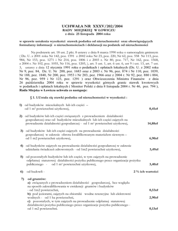UCHWAŁA NR XXXV/202/2004 RADY MIEJSKIEJ W ŁOWICZU z dnia 25 listopada 2004 roku w sprawie ustalenia wysokości stawek podatku od nieruchomości oraz obowiązujących formularzy informacji o nieruchomościach i deklaracji na podatek od nieruchomości Na podstawie art. 18 ust. 2 pkt. 8 ustawy z dnia 8 marca 1990 roku o samorządzie gminnym ( Dz. U. z 2001 roku Nr 142, poz. 1591 z 2002 roku Nr 23, poz. 220, Nr 62, poz. 558 Nr 113, poz. 984, Nr 153, poz. 1271 i Nr 214, poz. 1806 i z 2003 r. Nr 80, poz. 717, Nr 162, poz. 1568, z 2004 r. Nr 102, poz. 1055, Nr 116, poz. 1203, ), art. 5 ust. 1, art. 6 ust. 6, ust 9 i ust. 13, art. 7 ust. 3, ustawy z dnia 12 stycznia 1991 roku o podatkach i opłatach lokalnych (Dz. U. z 2002 roku Nr 9, poz. 84, Dz. U. Nr 200, poz. 1683 oraz z 2003 r. Nr 96, poz. 874 i Nr 110, poz. 1039, Nr 188, poz. 1840, Nr 200, poz. 1953 i Nr 203, poz. 1966 oraz z 2004 r. Nr 92, poz. 880 i 884, Nr 96, poz. 959 i Nr 123, poz. 1291 ) oraz Obwieszczenia Ministra Finansów z dnia 26 października 2004 roku w sprawie wysokości górnych granic stawek kwotowych w podatkach i opłatach lokalnych ( Monitor Polski z dnia 8 listopada 2004 r. Nr 46, poz. 794 ), Rada Miejska w Łowiczu uchwala co następuje: § 1. 1.Ustala się stawki podatku od nieruchomości w wysokości : 1) od budynków mieszkalnych lub ich części – od 1 m2 powierzchni użytkowej, 0,41zł 2) od budynków lub ich części związanych z prowadzeniem działalności gospodarczej oraz od budynków mieszkalnych lub ich części zajętych na prowadzenie działalności gospodarczej - od 1 m2 powierzchni użytkowej, 14,88zł 3) od budynków lub ich części zajętych na prowadzenie działalności gospodarczej w zakresie obrotu kwalifikowanym materiałem siewnym – od 1 m2 powierzchni użytkowej, 6,90zł 4) od budynków zajętych na prowadzenie działalności gospodarczej w zakresie udzielania świadczeń zdrowotnych - od 1m2 powierzchni użytkowej, 3,49zł 5) od pozostałych budynków lub ich części, w tym zajętych na prowadzenie odpłatnej statutowej działalności pożytku publicznego przez organizacje pożytku publicznego - od 1 m2 powierzchni użytkowej, 3,40zł 6) od budowli - 7) od gruntów: a) związanych z prowadzeniem działalności gospodarczej, bez względu na sposób zakwalifikowania w ewidencji gruntów i budynków - od 1m2 powierzchni, b) pod jeziorami, zajętych na zbiorniki wodne retencyjne lub elektrowni wodnych - od 1 ha powierzchni, c) pozostałych, w tym zajętych na prowadzenie odpłatnej statutowej działalności pożytku publicznego przez organizacje pożytku publicznego od 1 m2 powierzchni. 2 % ich wartości 0,53zł 2,90zł 0,13zł 2. Ustala się obowiązujący formularz informacji w sprawie podatku od nieruchomości IN – 1, ZN-1/A składany przez osobę fizyczną - zgodnie z załącznikiem Nr 1. 3. Ustala się obowiązujący formularz deklaracji na podatek od nieruchomości DN –1, ZN-1/B, składany przez osobę prawną – zgodnie z załącznikiem Nr 2. 4. Podatek od nieruchomości płatny jest w kasie Urzędu Miejskiego w Łowiczu lub na konto: BANK PEKAO SA I O/ŁOWICZ 08 1240 3347 1111 0000 2864 8956. § 2. Zwalnia się z podatku od nieruchomości: 1) Budynki, budowle i grunty wykorzystywane na realizację zadań miasta w zakresie działalności kultury, kultury fizycznej, sportu, opieki społecznej i usług komunikacji miejskiej, z wyjątkiem części wykorzystywanych na prowadzenie działalności gospodarczej, 2) Zwolnienie z podatku od nieruchomości następowało będzie po złożeniu przez podatnika dokumentów potwierdzających spełnienie warunków, o których mowa w pkt. 1. § 3. Traci moc Uchwała NR XVI/112/2003 Rady Miejskiej w Łowiczu z dnia 27 listopada 2003 roku w sprawie ustalenia wysokości stawek podatku od nieruchomości oraz obowiązujących formularzy informacji o nieruchomościach i deklaracji na podatek od nieruchomości, opublikowana w Dzienniku Urzędowym Województwa Łódzkiego Nr 339, poz. 2979, z dnia 17 grudnia 2003 r. § 4. Wykonanie uchwały powierza się Burmistrzowi Miasta Łowicza. § 5. Uchwała podlega ogłoszeniu w Dzienniku Urzędowym Województwa Łódzkiego i wchodzi w życie od 1 stycznia 2005 roku. Przewodniczący Rady Krzysztof Jan Kaliński UZASADNIENIE: Na podstawie art. 20 ust 1, 2 i 3 ustawy z dnia 12 stycznia 1991 roku o podatkach i opłatach lokalnych ( Dz. U. z 2002 roku Nr 9 poz. 84, Dz. U. Nr 200, poz. 1683, z 2003 roku Nr 96, poz. 874, Nr 110, poz. 1039, Nr 188, poz. 1840, Nr 200, poz. 1953 i Nr 203, poz. 1966 oraz z 2004 r. Nr 92, poz. 880 i 884, Nr 96, poz. 959 i Nr 123, poz. 1291 ), górne granice stawek kwotowych określone w art. 5 ust. 1, ulegają corocznie podwyższeniu na następny rok podatkowy w stopniu odpowiadającym wskaźnikowi wzrostu cen detalicznych towarów i usług konsumpcyjnych w okresie pierwszych trzech kwartałów roku, w którym stawki ulegają podwyższeniu, stosunku do analogicznego okresu roku poprzedniego. Zgodnie z komunikatem Prezesa Głównego Urzędu Statystycznego z dnia 14 października 2004 r. opublikowanym w Monitorze Polskim z dnia 21 października 2004 r. Nr 43, poz. 763, wskaźnik wzrostu cen towarów i usług konsumpcyjnych w okresie pierwszych trzech kwartałów 2004 r. wyniósł 3,2%. W Obwieszczeniu Ministra Finansów z dnia 26 października 2004 r. roku w sprawie wysokości górnych granic stawek kwotowych w podatkach i opłatach lokalnych ( Monitor Polski z 8 listopada 2004 r. Nr 46, poz. 794 ), ogłoszono górne granice stawek kwotowych podatku od nieruchomości. Maksymalne stawki podatku od nieruchomości na 2005 rok określone w art. 5 ustawy z dnia 12 stycznia 1991 roku o podatkach i opłatach lokalnych ( Tj. Dz. U. z 2002 roku Nr 9, poz. 84, z poźn. zm.), wzrastają o 3,2% w stosunku do stawek maksymalnych obowiązujących w 2004 roku. W ich granicach, stawki obowiązujące na terenie danej gminy ustalają w uchwałach rady gmin. Dla budynków zajętych na prowadzenie działalności