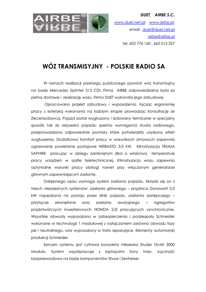 DUETT, AIRBE S.C. S www.due et.net.pl; www.airbe e.pl; e email: due [email protected] et.pl a airbe@airb be.pl tel. 602 6 776 160 0 , 662 013 257 WÓZZ TRANS SMISYJJNY - POLSKI P IE RADIO SA W ram mach realizzacji przeta argu publicznego powstał wó óz transmissyjny na bazie Mercedes Sp printer 315 CDI. Firma a AIRBE odpowiedz o zialna była a za pełłną dostaw wę i realiza ację wozu. Firma DUE ET wykonałła jego zab budowę. Oprac cowano projekt p zab budowy i wyposażenia, łączą ąc ergono omię pracy z estettyką wyko onania na każdym etapie e pro owadząc kkonsultację ę ze Zlec ceniodawc cą. Pojazd d został wy ygłuszony i izolowany y termicznie w specja alny spo osób tak że ż reżyserrka pojazd du spełnia a wymaga ania studia a radiowe ego, prze eprowadzo ono odpo owiednie pomiary p które k potw wierdziły uzyskany efekt e wyg głuszenia. Dodatkow wo komforrt pracy w warunkac ch zimowy ych zapew wnia ogrrzewanie powietrzne p e postojow we WEBASTTO 3,0 kW W. SAP PHIRE Klimaty yzacja TRU UMA pra acując w obiegu za amkniętym m dba o właściwą w temperaturę pracy urządzzeń w szzafie telettechniczne ej. Klimaty yzacja wo ozu zapew wnia opttymalne warunki w pracy obsłługi nawe et przy włączonym w m generato orze głównym zap pewniający ym zasilanie. Odrębnego opissu wymaga a system zasilania z p pojazdu. Skkłada się on o z ech niezale eżnych systemów: za asilania głó ównego – prądnica Dynawattt 5.0 trze kW napędza ana na po ostoju prze ez silnik pojazdu, p zasilania za astępczeg go – przy yłącze z zewnętrzne e oraz zasilania awaryjnego – agrega atów prą ądotwórczy ych inwertterowych HONDA 2,0i pracu ujących sy ynchroniczznie. Wszzystkie obw wody wyp posażono w zabezp pieczenia i podzespo oły Schne eider wyk konane w technolog gii 1 modułłowej z rozzłączaniem m zarówno o obwodu fazy jak i neutralne ego, wóz wyposażon w ny w trafo separując ce. Elemen nty automa atyki produkcji Schneider. Sercem m systemu jest cyfro owa konso oleta mikse erska Stude er OnAir 3000 3 Modulo. Sysstem wsp półpracuje e z lapttopami S Sony owa na bazie kompo onentów Sh hure i Senh heiser. bezzprzewodo Vaiio. Łączn ność DUETT, AIRBE S.C. S www.due et.net.pl; www.airbe e.pl; e email: due [email protected] et.pl a airbe@airb be.pl tel. 602 6 776 160 0 , 662 013 257 Pojazd został przy ygotowany do monttażu anteny satelitarn nej IGP.. Pojazd wyposa ażono w dodatkowe ośświetlenie zewnętrzne umożliwiające e przygoto owanie wo ozu do transmisji. Zassilanie ośw wietlenia wozu w dzia ała niezalleżnie od przyłącza a zewnętrznego w przypadku gdy brak b nap pięcia zew wnętrznego o. System ten obsługuje w sposób a automatyc czny prze etwornica napięcia a. Drzwi boczne osłania o sa amonośna markiza a z nap pędem elektrycznym m, a drzw wi tylne markiza m mo ocowana na drzwiach skrzzydełkowyc ch. Przewo ody przeprowadzono o dedykow wanymi torrami kablowymi tak,, że wym miana oka ablowania lub doposażenie pojjazdu nie stwarza s trudności. Na stro onie znajduje się film m który do okładnie przedstawia p a zalety wozu w tran nsmisyjnego. ostarczony y przez ABC CDATA. Sprzęt IT został do DUETT, AIRBE S.C. S www.due et.net.pl; www.airbe e.pl; e email: due [email protected] et.pl a airbe@airb be.pl tel. 602 6 776 160 0 , 662 013 257
