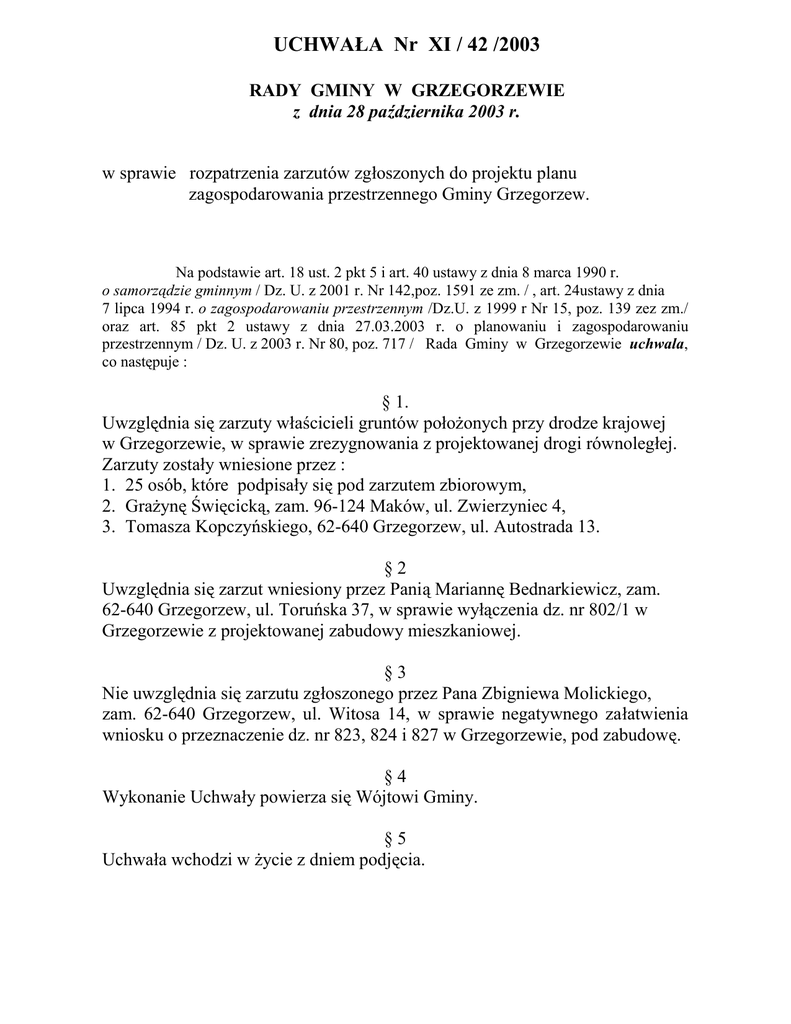 UCHWAŁA Nr XI / 42 /2003 RADY GMINY W GRZEGORZEWIE z dnia 28 października 2003 r. w sprawie rozpatrzenia zarzutów zgłoszonych do projektu planu zagospodarowania przestrzennego Gminy Grzegorzew. Na podstawie art. 18 ust. 2 pkt 5 i art. 40 ustawy z dnia 8 marca 1990 r. o samorządzie gminnym / Dz. U. z 2001 r. Nr 142,poz. 1591 ze zm. / , art. 24ustawy z dnia 7 lipca 1994 r. o zagospodarowaniu przestrzennym /Dz.U. z 1999 r Nr 15, poz. 139 zez zm./ oraz art. 85 pkt 2 ustawy z dnia 27.03.2003 r. o planowaniu i zagospodarowaniu przestrzennym / Dz. U. z 2003 r. Nr 80, poz. 717 / Rada Gminy w Grzegorzewie uchwala, co następuje : § 1. Uwzględnia się zarzuty właścicieli gruntów położonych przy drodze krajowej w Grzegorzewie, w sprawie zrezygnowania z projektowanej drogi równoległej. Zarzuty zostały wniesione przez : 1. 25 osób, które podpisały się pod zarzutem zbiorowym, 2. Grażynę Święcicką, zam. 96-124 Maków, ul. Zwierzyniec 4, 3. Tomasza Kopczyńskiego, 62-640 Grzegorzew, ul. Autostrada 13. §2 Uwzględnia się zarzut wniesiony przez Panią Mariannę Bednarkiewicz, zam. 62-640 Grzegorzew, ul. Toruńska 37, w sprawie wyłączenia dz. nr 802/1 w Grzegorzewie z projektowanej zabudowy mieszkaniowej. §3 Nie uwzględnia się zarzutu zgłoszonego przez Pana Zbigniewa Molickiego, zam. 62-640 Grzegorzew, ul. Witosa 14, w sprawie negatywnego załatwienia wniosku o przeznaczenie dz. nr 823, 824 i 827 w Grzegorzewie, pod zabudowę. §4 Wykonanie Uchwały powierza się Wójtowi Gminy. §5 Uchwała wchodzi w życie z dniem podjęcia. UZASADNIENIE do Uchwały Nr XI /42/2003 r. Rady Gminy w Grzegorzewie z dnia 28 października 2003 r. w sprawie rozpatrzenia zarzutów zgłoszonych do projektu planu zagospodarowania przestrzennego Gminy Grzegorzew. Rada Gminy w Grzegorzewie Uchwałą nr XXXVI/202/2002, z dnia 03 września 2002 r., rozpoczęła czynności formalne dotyczące opracowania projektu planu zagospodarowania przestrzennego gminy. Dotychczas obowiązujący plan uchwalony był w 1993 r. Przystąpienie do prac nad nowym planem poprzedzone zostało opraco – waniem w 2001 r. „ studium uwarunkowań i kierunków zagospodarowania przestrzennego gminy”, którego postanowienia są wiążące przy ustalaniu zagospodarowania terenu gminy. Ponadto Rada Gminy Uchwałą Nr XXXVI/203/02, z dn. 03.09.2002 r. wniosła o ujęcie w opracowywanym planie zagospodarowa – nia gminy wariantowych lokalizacji parku elektrowni wiatrowych. Po opracowaniu projektu planu oraz prognozy skutków wpływu ustaleń planu na środowisko przyrodnicze – przystąpiono do jego opiniowania i uzga – dniania z zainteresowanymi jednostkami, w tym z Wojewodą i Zarządem Województwa. Na etapie uzgadniania projektu planu z Generalną Dyrekcją Dróg Krajowych i Autostrad w Poznaniu ustalono, że uzasadnionym jest zaprojektowanie drogi równoległej wzdłuż drogi krajowej . Jest to pas terenu o szerokości ca 8 – 10 m. Mając na względzie zakaz urządzania nowych zjazdów, budowa drogi równoległej jest jedynym sposobem umożliwienia właścicielom gruntów, dostępnych z drogi krajowej, realizacji zamierzeń inwestycyjnych. Po zaopiniowaniu i uzgodnieniu projekt planu wyłożono do publicznego wglądu, o czym powiadomiono zainteresowanych właścicieli i użytkowników gruntów. Na tym etapie opracowania wniesiono zarzuty do projektowanego sposobu zagospodarowania niektórych gruntów. Zarzuty zostały zgłoszone przez właścicieli gruntów i dotyczyły : 1. zarzut zbiorowy podpisany przez 25 osób. Wyrażono w nim sprzeciw na bu – dowę drogi równoległej do drogi krajowej, 2. Grażyna Święcicka, zam. 96-124 Maków, ul. Zwierzyniec 4, nie zgadza się na projektowana drogę równoległą do drogi krajowej , prowadzoną przez działki nr 63 i 64 w Grzegorzewie, 3. Tomasz Kopczyński, zam. 62-640 Grzegorzew, ul. Autostrada 13, nie zgadza się na budowę drogi równoległej do drogi krajowej , prowadzoną przez działki nr : 61, 86, 87, 103/1 i 103/2 w Grzegorzewie. Temat budowy drogi równoległej do drogi krajowej jest omawiany w Urzędzie Gminy od kilku lat. Generalna Dyrekcja Dróg Krajowych i Auto – strad ustaliła zakaz tworzenia nowych zjazdów na drogę krajową. -2- Jedynym sposobem umożliwienia właścicielom gruntów, dostępnych z drogi krajowej, zabudowy swoich gruntów, jest budowa drogi równoległej, zgodnie z projektem technicznym, który jest w Generalnej Dyrekcji Dróg Krajowych i Autostrad w Poznaniu. Z uwagi na skalę zarzutów w zakresie budowy drogi równoległej, postanowiono przyjąć do projektu planu zgłoszone uwagi i zrezygnować z zamierzonej budowy drogi. Decyzja w sprawie rezygnacji z budowy drogi równoległej oznacza również negatywne załatwienie wniosków w sprawie zamierzeń inwestycyjnych na gruntach dostępnych wyłącznie z drogi krajowej. 4. Marianna Bednarkiewicz, zam. 62-640 Grzegorzew, ul. Toruńska 37, nie zgadza się na przeznaczenie dz. nr 802/1w Grzegorzewie dla zabudowy mieszkaniowej. Działka nr 802 nie posiada uregulowanych spraw własnościowych. Dzierżawca części gruntu, dz. 802/1, złożył do Urzędu Gminy wniosek o przeznaczenie tej działki pod zabudowę mieszkaniową. Wniosek został zaopiniowany pozytywnie. Na etapie wyłożenia do wglądu, współwłaścicielka gruntu, Pani Marianna Bednarkiewicz, wniosła zarzut, w którym nie wyraża zgody na projektowaną zmianę użytkowania części gruntu, uzasadniając to tym, że aktualnie w Sądzie Rejonowym w Kole toczy się proces o uregulowanie tytułu własności oraz że działka nr 802 jest głównym źródłem utrzymania rodziny. Ponadto sporny grunt jest w IV kl. bonitacyjnej co wskazuje na jego ochronę dla produkcji rolniczej. Po rozpatrzeniu zarzutu postanowiono uwzględnić przedstawione uzasadnienie i zrezygnować z projektowanej zabudowy na dz. nr 802/1. 5. Zbigniew Molicki, zam. 62-640 Grzegorzew, ul. Witosa 14, zarzut dot. negatywnego załatwienia wniosku w sprawie przeznaczeni