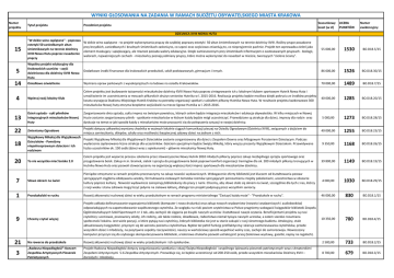 WYNIKI GŁOSOWANIA NA ZADANIA W RAMACH BUDŻETU OBYWATELSKIEGO MIASTA KRAKOWA Numer projektu Tytuł projektu Przedmiot projektu Szacunkowy koszt (w zł) LICZBA PUNKTÓW Numer ewidencyjny DZIELNICA XVIII NOWA HUTA 15 "W dzikie wino zaplątane" - poprawa estetyki 50 zaniedbanych altan śmietnikowych na terenie dzielnicy XVIII Nowa Huta poprzez nasadzenie pnączy W dzikie wino zaplątane - to projekt wykorzystania pnączy do szybkiej poprawy estetyki 50 altan śmietnikowych na terenie dzielnicy XVIII. Rośliny pnące posadzone przy brzydkich, zaniedbanych i brudnych śmietnikach zasłonią to, co szpeci oraz częściowo zniwelują to, co nieprzyjemnie pachnie. Projekt ten wprowadza zieleń jako element maskujący i upiększający, ale również posiada walory edukacyjne. Dzięki zamieszczonym przy śmietnikach informacjom o zastosowanych pnączach - biologii, walorach, najważniejszych cechach - mieszkańcy poznają odmiany pnączy, które można wykorzystać do nasadzeń w mieście, tworzących "zielone ściany". 55 000,00 1530 BO.D18.5/15 5 Wspólny projekt edukacyjny dla Krakowskich uczniów - część dzielnicowa dla dzielnicy XVIII Nowa Huta Dodatkowe środki finansowe dla krakowskich przedszkoli, szkół podstawowych, gimnazjum i innych. 86 600,00 1526 BO.D18.30/15 Osiedlowe oświetlenie Wymiana opraw parkowych z wysokoprężnych na ledowe na osiedlu Krakowiaków. 70 000,00 1489 BO.D18.7/15 Wpieraj swój lokalny Klub Celem projektu jest budowanie tożsamości mieszkańców dzielnicy XVIII Nowa Huta poprzez zintegrowanie ich z lokalnym klubem sportowym Hutnik Nowa Huta i umożliwienie im uczestniczenia w meczach piłkarskich drużyn seniorów Hutnika w l. 2015-2016. Realizacja projektu będzie możliwa dzięki pokryciu ze środków projektu kosztu wynajęcia Stadionu Miejskiego Hutnik Kraków na potrzeby organizacji spotkań z udziałem piłkarzy Hutnika Nowa Huta. W rezultacie projektu każdorazowo 300 mieszkańców Nowej huty otrzyma bezpłatne wejściówki na mecze ligowe Hutnika w l. 2015-2016. 40 000,00 1285 BO.D18.20/15 13 Dzień sąsiada - cykl pikników integracyjnych mieszkańców Nowej Huty Zorganizowanie dnia sąsiada, cyklu imprez na świeżym powietrzu, których celem będzie integracja mieszkańców i edukacja obywatelska. W kilku miejscach w Nowej Hucie zostanie zorganizowany piknik - spotkanie mieszkańców w którym każdy będzie mógł uczestniczyć. Przewidziane są atrakcje dla dzieci, imprezy dla rodzin oraz dyskusje na temat w jaki sposób każdy z mieszkańców może przyczynić się do polepszenia sytuacji w swojej dzielnicy. 5 000,00 1273 BO.D18.28/15 22 Zmieniamy Ogrodowe Projekt dotyczy całkowitej wymiany chodnika w ważnych lokalnie ciągach komunikacji pieszej na Osiedlu Ogrodowym (Dzielnica XVIII), związanych z dojściem do miejsca zamieszkania, sklepów, szkoły oraz możliwości bezpiecznej zabawy dzieci na jednym z nich. 40 000,00 1255 BO.D18.23/15 18 Wyjątkowy Mikołaj dla Wyjątkowych Projekt Wyjątkowy Mikołaj dla Wyjątkowych Dzieciaków zostanie zorganizowany dla dzieci z Zespołem Downa oraz Mózgowym Porażeniem Dziecięcym. Podczas Dzieciaków - Pomóżmy wydarzenia zaplanowano liczne atrakcje dla uczestników. Gościem specjalnym będzie Święty Mikołaj, który wręczy prezenty Wyjątkowym Dzieciakom. Przewidywana niepełnosprawnym dzieciom i ich liczba uczestników ok. 150 osób (dzieci wraz z opiekunami) – głównie mieszkańcy Nowej Huty. rodzinom 9 350,00 1168 BO.D18.26/15 20 To nie wszystko mieć boisko 2.0 Celem projektu jest wsparcie procesu szkolenia przez stowarzyszenie Nowy Hutnik 2010 młodych piłkarzy poprzez zakup niezbędnego sprzętu sportowego oraz przygotowania boisk. Zakup m.in. bramek, siatek i sprzętu do przygotowania boisk poprawi komfort organizacji treningów dla ok. 200 młodych piłkarzy trenujących w Hutniku Nowa Huta oraz pozwoli stowarzyszeniu na organizację większej ilości imprez sportowych dla mieszkańców dzielnicy. 39 800,00 1149 BO.D18.19/15 7 Słowo oknem na świat Pieniądze otrzymane w ramach projektu przeznaczymy na zakup nowości wydawniczych. Wzbogacenie oferty biblioteki jest kluczem od kształtowania postaw sprzyjających ciągłemu zdobywaniu wiedzy, formułowania ciekawych tematów rozmów sprzyjających porozumieniu między pokoleniami, uczestnictwa w obszarze kultury poprzez kulturę . Nowości wydawnicze zainspirują bibliotekarzy do pracy z nami. Chcemy, aby słowo stało się oknem na świat, szczególnie dla tych z nas, którzy z racji wieku i stanu zdrowia mogą liczyć jedynie na ciekawa lekturę, dlatego ten projekt podpisują przez wszystkim seniorzy. 4 000,00 1030 BO.D18.29/15 1 Przedszkolaki w ruchu Rozwój aktywności ruchowej dzieci w wieku przedszkolnym w ramach programu ministerialnego "Ćwiczyć każdy może" - "Przedszkole w ruchu". 46 000,00 830 BO.D18.1/15 Chcemy czytać więcej Projekt zakłada dofinansowanie wyposażenia biblioteki (komputer i nowa drukarka) oraz zakup nowych wydawnictw (nowości wydawniczych i audiobooków) odpowiadających na zapotrzebowanie współczesnego czytelnika. Ze względu na niski poziom czytelnictwa w Polsce pragniemy wzbogacić księgozbiór biblioteki Zespołu Ogólnokształcących Szkół Sportowych nr 1 tak, aby zachęcić do sięgania po książki naszych uczniów i kształtować nawyk czytania. Beneficjentami projektu są nasi czytelnicy: uczniowie, pracownicy szkoły, ich rodziny, ale także rodzice, dziadkowie, rodzeństwo niemal tysiąca naszych uczniów, a zatem szeroko rozumiana społeczność lokalna. Jest wiele pozycji, o które pytają nasi czytelnicy, których biblioteka nie jest w stanie zakupić z racji skromnego budżetu. Atrakcyjny, stale aktualizowany księgozbiór, przyczyni się do wzrostu poziomu czytelnictwa. Będzie też pełnił funkcję profilaktyczną: skieruje zainteresowania czytelników, przede wszystkim dzieci i młodzieży, na pozytywne aspekty rzeczywistości, nauczy w wartościowy sposób wypełniać w
