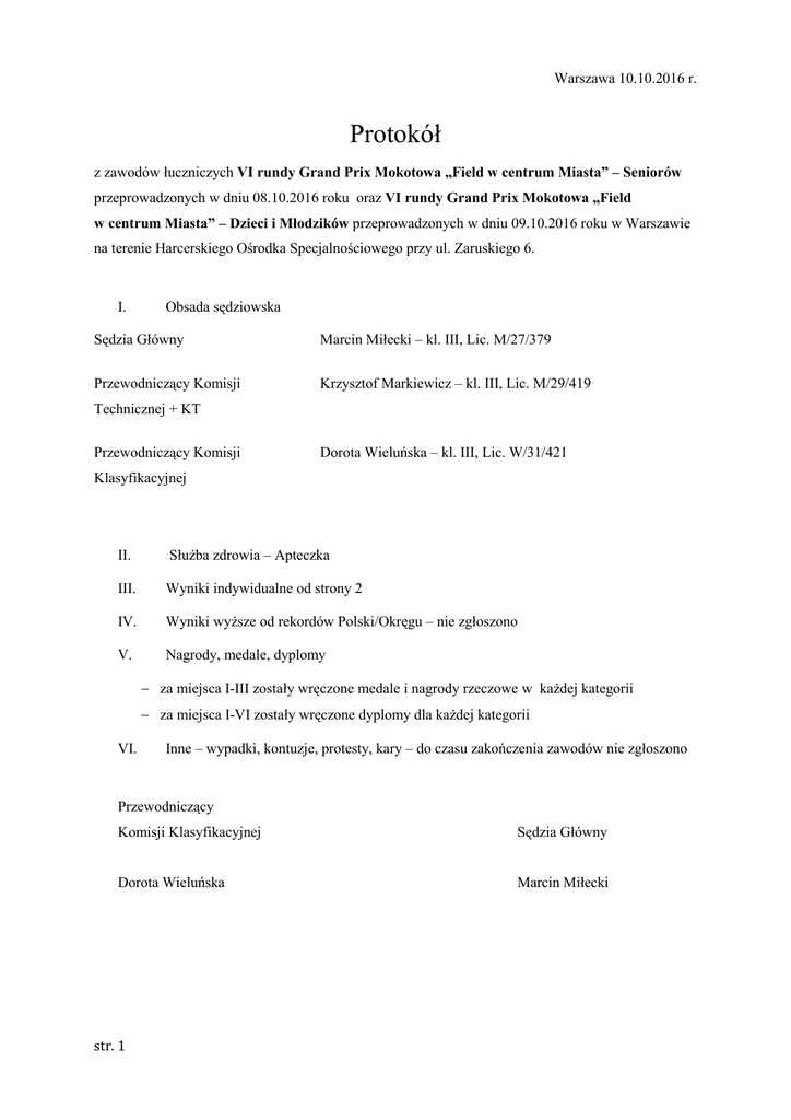Warszawa 10.10.2016 r. Protokół z zawodów łuczniczych VI rundy Grand Prix Mokotowa „Field w centrum Miasta” – Seniorów przeprowadzonych w dniu 08.10.2016 roku oraz VI rundy Grand Prix Mokotowa „Field w centrum Miasta” – Dzieci i Młodzików przeprowadzonych w dniu 09.10.2016 roku w Warszawie na terenie Harcerskiego Ośrodka Specjalnościowego przy ul. Zaruskiego 6. I. Obsada sędziowska Sędzia Główny Marcin Miłecki – kl. III, Lic. M/27/379 Przewodniczący Komisji Krzysztof Markiewicz – kl. III, Lic. M/29/419 Technicznej + KT Przewodniczący Komisji Dorota Wieluńska – kl. III, Lic. W/31/421 Klasyfikacyjnej II. Służba zdrowia – Apteczka III. Wyniki indywidualne od strony 2 IV. Wyniki wyższe od rekordów Polski/Okręgu – nie zgłoszono V. Nagrody, medale, dyplomy − za miejsca I-III zostały wręczone medale i nagrody rzeczowe w każdej kategorii − za miejsca I-VI zostały wręczone dyplomy dla każdej kategorii VI. Inne – wypadki, kontuzje, protesty, kary – do czasu zakończenia zawodów nie zgłoszono Przewodniczący Komisji Klasyfikacyjnej Sędzia Główny Dorota Wieluńska Marcin Miłecki str. 1 LP ŁUK WIEK 1 Klasyczny Dzieci dziewczęta 2 Klasyczny 3 12 Celów nieoznaczonych 12 Celów oznaczonych RAZEM "6" RAZEM "5" SUMA RAZEM NAZWISKO IMIĘ R.U KLUB 1 Smółko Anna 2004 SP 65 115 3 119 1 234 Dzieci dziewczęta 2 Leśniewska Anna 2005 SP 65 131 2 102 2 233 Klasyczny Dzieci dziewczęta 3 Przybylska Barbara 2004 MKŁ Strzała 87 5 56 4 143 4 Klasyczny Dzieci dziewczęta 4 Zawadzka Zofia 2004 SP 65 90 4 59 3 149 5 Klasyczny Dzieci dziewczęta 5 Struss Zofia 2004 SP 65 142 1 0 7 142 6 Klasyczny Dzieci dziewczęta 6 Cattan Reem 2005 SP 65 78 6 48 6 126 7 Klasyczny Dzieci dziewczęta 7 Grąbczewska Pola 2006 SP 65 64 7 52 5 116 8 Klasyczny Dzieci chłopcy 1 Gotkowski Kacper 2004 SP 65 154 1 138 1 292 9 Klasyczny Dzieci chłopcy 2 Baumiller Gustaw 2004 SP 65 140 2 130 2 270 10 Klasyczny Dzieci chłopcy 3 Matałowski Mikołaj 2005 SP 65 133 3 120 3 253 11 Klasyczny Dzieci chłopcy 4 Gotkowski Kajetan 2006 SP 65 115 4 83 5 198 12 Klasyczny Dzieci chłopcy 5 Wenzel Karol 2005 SP 65 97 5 97 4 194 13 Klasyczny Młodzicy OPEN 1 Michalak Maciej 2002 Drukarz 143 3 168 1 311 14 Klasyczny Młodzicy OPEN 2 Rak Krzysztof 2002 Robin Hood 149 2 159 2 308 15 Klasyczny Młodzicy OPEN 3 Majstrewicz Tadeusz 2002 Drukarz 161 1 137 3 298 16 Klasyczny Młodzicy OPEN 4 Wiącek Mateusz 2000 MKŁ Strzała 89 5 44 4 133 17 Klasyczny Młodzicy OPEN 5 Woźniak Elżbieta 2002 MKŁ Strzała 107 4 0 6 107 18 Klasyczny Młodzicy OPEN 6 Daniel Dominik 2003 MKŁ Strzała 42 6 24 5 66 19 Berbow Seniorzy OPEN 1 Sadkowski Tomasz Wiślana Ścieżka Łucz. 112 1 92 1 204 20 Berbow Seniorzy OPEN 2 Miłecki Marcin MKŁ Strzała 68 3 65 2 133 21 Berbow Seniorzy OPEN 3 Korniluk Marek 65 4 65 3 130 22 Berbow Seniorzy OPEN 4 Wiącek Mateusz 2000 MKŁ Strzała 74 2 44 4 118 23 Olimpijski Seniorzy OPEN 1 Markiewicz Krzysztof 1993 MKŁ Strzała 161 1 116 1 232 24 Bloczkowy Seniorzy OPEN 1 Gil Kamil 170 1 158 1 328 25 Bloczkowy Seniorzy OPEN 2 Gil Adam 133 3 114 2 247 26 Bloczkowy Seniorzy OPEN 3 Kalinowski Tomasz 142 2 100 3 242 str. 2 MIEJSCE NO. 1986 Wyniki klasyfikacji końcowej Grand Prix Mokotowa „Field w centrum Miasta” po 4 rundach: Dzieci Dziewczynki 1. Anna Smółko – SP 65 2. Anna Leśniewska – SP 65 3. Zofia Struss – SP 65 Dzieci Chłopcy 1. Kacper Gotkowski – SP 65 2. Mikołaj Matałowski – SP 65 3. Karol Wenzel – SP 65 Młodzicy OPEN 1. Maciej Michalak – KS Drukarz 2. Krzysztof Rak – Robin Hood 3. Tadeusz Majstrewicz – KS Drukarz Seniorzy OPEN Łuki Berbow 1. Tomasz Sadkowski 2. Emil Stąpór 3. Marek Korniluk Łuki Bloczkowe 1. Kamil Gil 2. Adam Gil 3. Tomasz Kalinowski str. 3