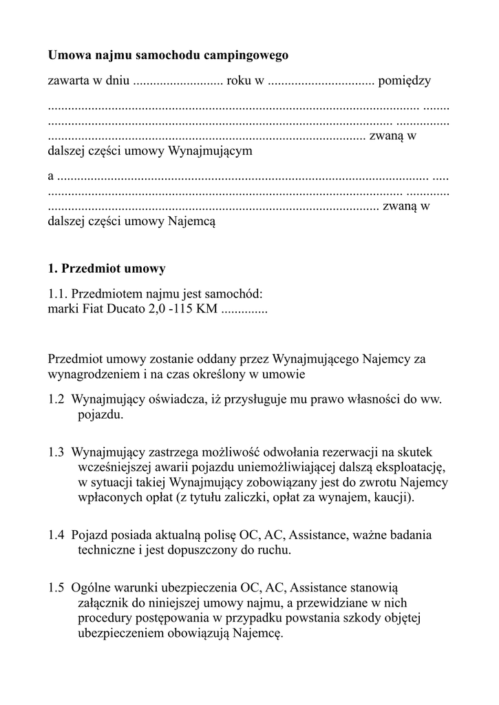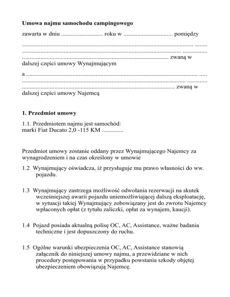 Umowa najmu samochodu campingowego zawarta w dniu ........................... roku w ................................ pomiędzy ............................................................................................................... ........ ....................................................................................................... ................ ............................................................................................... zwaną w dalszej części umowy Wynajmującym a ............................................................................................................... ..... .......................................................................................................... ............. ................................................................................................... zwaną w dalszej części umowy Najemcą 1. Przedmiot umowy 1.1. Przedmiotem najmu jest samochód: marki Fiat Ducato 2,0 -115 KM .............. Przedmiot umowy zostanie oddany przez Wynajmującego Najemcy za wynagrodzeniem i na czas określony w umowie 1.2 Wynajmujący oświadcza, iż przysługuje mu prawo własności do ww. pojazdu. 1.3 Wynajmujący zastrzega możliwość odwołania rezerwacji na skutek wcześniejszej awarii pojazdu uniemożliwiającej dalszą eksploatację, w sytuacji takiej Wynajmujący zobowiązany jest do zwrotu Najemcy wpłaconych opłat (z tytułu zaliczki, opłat za wynajem, kaucji). 1.4 Pojazd posiada aktualną polisę OC, AC, Assistance, ważne badania techniczne i jest dopuszczony do ruchu. 1.5 Ogólne warunki ubezpieczenia OC, AC, Assistance stanowią załącznik do niniejszej umowy najmu, a przewidziane w nich procedury postępowania w przypadku powstania szkody objętej ubezpieczeniem obowiązują Najemcę. 1.6 Pojazd jest wyposażony w urządzenia techniczne wymienione w protokole odbioru pojazdu. 1.7 Najemca oświadcza, iż zapoznał się ze stanem technicznym pojazdu i nie wnosi, co do tego zastrzeżeń. 1.8 Najemca oświadcza, iż podczas przeprowadzonej prezentacji został pouczony o sposobie eksploatacji pojazdu. 1.9 Najemca oświadcza, iż posiada wymagane uprawnienia do kierowania pojazdem na co okazuje przy sporządzeniu niniejszej umowy stosowny dokument, którego kserokopia stanowi załącznik do niniejszej umowy. 2. Czas trwania umowy . 2.1 Niniejsza umowa zostaje zawarta na czas od dnia .............. godziny ................ do dnia .................... godziny.................... 2.2 Czas trwania umowy może być przedłużony jedynie za zgodą Wynajmującego. (dopuszcza się wyrażenie zgody telefonicznie). 2.3 W przypadku zwrotu pojazdu Wynajmującemu po terminie o którym mowa w pkt. 2.1 (i po uwzględnieniu pkt. 2.2) umowy Najemca zobowiązany jest do uiszczenia Wynajmującemu odszkodowania w wysokości dwukrotnej stawki dobowej za każdą rozpoczętą dobę opóźnienia. 2.4 W przypadku brak zwrotu pojazdu o określonym terminie Wynajmujący ma obowiązek do niezwłocznego powiadomienia organów ścigania o fakcie przywłaszczenia pojazdu przez Najemcę. 3. Wynagrodzenie i opłaty inne 3.1 Wynagrodzenie wynosi ......... zl za każdą rozpoczętą dobę wynajmu pojazdu. Przez dobę rozumie się kolejne 24 godziny po wydaniu pojazdu Najemcy. Wynagrodzenie łączne przysługujące Wynajmującemu z tytułu niniejszej umowy wynosi ..........zł Wynagrodzenie jest płatne przez Najemcę w całości z góry, najpóźniej do chwili przekazania pojazdu. 3.2 Tytułem kaucji na poczet zabezpieczenia wszelkich roszczeń wynikających z niniejszej umowy Najemca wpłaca Wynajmującemu kwotę 5 000,00 zł. Wynajmujący może pokryć z wpłaconej kaucji należności wynikające z: uszkodzenia pojazdu wewnątrz lub na zewnątrz, kradzieży pojazdu, szkody całkowitej, zgubienia kluczyków lub pilota do autoalarmu, zgubienia dowodu rejestracyjnego, zaistnienia okoliczności o których mowa w pkt. 2.3, pkt. 4.6, pkt. 4,7, pkt. 5, pkt. 6. 3.3. Jeżeli wysokość kaucji nie wystarcza na pokrycie szkody Najemca jest zobowiązany do dopłaty różnicy według zasad odpowiedzialności określonych w pkt. 5 oraz pkt. 6 umowy. 3.4 Kaucja podlega zwrotowi Wynajmującemu w kwocie nominalnej przelewem w terminie do 5 dni, o ile nie zachodzą okoliczności uzasadniające zatrzymanie kaucji w całości lub części o których mowa w treści umowy. 4. Obowiązki Najemcy 4.1. Najemca zobowiązany jest do terminowego zwrotu pojazdu oraz zapłaty wynagrodzenia zgodnie z umową. 4.2 Najemca jest obowiązany do korzystania z pojazdu zgodnie z jego przeznaczeniem, z zachowaniem zasad prawidłowej eksploatacji, przestrzegania instrukcji użytkownika, przestrzegania postanowień umów i przepisów ubezpieczeniowych a w szczególności ogólnych warunków ubezpieczenia pojazdu. 4.3 Najemca zobowiązuje się do bezwzględnego przestrzegania zakazu palenia tytoniu w całym pojeździe oraz zakazu przewożenia w nim zwierząt. 4.4 Najemca może używać pojazdu jedynie na terytorium UE, chyba, że Wynajmujący wyrazi pisemną zgodę na używanie pojazdu także poza granicami UE. 4.5 Najemcy nie wolno dokonywać żadnych zmian i przeróbek w pojeździe. 4.6 Pojazd powinien być zwrócony w stanie nieuszkodzonym. Pojazd w chwili zwrotu winien być czysty na zewnątrz i w środku. W przypadku zwrotu brudnego pojazdu Wynajmujący obciąży Najemcę opłatą w wysokości 300,00 zł netto + VAT. W przypadku konieczności czyszczenia łazienki wewnątrz lub opróżniania kasety toalety Wynajmujący obciąży Najemcę opłatą w wysokości 300,00 zł + VAT. 4.7 Pojazd powinien być zwrócony Wynajmującemu wraz z pełnym zbiornikiem paliwa oraz pełną butlą gazową. W przypadku zwrotu z niepełnym zbiornikiem paliwa Wynajmujący obciąży Najemcę opłatą w wysokości 500,00 zł + VAT, natomiast w przypadku zwrotu z niepełną butlą gazową Wynajmujący obciąży Najemcę opłatą w wysokości 200,00 zł + VAT 4.8 Najemca zobowiązuje się do zachow