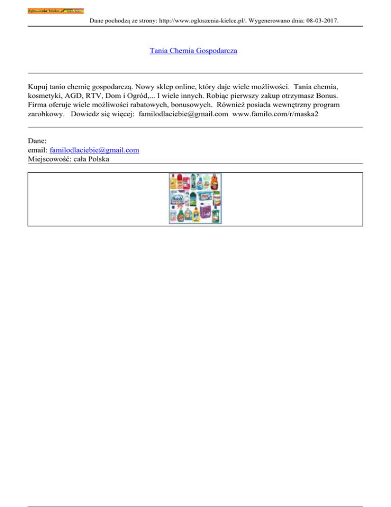 Dane pochodzą ze strony: http://www.ogloszenia-kielce.pl/. Wygenerowano dnia: 08-03-2017. Tania Chemia Gospodarcza Kupuj tanio chemię gospodarczą. Nowy sklep online, który daje wiele możliwości. Tania chemia, kosmetyki, AGD, RTV, Dom i Ogród,... I wiele innych. Robiąc pierwszy zakup otrzymasz Bonus. Firma oferuje wiele możliwości rabatowych, bonusowych. Również posiada wewnętrzny program zarobkowy. Dowiedz się więcej: [email protected] www.familo.com/r/maska2 Dane: email: [email protected] Miejscowość: cała Polska