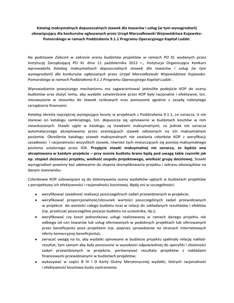 Katalog maksymalnych dopuszczalnych stawek dla towarów i usług (w tym wynagrodzeo) obowiązujący dla konkursów ogłaszanych przez Urząd Marszałkowski Województwa KujawskoPomorskiego w ramach Poddziałania 9.1.1 Programu Operacyjnego Kapitał Ludzki. Na podstawie Zaleceo w zakresie oceny budżetów projektów w ramach PO KL wydanych przez Instytucję Zarządzającą PO KL dnia 11 października 2012 r., Instytucja Organizująca Konkurs wprowadziła Katalog maksymalnych dopuszczalnych stawek dla towarów i usług (w tym wynagrodzeo) dla konkursów ogłaszanych przez Urząd Marszałkowski Województwa KujawskoPomorskiego w ramach Poddziałania 9.1.1 Programu Operacyjnego Kapitał Ludzki . Wprowadzenie powyższego mechanizmu ma zagwarantowad jednolite podejście KOP do oceny budżetów oraz służyd temu, aby wydatki zatwierdzone przez KOP były racjonalne i efektywne, tzn. niezawyżone w stosunku do stawek rynkowych oraz ponoszone zgodnie z zasadą należytego zarządzania finansami. Katalog określa najczęściej występujące koszty w projektach z Poddziałania 9.1.1, co oznacza, iż nie stanowi on katalogu zamkniętego, tzn. dopuszcza się ujmowanie w budżetach kosztów w nim niewskazanych. Stawki ujęte w katalogu są stawkami maksymalnymi, co jednak nie oznacza automatycznego akceptowania przez oceniających stawek założonych na ich maksymalnym poziomie. Określenie katalogu stawek maksymalnych nie zwalania członków KOP z weryfikacji zasadności i racjonalności wszystkich stawek, również tych mieszczących się poniżej maksymalnego poziomu ustalonego przez IOK. Przyjęcie stawki maksymalnej nie oznacza, że będzie ona akceptowana w każdym projekcie – przy ocenie budżetu brane będą pod uwagę takie czynniki jak np. stopieo złożoności projektu, wielkośd zespołu projektowego, wielkośd grupy docelowej. Stawki wynagrodzeo powinny byd adekwatne do stopnia skomplikowania projektu i zakresu obowiązków na danym stanowisku. Członkowie KOP zobowiązani są do dokonywania oceny wydatków ujętych w budżetach projektów z perspektywy ich efektywności i racjonalności kosztowej. Będą oni w szczególności: weryfikowad zasadnośd realizacji poszczególnych zadao przewidzianych w projekcie; weryfikowad proporcjonalnośd/stosunek wartości poszczególnych zadao przewidzianych w projekcie do wartości całego budżetu oraz w relacji do zakładanych rezultatów i efektów (np. przeliczad poszczególne pozycje budżetu na uczestnika, itp.); weryfikowad czy koszt jednostkowy usługi realizowanej w ramach danego projektu nie odbiega od cen towarów lub usług oferowanych w podobnych projektach lub oferowanych przez beneficjanta poza projektem (np. poprzez sprawdzenie na stronach internetowych oferty komercyjnej beneficjenta); zwracad uwagę na to, aby wydatki ujmowane w budżecie projektu spełniały relację nakładrezultat, tym samym aby były ponoszone w wysokości odpowiedniej do specyfiki i złożoności zadao przewidzianych w projekcie, porównywad rezultaty projektów z nakładami finansowymi przewidzianymi w budżetach projektów; wykazywad w części B IV i D Karty Oceny Merytorycznej wydatki, których racjonalnośd i efektywnośd kosztowa budzi zastrzeżenia. IOK przypomina również, iż - zgodnie z obowiązującymi Zasadami dokonywania wyboru projektów w ramach POKL - zidentyfikowanie przez oceniającego wydatków niekwalifikowalnych (niespełniających zasad kwalifikowalności określonych w Wytycznych w zakresie kwalifikowania wydatków w ramach PO KL, w szczególności niezgodnych ze stawkami rynkowymi, dotyczy to również sytuacji, gdy łączna wartośd usług / towarów uwzględnionych w budżecie projektu lub całą wartośd projektu jest zawyżona w stosunku do stawek rynkowych) i/lub zbędnych z punktu widzenia realizacji projektu w maksymalnej wysokości do 25% wartości projektu skutkuje odpowiednim zmniejszeniem liczby punktów przyznawanych w kategorii oceny IV Wydatki projektu zawartej w części B. Karty oceny merytorycznej. Zidentyfikowanie przez oceniającego wydatków niekwalifikowalnych i/lub zbędnych z punktu widzenia realizacji projektu w wysokości przewyższającej 25% wartości projektu skutkuje negatywną oceną budżetu projektu. Nazwa kosztu Jednostka Maksymalny dopuszczalny koszt (w złotych brutto) Zadania merytoryczne etat wynagrodzenie zgodne z ustawą z dnia 26 stycznia 1982 r. - Karta Nauczyciela (Dz. U. z 2006 r.nr 97 poz. 674, z późn. zm.) Nauczyciel wychowania przedszkolnego (zatrudniony na umowę o pracę) etat 4 300 Logopeda Psycholog godzina* godzina* 70 80 muzyczno-taneczne, teatralne, rytmika, plastyka godzina** 75 informatyczne godzina** 70 gimnastyka korekcyjna godzina** 50 j.angielski/j.niemiecki godzina** 75/50 Zajęcia dodatkowe Nauczyciel wychowania przedszkolnego (zatrudniony w ramach umowy o pracę zgodnie z ustawą z dnia 26 stycznia 1982 r. - Karta Nauczyciela ) Wyżywienie (catering) Urządzenie wielofunkcyjne na potrzeby realizacji zadao Urządzenie wielofunkcyjne na potrzeby zarządzania Rzutnik Ekran dzieo/osoba Cross - financing 11 sztuka 5000 sztuka 1500 sztuka sztuka 3000 600 Tablica interaktywna z projektorem sztuka 8000 Odtwarzacz CD Aparat cyfrowy Krzesło Stół Zmywarko-wyparzarka sztuka sztuka sztuka sztuka sztuka 500 500 150 300 5500 Laptop z oprogramowaniem (rozumiane jako system operacyjny oraz oprogramowanie typu MS Office) sztuka 3000 Zarządzanie Koordynator projektu umowa o pracę - 1 etat umowa cywiloprawna miesiąc godzina 6000 40 Pozostały personel (osoby odpowiedzialne za: monitoring, sprawozdawczośd, rozliczenia, sporządzanie wniosków o płatnośd, rekrutację, działania informacyjnopromocyjne, organizację szkoleo) umowa o pracę - 1 etat umowa cywiloprawna miesiąc godzina 5500 35 Zakup usługi zarządzania projektem usługa kompleksowa, bez żadnych dodatkowych kosztów personelu miesiąc 9500 Rachunek bankowy Stworzenie strony internetowej Ogłoszenie w prasie miesiąc Prom