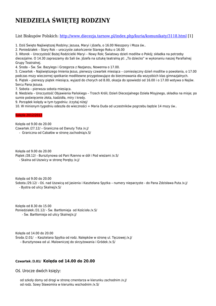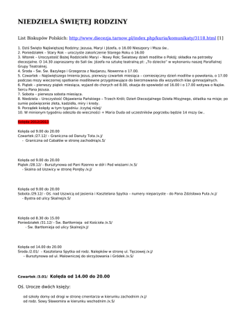 NIEDZIELA ŚWIĘTEJ RODZINY List Biskupów Polskich: http://www.diecezja.tarnow.pl/index.php/kuria/komunikaty/3118.html [1] 1. Dziś Święto Najświętszej Rodziny; Jezusa, Maryi i Józefa, o 16.00 Nieszpory i Msza św.. 2. Poniedziałek – Stary Rok – uroczyste zakończenie Starego Roku o 16.00 3. Wtorek – Uroczystość Bożej Rodzicielki Maryi – Nowy Rok; Światowy dzień modlitw o Pokój; składka na potrzeby diecezjalne. O 14.30 zapraszamy do Sali św. Józefa na sztukę teatralną pt: „To dziecko” w wykonaniu naszej Parafialnej Grupy Teatralnej. 4. Środa – Św. Św. Bazylego i Grzegorza z Nazjanzu, Nowenna o 17.00. 5. Czwartek – Najświętszego Imienia Jezus, pierwszy czwartek miesiąca – comiesięczny dzień modlitw o powołania, o 17.00 podczas mszy wieczornej spotkanie modlitewne przygotowujące do bierzmowania dla wszystkich klas gimnazjalnych. 6. Piątek – pierwszy piątek miesiąca, wyjazd do chorych od 8.00, okazja do spowiedzi od 16.00 i o 17.00 wotywa o Najśw. Sercu Pana Jezusa. 7. Sobota – pierwsza sobota miesiąca. 8. Niedziela – Uroczystość Objawienia Pańskiego – Trzech Króli; Dzień Diecezjalnego Dzieła Misyjnego, składka na misje; po sumie poświęcenie złota, kadzidła, miry i kredy. 9. Porządek kolędy w tym tygodniu: /czytaj niżej/ 10. W minionym tygodniu odeszła do wieczności + Maria Duda od uczestników pogrzebu będzie 14 mszy św.. Kolęda 2012/2013 Kolęda od 9.00 do 20.00 Czwartek /27.12/ – Graniczna od Danuty Tota /x.J/ - Graniczna od Cabałów w stronę zachodnią/x.S/ Kolęda od 9.00 do 20.00 Piątek /28.12/ - Bursztynowa od Pani Rzenno w dół i Pod wieżami /x.S/ - Skalna od Uszwicy w stronę Poręby /x.J/ Kolęda od 9.00 do 20.00 Sobota /29.12/ - Oś. nad Uszwicą od Jasienia i Kasztelana Spytka – numery nieparzyste - do Pana Zdzisława Puta /x.J/ - Bystra od ulicy Skalnej/x.S/ Kolęda od 8.30 do 15.00 Poniedziałek /31.12/ - Św. Bartłomieja od Kościoła /x.S/ - Św. Bartłomieja od ulicy Skalnej/x.J/ Kolęda od 14.00 do 20.00 Środa /2.01/ – Kasztelana Spytka od rodz. Nalepków w stronę ul. Tęczowej /x.J/ – Bursztynowa od ul. Malowniczej do skrzyżowania i Gródek /x.S/ Czwartek /3.01/ Kolęda od 14.00 do 20.00 Oś. Urocze dwóch księży: od szkoły domy od drogi w stronę cmentarza w kierunku zachodnim /x.J/ od rodz. Sowy Sławomira w kierunku wschodnim /x.S/ Kolęda od 9.00 do 16.00 Sobota /5.01/ ul. Kasztelana Spytka od Pani Wandy Karaś do od Jana Klimka przy drodze w kierunku cmentarza /x.S/ ul. Jodława /x.J/ Poniedziałek /7.01/ Kolęda od 14.00 do 20.00 Osiedle Urocze 2 księży: od Toty Aleksandra/x.S/ od rodziny Regieców /x.J/ Wtorek /8.01/ Kolęda od 14.00 do 20.00 ul. Malownicza od Bursztynowej w stronę kościoła /x.S/ ul. Bocheńska od Ryszarda Toty do Stanisława Gicali /x. J/ Środa /9.01/ Kolęda od 14.00 do 20.00 ul Bocheńska od Kazimierza Nabielca do Ryszarda Jędryki /x.J/-- z przerwą na mszę wieczorną Czwartek /10.01/ Kolęda od 14.00 do 20.00 ul. Bocheńska 2 księży od rodziny Solarzów w dół[do Władysława Sowy] /x.J/ od Krzysztofa Cabały w górę /x.S Piątek /11.01/ Kolęda od 14.00 do 20.00 ul. Tęczowa 2 księży: - z przerwą na mszę wieczorną od Janusza Grabarza /x.S/ od Wiesława Klimka /x.J/ Sobota /12.01/ Kolęda od 8.30 do 20.00 ul. Tęczowa 2 księży: od Krystyny Grzesik /x.S/ w kierunku sklepu od Jana Biela w górę /x.J/ - z przerwą na mszę wieczorną Odnośniki [1] http://www.diecezja.tarnow.pl/index.php/kuria/komunikaty/3118.html