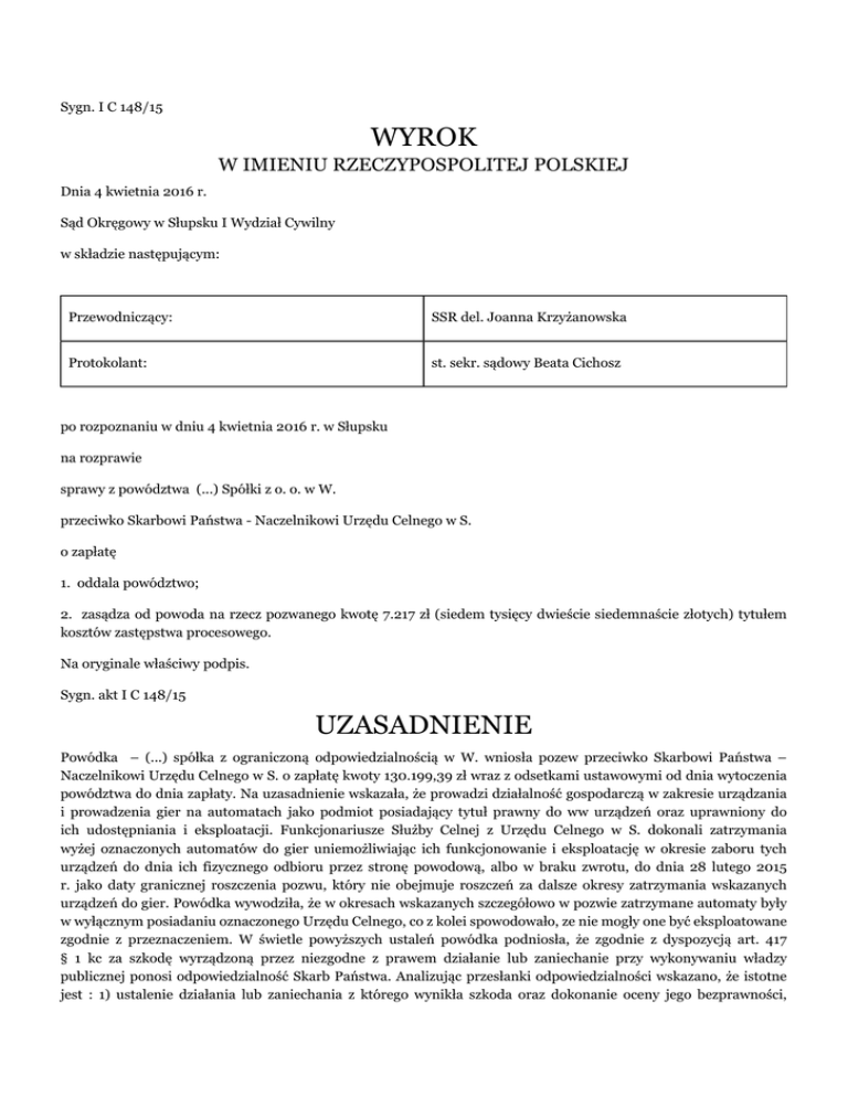 Sygn. I C 148/15 WYROK W IMIENIU RZECZYPOSPOLITEJ POLSKIEJ Dnia 4 kwietnia 2016 r. Sąd Okręgowy w Słupsku I Wydział Cywilny w składzie następującym: Przewodniczący: SSR del. Joanna Krzyżanowska Protokolant: st. sekr. sądowy Beata Cichosz po rozpoznaniu w dniu 4 kwietnia 2016 r. w Słupsku na rozprawie sprawy z powództwa (...) Spółki z o. o. w W. przeciwko Skarbowi Państwa - Naczelnikowi Urzędu Celnego w S. o zapłatę 1. oddala powództwo; 2. zasądza od powoda na rzecz pozwanego kwotę 7.217 zł (siedem tysięcy dwieście siedemnaście złotych) tytułem kosztów zastępstwa procesowego. Na oryginale właściwy podpis. Sygn. akt I C 148/15 UZASADNIENIE Powódka – (...) spółka z ograniczoną odpowiedzialnością w W. wniosła pozew przeciwko Skarbowi Państwa – Naczelnikowi Urzędu Celnego w S. o zapłatę kwoty 130.199,39 zł wraz z odsetkami ustawowymi od dnia wytoczenia powództwa do dnia zapłaty. Na uzasadnienie wskazała, że prowadzi działalność gospodarczą w zakresie urządzania i prowadzenia gier na automatach jako podmiot posiadający tytuł prawny do ww urządzeń oraz uprawniony do ich udostępniania i eksploatacji. Funkcjonariusze Służby Celnej z Urzędu Celnego w S. dokonali zatrzymania wyżej oznaczonych automatów do gier uniemożliwiając ich funkcjonowanie i eksploatację w okresie zaboru tych urządzeń do dnia ich fizycznego odbioru przez stronę powodową, albo w braku zwrotu, do dnia 28 lutego 2015 r. jako daty granicznej roszczenia pozwu, który nie obejmuje roszczeń za dalsze okresy zatrzymania wskazanych urządzeń do gier. Powódka wywodziła, że w okresach wskazanych szczegółowo w pozwie zatrzymane automaty były w wyłącznym posiadaniu oznaczonego Urzędu Celnego, co z kolei spowodowało, ze nie mogły one być eksploatowane zgodnie z przeznaczeniem. W świetle powyższych ustaleń powódka podniosła, że zgodnie z dyspozycją art. 417 § 1 kc za szkodę wyrządzoną przez niezgodne z prawem działanie lub zaniechanie przy wykonywaniu władzy publicznej ponosi odpowiedzialność Skarb Państwa. Analizując przesłanki odpowiedzialności wskazano, że istotne jest : 1) ustalenie działania lub zaniechania z którego wynikła szkoda oraz dokonanie oceny jego bezprawności, 2) następnie ustalenie czy wystąpiła szkoda i jakiego rodzaju, 3) wreszcie zaś zbadanie istnienia pomiędzy nimi normalnego związku przyczynowego. Podstawową przesłankę odpowiedzialności stanowi bezprawność. Została ona ujęta jako „niezgodność z prawem” tj zachowanie sprzeczne z porządkiem prawnym, polegające na sprzeczności pomiędzy zakresem kompetencji organu, sposobem jego postępowania i treścią rozstrzygnięcia wynikającymi z wzorca ustawowego, a jego działaniem rzeczywistym. Przesłanka niezgodności z prawem musi być rozumiana w sposób właściwy dla prawa cywilnego, tj. jako sprzeczność działania lub zaniechania z porządkiem prawnym sensu largo, co wyklucza możliwość jakiejkolwiek dyferencjacji skali czy stopnia bezprawności zachowania. Dochodzone pozwem roszczenie wynika, jak podaje powódka, z zachowań funkcjonariuszy celnych, polegających na zatrzymaniu oznaczonych pozwem automatów do gier, których przyczyną było eksploatowanie tychże automatów poza kasynem gry oraz bez koncesji na prowadzenie kasyna gry, co przez funkcjonariuszy urzędu celnego zostało przyjęte jako naruszenie przepisów u.g.h., które współtworzą zakaz urządzania i prowadzenia gier na automatach losowych poza kasynem gry, w szczególności art. 14 ust. 1 oraz art. 6 ust. 1 u.g.h. czynności zatrzymania automatów zmierzały zatem wprost do zastosowania i wyegzekwowania przedmiotowego zakazu wobec strony powodowej, do uniemożliwienia eksploatacji wymienionych urządzeń. Wg powódki zatrzymanie oznaczonych w pozwie automatów do gier nastąpiło niezgodnie z prawem, pomimo bezskuteczności przepisów współtworzących zestaw znamion czynu zabronionego z art. 107 § 1 kks uwzględniając blankietowy charakter tego przepisu karnego oraz konieczność jego wypełnienia w drodze zastosowania art. 14 ust 1 u.g.h. i subsydiarnego względem niego art. 6 ust 1 u.g.h., które jako nienotyfikowane przepisy techniczne, w braku przekazania Komisji Europejskiej projektu ustawy z dnia 19 listopada 2009 r. o grach hazardowych zgodnie z obowiązkiem wynikającym z art. 8 ust.1 dyrektywy nr 98/34/WE Parlamentu Europejskiego i Rady z dnia 2 czerwca 1998 r. ustanawiającej procedurę udzielenia informacji w dziedzinie norm i przepisów technicznych oraz zasad dotyczących usług społeczeństwa informacyjnego nie mogą być zastosowane wobec strony powodowej, co potwierdza wiążąca wykładnia Trybunału Sprawiedliwości Unii Europejskiej, dokonana wyrokiem dnia 19 lipca 2012 r. w sprawach połączonych (...), (...), i (...), jak również wcześniejszym wyrokiem z dnia 26 października 2006 r. w sprawie (...), co wyklucza zatrzymanie urządzeń oznaczonych pozwem. Powód podniósł, że w świetle orzecznictwa Trybunału środki prawne, które zabraniają korzystania z wszelkich gier elektrycznych, elektromechanicznych i elektronicznych, w tym wszelkich gier komputerowych, we wszystkich miejscach publicznych i prywatnych wyjątkiem kasyn, należy uznać za przepisy techniczne w myśl dyrektywy 98/34/WE. W tych okolicznościach na podstawie art. 8 ust 1 dyrektywy istniał obowiązek przekazania projektu takich przepisów technicznych Komisji Europejskiej. Powódka powołując się na wyrok (...) z dnia 19 lipca 2012 r. wskazała, że zdaniem Trybunału przepis tego rodzaju jak art. 14 ust. 1 ustawy o grach hazardowych, zgodnie z którym urządzanie gier na automatach dozwolone jest jedynie w kasynach gry, należy uznać za „przepis techniczny”. Podobnie za przepis techniczny uznać należy art. 6 ust 1 u.g.h. wobec jego subsydiarnej wobec art. 14 ust. 1 funkcji. Wg powódki brak wymaganego notyfikowania Komisji projektu przepisów technicznych 