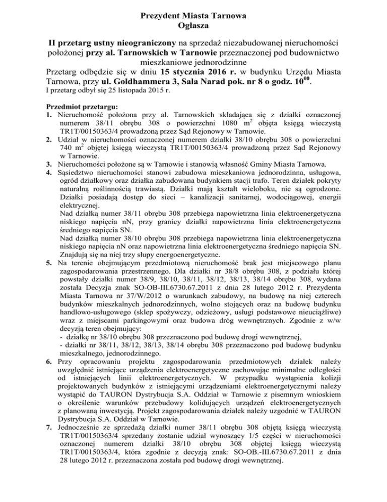 Prezydent Miasta Tarnowa Ogłasza II przetarg ustny nieograniczony na sprzedaż niezabudowanej nieruchomości położonej przy al. Tarnowskich w Tarnowie przeznaczonej pod budownictwo mieszkaniowe jednorodzinne Przetarg odbędzie się w dniu 15 stycznia 2016 r. w budynku Urzędu Miasta Tarnowa, przy ul. Goldhammera 3, Sala Narad pok. nr 8 o godz. 1000. I przetarg odbył się 25 listopada 2015 r. Przedmiot przetargu: 1. Nieruchomość położona przy al. Tarnowskich składająca się z działki oznaczonej numerem 38/11 obrębu 308 o powierzchni 1080 m2 objęta księgą wieczystą TR1T/00150363/4 prowadzoną przez Sąd Rejonowy w Tarnowie. 2. Udział w nieruchomości oznaczonej numerem działki 38/10 obrębu 308 o powierzchni 740 m2 objętej księgą wieczystą TR1T/00150363/4 prowadzoną przez Sąd Rejonowy w Tarnowie. 3. Nieruchomości położone są w Tarnowie i stanowią własność Gminy Miasta Tarnowa. 4. Sąsiedztwo nieruchomości stanowi zabudowa mieszkaniowa jednorodzinna, usługowa, ogród działkowy oraz działka zabudowana budynkiem stacji trafo. Teren działek pokryty naturalną roślinnością trawiastą. Działki mają kształt wieloboku, nie są ogrodzone. Działki posiadają dostęp do sieci – kanalizacji sanitarnej, wodociągowej, energii elektrycznej. Nad działką numer 38/11 obrębu 308 przebiega napowietrzna linia elektroenergetyczna niskiego napięcia nN, przy granicy działki napowietrzna linia elektroenergetyczna średniego napięcia SN. Nad działką numer 38/10 obrębu 308 przebiega napowietrzna linia elektroenergetyczna niskiego napięcia nN oraz napowietrzna linia elektroenergetyczna średniego napięcia SN. Znajdują się na niej trzy słupy energoenergetyczne. 5. Na terenie obejmującym przedmiotową nieruchomość brak jest miejscowego planu zagospodarowania przestrzennego. Dla działki nr 38/8 obrębu 308, z podziału której powstały działki numer 38/9, 38/10, 38/11, 38/12, 38/13, 38/14 obrębu 308, wydana została Decyzja znak SO-OB-III.6730.67.2011 z dnia 28 lutego 2012 r. Prezydenta Miasta Tarnowa nr 37/W/2012 o warunkach zabudowy, na budowę na niej czterech budynków mieszkalnych jednorodzinnych, wolno stojących oraz na budowę budynku handlowo-usługowego (sklep spożywczy, odzieżowy, usługi podstawowe nieuciążliwe) wraz z miejscami parkingowymi oraz budowa dróg wewnętrznych. Zgodnie z w/w decyzją teren obejmujący: - działkę nr 38/10 obrębu 308 przeznaczono pod budowę drogi wewnętrznej, - działki nr 38/11, 38/12, 38/13, 38/14 obrębu 308 przeznaczono pod budowę budynku mieszkalnego, jednorodzinnego. 6. Przy opracowaniu projektu zagospodarowania przedmiotowych działek należy uwzględnić istniejące urządzenia elektroenergetyczne zachowując minimalne odległości od istniejących linii elektroenergetycznych. W przypadku wystąpienia kolizji projektowanych budynków z istniejącymi urządzeniami elektroenergetycznymi należy wystąpić do TAURON Dystrybucja S.A. Oddział w Tarnowie z pisemnym wnioskiem o określenie warunków przebudowy kolidujących urządzeń elektroenergetycznych z planowaną inwestycją. Projekt zagospodarowania działek należy uzgodnić w TAURON Dystrybucja S.A. Oddział w Tarnowie. 7. Jednocześnie ze sprzedażą działki numer 38/11 obrębu 308 objętą księgą wieczystą TR1T/00150363/4 sprzedany zostanie udział wynoszący 1/5 części w nieruchomości oznaczonej numerem działki 38/10 obrębu 308 objętej księgą wieczystą TR1T/00150363/4, która zgodnie z decyzją znak: SO-OB.-III.6730.67.2011 z dnia 28 lutego 2012 r. przeznaczona została pod budowę drogi wewnętrznej. 8. Termin do złożenia wniosku osobom, którym przysługuje pierwszeństwo w nabyciu nieruchomości na podstawie art. 34 ust.1 pkt 1 pkt 2 ustawy z dnia 21 sierpnia 1997 r. o gospodarce nieruchomościami upłynął w dniu 08.10.2015 r. 9. Nieruchomość podlega przepisom ustawy z dnia 03 lutego 1995 roku o ochronie gruntów rolnych i leśnych (Dz. U. z 2013 r. poz. 1205 z późn. zm.). Warunki przetargu: Cena wywoławcza dla nieruchomości wynosi: 123 250 zł brutto, w tym podatek od towarów i usług według stawki 23% (słownie: sto dwadzieścia trzy tysiące dwieście pięćdziesiąt złotych). W przetargu mogą brać udział osoby, które wpłacą wadium w pieniądzu w wysokości 18 488 zł (słownie: osiemnaście tysięcy czterysta osiemdziesiąt osiem złotych) na konto Urzędu Miasta Tarnowa Bank Handlowy w Warszawie Oddział w Rzeszowie Nr 76 1030 1250 0000 0000 8800 0099 w taki sposób, aby najpóźniej w dniu 8 stycznia 2016 roku wadium znajdowało się na rachunku bankowym organizującego przetarg ustny nieograniczony. Za dokonanie wpłaty uważa się dzień wpływu środków pieniężnych na rachunek bankowy tut. Urzędu. Nabywca nieruchomości, ustalony w drodze przetargu ustnego nieograniczonego, zobowiązany będzie do uiszczenia na rzecz Gminy Miasta Tarnowa jednorazowej opłaty w wysokości 10 600 zł brutto, w tym podatek od towarów i usług według stawki 23% (słownie: dziesięć tysięcy sześćset złotych) z tytułu sprzedaży udziału wynoszącego 1/5 części w nieruchomości oznaczonej numerem działki 38/10 obrębu 308, którą zgodnie z decyzją znak: SO-OB.-III.6730.67.2011 z dnia 28 lutego 2012 r. przeznaczono pod budowę drogi wewnętrznej. Opłatę należy uiścić najpóźniej na dzień przed podpisaniem umowy notarialnej dot. sprzedaży przedmiotowej nieruchomości i ustanowienia służebności na rachunku bankowym tut. Urzędu. Wadium wpłacone przez uczestników przetargu po zakończeniu przetargu zostanie niezwłocznie zwrócone na konto oferenta. 2. Wadium wpłacone przez uczestnika, który przetarg wygrał, zalicza się na poczet ceny nabycia nieruchomości w dniu zapłaty pełnej ceny należności. 3. Wadium wpłacone przez uczestnika, który przetarg wygrał ulega przepadkowi w razie uchylenia się uczestnika od zawarcia umowy. 4. Minimalne postąpienie wynosi 1 % ceny wywoławczej z zaok