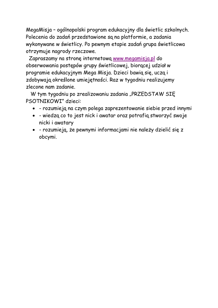 MegaMisja – ogólnopolski program edukacyjny dla świetlic szkolnych. Polecenia do zadań przedstawione są na platformie, a zadania wykonywane w świetlicy. Po pewnym etapie zadań grupa świetlicowa otrzymuje nagrody rzeczowe. Zapraszamy na stronę internetową www.megamisja.pl do obserwowania postępów grupy świetlicowej, biorącej udział w programie edukacyjnym Mega Misja. Dzieci bawią się, uczą i zdobywają określone umiejętności. Raz w tygodniu realizujemy zlecone nam zadanie. W tym tygodniu po zrealizowaniu zadania „PRZEDSTAW SIĘ PSOTNIKOWI” dzieci: - rozumieją na czym polega zaprezentowanie siebie przed innymi - wiedzą co to jest nick i awatar oraz potrafią stworzyć swoje nicki i awatary - rozumieją, że pewnymi informacjami nie należy dzielić się z obcymi.