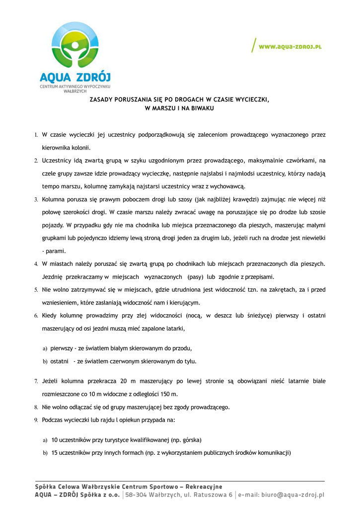 ZASADY PORUSZANIA SIĘ PO DROGACH W CZASIE WYCIECZKI, W MARSZU I NA BIWAKU 1. W czasie wycieczki jej uczestnicy podporządkowują się zaleceniom prowadzącego wyznaczonego przez kierownika kolonii. 2. Uczestnicy idą zwartą grupą w szyku uzgodnionym przez prowadzącego, maksymalnie czwórkami, na czele grupy zawsze idzie prowadzący wycieczkę, następnie najsłabsi i najmłodsi uczestnicy, którzy nadają tempo marszu, kolumnę zamykają najstarsi uczestnicy wraz z wychowawcą. 3. Kolumna porusza się prawym poboczem drogi lub szosy (jak najbliżej krawędzi) zajmując nie więcej niż połowę szerokości drogi. W czasie marszu należy zwracać uwagę na poruszające się po drodze lub szosie pojazdy. W przypadku gdy nie ma chodnika lub miejsca przeznaczonego dla pieszych, maszerując małymi grupkami lub pojedynczo idziemy lewą stroną drogi jeden za drugim lub, jeżeli ruch na drodze jest niewielki - parami. 4. W miastach należy poruszać się zwartą grupą po chodnikach lub miejscach przeznaczonych dla pieszych. Jezdnię przekraczamy w miejscach wyznaczonych (pasy) lub zgodnie z przepisami. 5. Nie wolno zatrzymywać się w miejscach, gdzie utrudniona jest widoczność tzn. na zakrętach, za i przed wzniesieniem, które zasłaniają widoczność nam i kierującym. 6. Kiedy kolumnę prowadzimy przy złej widoczności (nocą, w deszcz lub śnieżycę) pierwszy i ostatni maszerujący od osi jezdni muszą mieć zapalone latarki, a) pierwszy - ze światłem białym skierowanym do przodu, b) ostatni - ze światłem czerwonym skierowanym do tyłu. 7. Jeżeli kolumna przekracza 20 m maszerujący po lewej stronie są obowiązani nieść latarnie białe rozmieszczone co 10 m widoczne z odległości 150 m. 8. Nie wolno odłączać się od grupy maszerującej bez zgody prowadzącego. 9. Podczas wycieczki lub rajdu l opiekun przypada na: a) 10 uczestników przy turystyce kwalifikowanej (np. górska) b) 15 uczestników przy innych formach (np. z wykorzystaniem publicznych środków komunikacji)