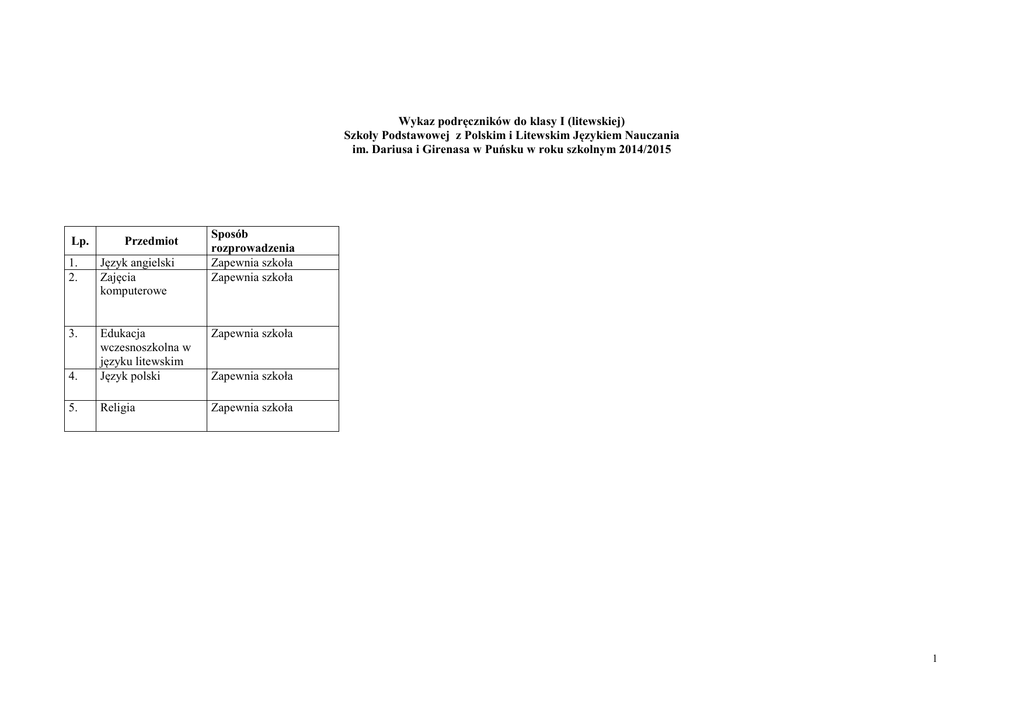 Wykaz podręczników do klasy I (litewskiej) Szkoły Podstawowej z