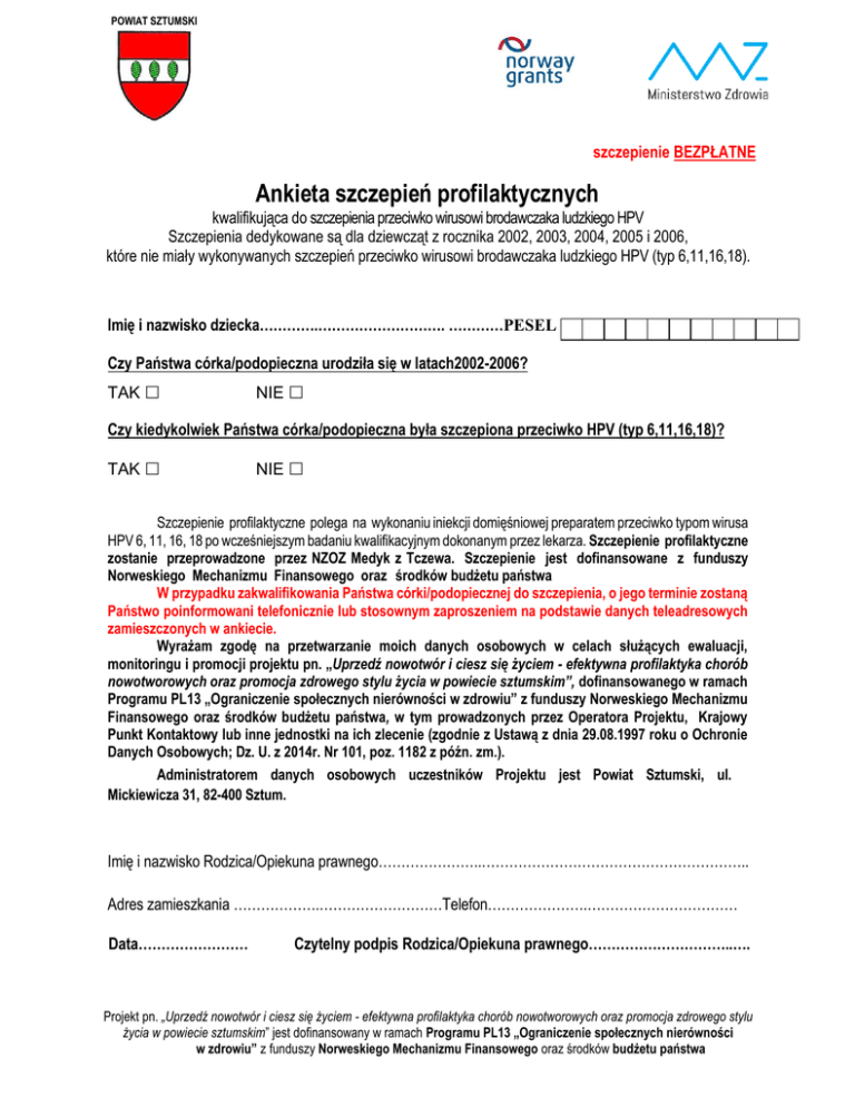 POWIAT SZTUMSKI szczepienie BEZPŁATNE Ankieta szczepień profilaktycznych kwalifikująca do szczepienia przeciwko wirusowi brodawczaka ludzkiego HPV Szczepienia dedykowane są dla dziewcząt z rocznika 2002, 2003, 2004, 2005 i 2006, które nie miały wykonywanych szczepień przeciwko wirusowi brodawczaka ludzkiego HPV (typ 6,11,16,18). Imię i nazwisko dziecka………….………………………. …………PESEL Czy Państwa córka/podopieczna urodziła się w latach2002-2006? TAK NIE Czy kiedykolwiek Państwa córka/podopieczna była szczepiona przeciwko HPV (typ 6,11,16,18)? TAK NIE Szczepienie profilaktyczne polega na wykonaniu iniekcji domięśniowej preparatem przeciwko typom wirusa HPV 6, 11, 16, 18 po wcześniejszym badaniu kwalifikacyjnym dokonanym przez lekarza. Szczepienie profilaktyczne zostanie przeprowadzone przez NZOZ Medyk z Tczewa. Szczepienie jest dofinansowane z funduszy Norweskiego Mechanizmu Finansowego oraz środków budżetu państwa W przypadku zakwalifikowania Państwa córki/podopiecznej do szczepienia, o jego terminie zostaną Państwo poinformowani telefonicznie lub stosownym zaproszeniem na podstawie danych teleadresowych zamieszczonych w ankiecie. Wyrażam zgodę na przetwarzanie moich danych osobowych w celach służących ewaluacji, monitoringu i promocji projektu pn. „Uprzedź nowotwór i ciesz się życiem - efektywna profilaktyka chorób nowotworowych oraz promocja zdrowego stylu życia w powiecie sztumskim”, dofinansowanego w ramach Programu PL13 „Ograniczenie społecznych nierówności w zdrowiu” z funduszy Norweskiego Mechanizmu Finansowego oraz środków budżetu państwa, w tym prowadzonych przez Operatora Projektu, Krajowy Punkt Kontaktowy lub inne jednostki na ich zlecenie (zgodnie z Ustawą z dnia 29.08.1997 roku o Ochronie Danych Osobowych; Dz. U. z 2014r. Nr 101, poz. 1182 z późn. zm.). Administratorem danych osobowych uczestników Projektu jest Powiat Sztumski, ul. Mickiewicza 31, 82-400 Sztum. Imię i nazwisko Rodzica/Opiekuna prawnego…………………..………………………………………………….. Adres zamieszkania ……………….………………………Telefon………………….…………………………… Data…………………… Czytelny podpis Rodzica/Opiekuna prawnego…………………………..…. Projekt pn. „Uprzedź nowotwór i ciesz się życiem - efektywna profilaktyka chorób nowotworowych oraz promocja zdrowego stylu życia w powiecie sztumskim” jest dofinansowany w ramach Programu PL13 „Ograniczenie społecznych nierówności w zdrowiu” z funduszy Norweskiego Mechanizmu Finansowego oraz środków budżetu państwa