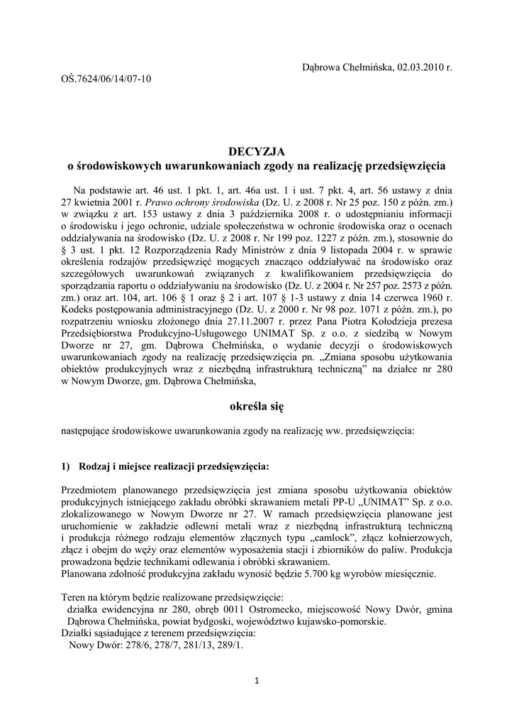 Dąbrowa Chełmińska, 02.03.2010 r. OŚ.7624/06/14/07-10 DECYZJA o środowiskowych uwarunkowaniach zgody na realizację przedsięwzięcia Na podstawie art. 46 ust. 1 pkt. 1, art. 46a ust. 1 i ust. 7 pkt. 4, art. 56 ustawy z dnia 27 kwietnia 2001 r. Prawo ochrony środowiska (Dz. U. z 2008 r. Nr 25 poz. 150 z późn. zm.) w związku z art. 153 ustawy z dnia 3 października 2008 r. o udostępnianiu informacji o środowisku i jego ochronie, udziale społeczeństwa w ochronie środowiska oraz o ocenach oddziaływania na środowisko (Dz. U. z 2008 r. Nr 199 poz. 1227 z późn. zm.), stosownie do § 3 ust. 1 pkt. 12 Rozporządzenia Rady Ministrów z dnia 9 listopada 2004 r. w sprawie określenia rodzajów przedsięwzięć mogących znacząco oddziaływać na środowisko oraz szczegółowych uwarunkowań związanych z kwalifikowaniem przedsięwzięcia do sporządzania raportu o oddziaływaniu na środowisko (Dz. U. z 2004 r. Nr 257 poz. 2573 z późn. zm.) oraz art. 104, art. 106 § 1 oraz § 2 i art. 107 § 1-3 ustawy z dnia 14 czerwca 1960 r. Kodeks postępowania administracyjnego (Dz. U. z 2000 r. Nr 98 poz. 1071 z późn. zm.), po rozpatrzeniu wniosku złożonego dnia 27.11.2007 r. przez Pana Piotra Kołodzieja prezesa Przedsiębiorstwa Produkcyjno-Usługowego UNIMAT Sp. z o.o. z siedzibą w Nowym Dworze nr 27, gm. Dąbrowa Chełmińska, o wydanie decyzji o środowiskowych uwarunkowaniach zgody na realizację przedsięwzięcia pn. „Zmiana sposobu użytkowania obiektów produkcyjnych wraz z niezbędną infrastrukturą techniczną” na działce nr 280 w Nowym Dworze, gm. Dąbrowa Chełmińska, określa się następujące środowiskowe uwarunkowania zgody na realizację ww. przedsięwzięcia: 1) Rodzaj i miejsce realizacji przedsięwzięcia: Przedmiotem planowanego przedsięwzięcia jest zmiana sposobu użytkowania obiektów produkcyjnych istniejącego zakładu obróbki skrawaniem metali PP-U „UNIMAT” Sp. z o.o. zlokalizowanego w Nowym Dworze nr 27. W ramach przedsięwzięcia planowane jest uruchomienie w zakładzie odlewni metali wraz z niezbędną infrastrukturą techniczną i produkcja różnego rodzaju elementów złącznych typu „camlock”, złącz kołnierzowych, złącz i obejm do węży oraz elementów wyposażenia stacji i zbiorników do paliw. Produkcja prowadzona będzie technikami odlewania i obróbki skrawaniem. Planowana zdolność produkcyjna zakładu wynosić będzie 5.700 kg wyrobów miesięcznie. Teren na którym będzie realizowane przedsięwzięcie: działka ewidencyjna nr 280, obręb 0011 Ostromecko, miejscowość Nowy Dwór, gmina Dąbrowa Chełmińska, powiat bydgoski, województwo kujawsko-pomorskie. Działki sąsiadujące z terenem przedsięwzięcia: Nowy Dwór: 278/6, 278/7, 281/13, 289/1. 1 Teren na którym zlokalizowana będzie przedmiotowa inwestycja jest objęty obowiązującym planem zagospodarowania przestrzennego przyjętego Uchwałą Nr XII/94/99 Rady Gminy Dąbrowa Chełmińska z dnia 29 grudnia 1999 r. w sprawie miejscowych planów zagospodarowania przestrzennego terenów w gminie Dąbrowa Chełmińska oraz zmian miejscowego planu ogólnego zagospodarowania przestrzennego gminy Dąbrowa Chełmińska (Dz. Urz. Woj. Kuj-Pom Nr 20, poz. 142 z dnia 09.05.2000 r). Wypis z przepisów szczegółowych planu określa przeznaczenie jako: „G13PU - działka nr ewid. 280 w Nowym Dworze /obręb geodezyjny Ostromecko/ przeznaczona na cele działalności produkcyjnej i usługowej o uciążliwości nie przekraczającej granic działki. Sposób zagospodarowania i wykorzystania terenu działki zgodny jest z zapisami planu miejscowego. 2) warunki wykorzystywania terenu w fazie realizacji i eksploatacji, ze szczególnym uwzględnieniem konieczności ochrony cennych wartości przyrodniczych, zasobów naturalnych i zabytków oraz ograniczenia uciążliwości dla terenów sąsiednich: - W realizacji i eksploatacji przedsięwzięcia należy zwrócić uwagę na zachowanie walorów krajobrazowych i przyrodniczych terenu inwestycji, jak i terenu sąsiadującego z inwestycją. Wszystkie prace należy wykonać w sposób zapewniający ochronę obecnej szaty roślinnej. - Należy zwrócić uwagę, aby podczas prowadzonych prac wdrażających zmianę sposobu użytkowania budynków ograniczyć uciążliwości dla terenów sąsiednich. - Należy wykonać analizę porealizacyjną w zakresie hałasu oraz zanieczyszczeń wprowadzanych do powietrza atmosferycznego w terminie 3 miesięcy od dnia rozpoczęcia użytkowania pomieszczeń produkcyjnych. Szczególną uwagę należy zwrócić na kierunek lokalizacji terenów zabudowy mieszkaniowej. W przypadku przekroczenia wartości dopuszczalnych Inwestor jest zobowiązany do wykonania dodatkowych adaptacji akustycznych lub zmian w procesie technologicznym, które przyczynią się do zmniejszenia emisji hałasu. - Przed rozpoczęciem działalności powodującej powstawanie odpadów Inwestor winien dopełnić formalności dotyczących wytwórcy odpadów wynikających z art. 17 ustawy z dnia 27 kwietnia 2001 r. o odpadach (Dz. U. z 2007 r. Nr 39, poz. 251 z późn. zm.) w dostosowaniu do faktycznej ilości oraz rodzajów odpadów przewidzianych do wytwarzania w fazie eksploatacji przedmiotowej inwestycji. - W związku z planowanym prowadzeniem odzysku odpadów innych niż niebezpieczne na terenie planowanego przedsięwzięcia Inwestor zobowiązany jest do uzyskania zezwolenia na prowadzenie tego rodzaju działalności zgodnie z art. 26 ustawy z dnia 27 kwietnia 2001 r. o odpadach. - Przed oddaniem inwestycji do użytku – Inwestor winien dopełnić wymogów formalnoprawnych dotyczących emisji gazów i pyłów, określonych w art. 80 pkt. 1) ustawy z dnia 27 kwietnia 2001 r. Prawo ochrony środowiska (Dz. U. z 2008 r. Nr 25, poz. 150 z późn. zm.), przy uwzględnieniu treści Rozporządzenia Ministra Środowiska z dnia 22 grudnia 2004 r. w sprawie przypadków, w których wprowadzanie gazów lub pyłów do powietrza z instalacji nie wymaga 