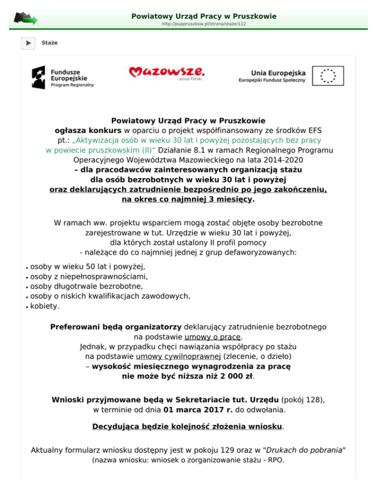 Powiatowy Urząd Pracy w Pruszkowie http://puppruszkow.pl/strona/staże/112 Staże Powiatowy Urząd Pracy w Pruszkowie ogłasza konkurs w oparciu o projekt współfinansowany ze środków EFS pt.: „Aktywizacja osób w wieku 30 lat i powyżej pozostających bez pracy w powiecie pruszkowskim (II)” Działanie 8.1 w ramach Regionalnego Programu Operacyjnego Województwa Mazowieckiego na lata 2014-2020 – dla pracodawców zainteresowanych organizacją stażu dla osób bezrobotnych w wieku 30 lat i powyżej oraz deklarujących zatrudnienie bezpośrednio po jego zakończeniu, na okres co najmniej 3 miesięcy. W ramach ww. projektu wsparciem mogą zostać objęte osoby bezrobotne zarejestrowane w tut. Urzędzie w wieku 30 lat i powyżej, dla których został ustalony II profil pomocy - należące do co najmniej jednej z grup defaworyzowanych: ● ● ● ● ● osoby w wieku 50 lat i powyżej, osoby z niepełnosprawnościami, osoby długotrwale bezrobotne, osoby o niskich kwalifikacjach zawodowych, kobiety. Preferowani będą organizatorzy deklarujący zatrudnienie bezrobotnego na podstawie umowy o pracę. Jednak, w przypadku chęci nawiązania współpracy po stażu na podstawie umowy cywilnoprawnej (zlecenie, o dzieło) – wysokość miesięcznego wynagrodzenia za pracę nie może być niższa niż 2 000 zł. Wnioski przyjmowane będą w Sekretariacie tut. Urzędu (pokój 128), w terminie od dnia 01 marca 2017 r. do odwołania. Decydująca będzie kolejność złożenia wniosku. Aktualny formularz wniosku dostępny jest w pokoju 129 oraz w "Drukach do pobrania" (nazwa wniosku: wniosek o zorganizowanie stażu - RPO. Powiatowy Urząd Pracy w Pruszkowie ogłasza konkurs w ramach projektu współfinansowanego z EFS pt.: „Aktywizacja osób młodych pozostających bez pracy w powiecie pruszkowskim (II)” Poddziałanie 1.1.1 w oparciu o PO WER – dla pracodawców zainteresowanych organizacją stażu dla osób bezrobotnych do 30 roku życia oraz deklarujących zatrudnienie po jego zakończeniu, na okres co najmniej 3 miesięcy. Preferowani będą organizatorzy deklarujący zatrudnienie bezrobotnego na podstawie umowy o pracę. Jednak, w przypadku chęci nawiązania współpracy po stażu na podstawie umowy cywilnoprawnej (zlecenie, o dzieło) – wysokość miesięcznego wynagrodzenia za pracę nie może być niższa niż 2 000 zł. Wnioski przyjmowane będą w Sekretariacie tut. Urzędu (pokój 128), w terminie od dnia 16 stycznia 2017 r. do odwołania. Aktualny formularz wniosku dostępny jest w pokoju 129 oraz w "Drukach do pobrania" (nazwa wniosku: wniosek o zorganizowanie stażu - PO WER). Pruszków, dnia 22 września 2016 r. Powiatowy Urząd Pracy w Pruszkowie ogłasza nabór wniosków dla pracodawców zainteresowanych organizacją stażu dla bezrobotnego. Wnioski przyjmowane będą w Sekretariacie tut. Urzędu (pok. 128 - I piętro) od dnia 26 września 2016 r. do odwołania. Decydująca będzie kolejność złożenia wniosku. Preferowani będą pracodawcy deklarujący zatrudnienie bezrobotnego po zakończeniu realizacji stażu. Aktualny formularz wniosku jest dostępny w pokoju 129 oraz w "Drukach do pobrania" (nazwa wniosku: wniosek o zorganizowanie stażu - Fundusz Pracy). STAŻ To forma aktywizacji, polegająca na skierowaniu bezrobotnego do: » pracodawcy; » przedsiębiorcy niezatrudniającego pracownika na zasadach przewidzianych dla pracodawców; » rolniczej spółdzielni produkcyjnej lub pełnoletniej osoby fizycznej, zamieszkującej i prowadzącej na terytorium RP osobiście i na własny rachunek działalność w zakresie produkcji roślinnej lub zwierzęcej, w tym ogrodniczej, sadowniczej, pszczelarskiej i rybnej, w pozostającym w jej posiadaniu gospodarstwie rolnym obejmującym obszar użytków rolnych o powierzchni przekraczającej 2 ha przeliczeniowe lub prowadzącej dział specjalny produkcji rolnej, o którym mowa w ustawie z dnia 20 grudnia 1990 r. o ubezpieczeniu społecznym rolników (Dz. U. z 2013 r. poz. 1403, 1623 i 1650); » organizacji pozarządowej - w celu nabycia praktycznych umiejętności zawodowych, przygotowujących do samodzielnej pracy na określonym stanowisku (bez nawiązania stosunku pracy z organizatorem). Podmiot zainteresowany organizacją stażu powinien złożyć wniosek o zawarcie umowy o zorganizowanie stażu wraz z kompletem dokumentów - w terminie wyznaczonym przez tut. Urząd. Druk wniosku jest dostępny poniżej. » Wnioski o zawarcie umowy o zorganizowanie stażu są rozpatrywane w terminie miesiąca. » Nieuzupełnione lub niekompletne wnioski zostają rozpatrzone negatywnie. Po pozytywnym rozpatrzeniu wniosku zostaje podpisana umowa pomiędzy starostą, w imieniu którego, na podstawie upoważnienia występuje Dyrektor tut. Urzędu - a organizatorem. Skierowanie bezrobotnego następuje w ramach zawartej umowy, określającej szczegółowe warunki organizacji i realizacji stażu, tj. m. in. stanowisko, program, okres i miejsce odbywania ww. formy oraz dane opiekuna udzielającego bezrobotnemu pomocy i wskazówek w wypełnianiu powierzonych zadań. Do odbycia stażu mogą zostać skierowani wyłącznie bezrobotni objęci II profilem pomocy! Staż może trwać od 3 do 6 miesięcy, a w przypadku osób, które nie ukończyły 30 roku życia - od 3 do 12 miesięcy. O długości trwania stażu decyduje tut. Urząd, gdyż jest ona uzależniona od ilości posiadanych funduszy przeznaczonych na ten cel. Osobom odbywającym przysługuje: » stypendium w wysokości 120% zasiłku dla bezrobotnych, tj. od dnia 01 czerwca 2014 r. kwota 997,40 złotych (brutto) za pełny miesiąc stażu; » 2 dni wolne za każde 30 dni kalendarzowych odbywania stażu. Więcej informacji odnośnie organizacji stażu można uzyskać pod numerem telefonu: (22) 770-20-40 lub bezpośrednio w pokoju nr 129 tut. Urzędu (I piętro).
