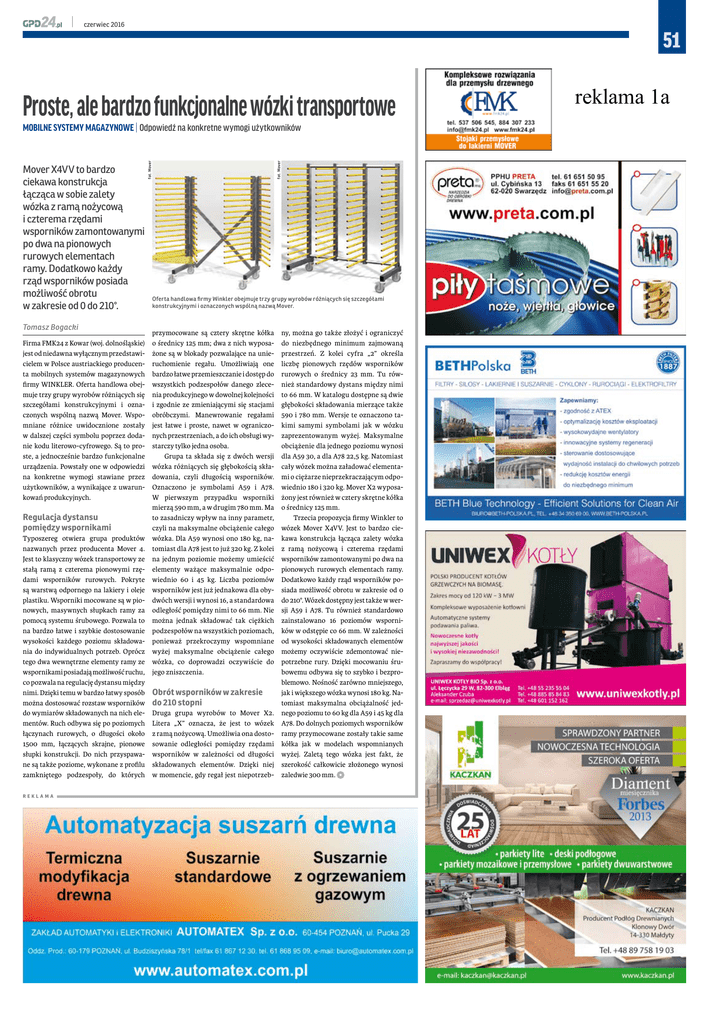 czerwiec 2016 51 Proste, ale bardzo funkcjonalne wózki transportowe Tomasz Bogacki fot. Mover Mover X4VV to bardzo ciekawa konstrukcja łącząca w sobie zalety wózka z ramą nożycową i czterema rzędami wsporników zamontowanymi po dwa na pionowych rurowych elementach ramy. Dodatkowo każdy rząd wsporników posiada możliwość obrotu w zakresie od 0 do 210°. fot. Mover Mobilne systemy magazynowe | Odpowiedź na konkretne wymogi użytkowników Oferta handlowa firmy Winkler obejmuje trzy grupy wyrobów różniących się szczegółami konstrukcyjnymi i oznaczonych wspólną nazwą Mover. przymocowane są cztery skrętne kółka o średnicy 125 mm; dwa z nich wyposażone są w blokady pozwalające na unieruchomienie regału. Umożliwiają one bardzo łatwe przemieszczanie i dostęp do wszystkich podzespołów danego zlecenia produkcyjnego w dowolnej kolejności i zgodnie ze zmieniającymi się stacjami obróbczymi. Manewrowanie regałami jest łatwe i proste, nawet w ograniczonych przestrzeniach, a do ich obsługi wystarczy tylko jedna osoba. Grupa ta składa się z dwóch wersji wózka różniących się głębokością składowania, czyli długością wsporników. Oznaczono je symbolami A59 i A78. W pierwszym przypadku wsporniki mierzą 590 mm, a w drugim 780 mm. Ma to zasadniczy wpływ na inny parametr, czyli na maksymalne obciążenie całego wózka. Dla A59 wynosi ono 180 kg, natomiast dla A78 jest to już 320 kg. Z kolei na jednym poziomie możemy umieścić elementy ważące maksymalnie odpowiednio 60 i 45 kg. Liczba poziomów wsporników jest już jednakowa dla obydwóch wersji i wynosi 16, a standardowa odległość pomiędzy nimi to 66 mm. Nie można jednak składować tak ciężkich podzespołów na wszystkich poziomach, ponieważ przekroczymy wspomniane wyżej maksymalne obciążenie całego wózka, co doprowadzi oczywiście do jego zniszczenia. ny, można go także złożyć i ograniczyć do niezbędnego minimum zajmowaną przestrzeń. Z kolei cyfra „2” określa liczbę pionowych rzędów wsporników rurowych o średnicy 23 mm. Tu również standardowy dystans między nimi to 66 mm. W katalogu dostępne są dwie głębokości składowania mierzące także 590 i 780 mm. Wersje te oznaczono takimi samymi symbolami jak w wózku zaprezentowanym wyżej. Maksymalne obciążenie dla jednego poziomu wynosi dla A59 30, a dla A78 22,5 kg. Natomiast cały wózek można załadować elementami o ciężarze nieprzekraczającym odpowiednio 180 i 320 kg. Mover X2 wyposażony jest również w cztery skrętne kółka o średnicy 125 mm. Regulacja dystansu Trzecia propozycja firmy Winkler to pomiędzy wspornikami wózek Mover X4VV. Jest to bardzo cieTyposzereg otwiera grupa produktów kawa konstrukcja łącząca zalety wózka nazwanych przez producenta Mover 4. z ramą nożycową i czterema rzędami Jest to klasyczny wózek transportowy ze wsporników zamontowanymi po dwa na stałą ramą z czterema pionowymi rzępionowych rurowych elementach ramy. dami wsporników rurowych. Pokryte Dodatkowo każdy rząd wsporników posą warstwą odpornego na lakiery i oleje siada możliwość obrotu w zakresie od 0 plastiku. Wsporniki mocowane są w piodo 210°. Wózek dostępny jest także w wernowych, masywnych słupkach ramy za sji A59 i A78. Tu również standardowo pomocą systemu śrubowego. Pozwala to zainstalowano 16 poziomów wspornina bardzo łatwe i szybkie dostosowanie ków w odstępie co 66 mm. W zależności wysokości każdego poziomu składowaod wysokości składowanych elementów nia do indywidualnych potrzeb. Oprócz możemy oczywiście zdemontować nietego dwa wewnętrzne elementy ramy ze potrzebne rury. Dzięki mocowaniu śruwspornikami posiadają możliwość ruchu, bowemu odbywa się to szybko i bezproco pozwala na regulację dystansu między blemowo. Nośność zarówno mniejszego, nimi. Dzięki temu w bardzo łatwy sposób Obrót wsporników w zakresie jak i większego wózka wynosi 180 kg. Namożna dostosować rozstaw wsporników do 210 stopni tomiast maksymalna obciążalność jeddo wymiarów składowanych na nich ele- Druga grupa wyrobów to Mover X2. nego poziomu to 60 kg dla A59 i 45 kg dla mentów. Ruch odbywa się po poziomych Litera „X” oznacza, że jest to wózek A78. Do dolnych poziomych wsporników łączynach rurowych, o długości około z ramą nożycową. Umożliwia ona dosto- ramy przymocowane zostały takie same 1500 mm, łączących skrajne, pionowe sowanie odległości pomiędzy rzędami kółka jak w modelach wspomnianych słupki konstrukcji. Do nich przyspawa- wsporników w zależności od długości wyżej. Zaletą tego wózka jest fakt, że ne są także poziome, wykonane z profilu składowanych elementów. Dzięki niej szerokość całkowicie złożonego wynosi zamkniętego podzespoły, do których w momencie, gdy regał jest niepotrzeb- zaledwie 300 mm. l Firma FMK24 z Kowar (woj. dolnośląskie) jest od niedawna wyłącznym przedstawicielem w Polsce austriackiego producenta mobilnych systemów magazynowych firmy WINKLER. Oferta handlowa obejmuje trzy grupy wyrobów różniących się szczegółami konstrukcyjnymi i oznaczonych wspólną nazwą Mover. Wspomniane różnice uwidocznione zostały w dalszej części symbolu poprzez dodanie kodu literowo-cyfrowego. Są to proste, a jednocześnie bardzo funkcjonalne urządzenia. Powstały one w odpowiedzi na konkretne wymogi stawiane przez użytkowników, a wynikające z uwarunkowań produkcyjnych. REKLAMA reklama 1a