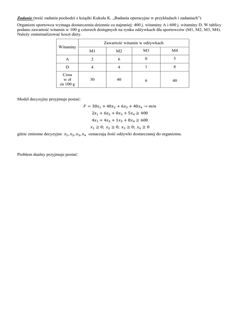 Zadanie (treść zadania pochodzi z książki Kukuła K. „Badania operacyjne w przykładach i zadaniach”) Organizm sportowca wymaga dostarczenia dziennie co najmniej: 400 j. witaminy A i 600 j. witaminy D. W tablicy podano zawartość witamin w 100 g czterech dostępnych na rynku odżywkach dla sportowców (M1, M2, M3, M4). Należy zminimalizować koszt diety. Zawartość witamin w odżywkach Witaminy M1 M2 M3 M4 A 2 6 0 5 D 4 4 1 8 Cena w zł za 100 g 30 40 6 40 Model decyzyjny przyjmuje postać: 𝐹 = 30𝑥1 + 40𝑥2 + 6𝑥3 + 40𝑥4 → 𝑚𝑖𝑛 2𝑥1 + 6𝑥2 + 0𝑥3 + 5𝑥4 ≥ 400 4𝑥1 + 4𝑥2 + 1𝑥3 + 8𝑥4 ≥ 600 𝑥1 ≥ 0; 𝑥2 ≥ 0; 𝑥3 ≥ 0; 𝑥4 ≥ 0 gdzie zmienne decyzyjne 𝑥1 , 𝑥2 , 𝑥3 , 𝑥4 oznaczają ilość odżywki dostarczanej do organizmu. Problem dualny przyjmuje postać: Rozwiązanie graficzne problemu dualnego: Rozwiązanie problemu pierwotnego na podstawie rozwiązania problemu dualnego.