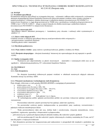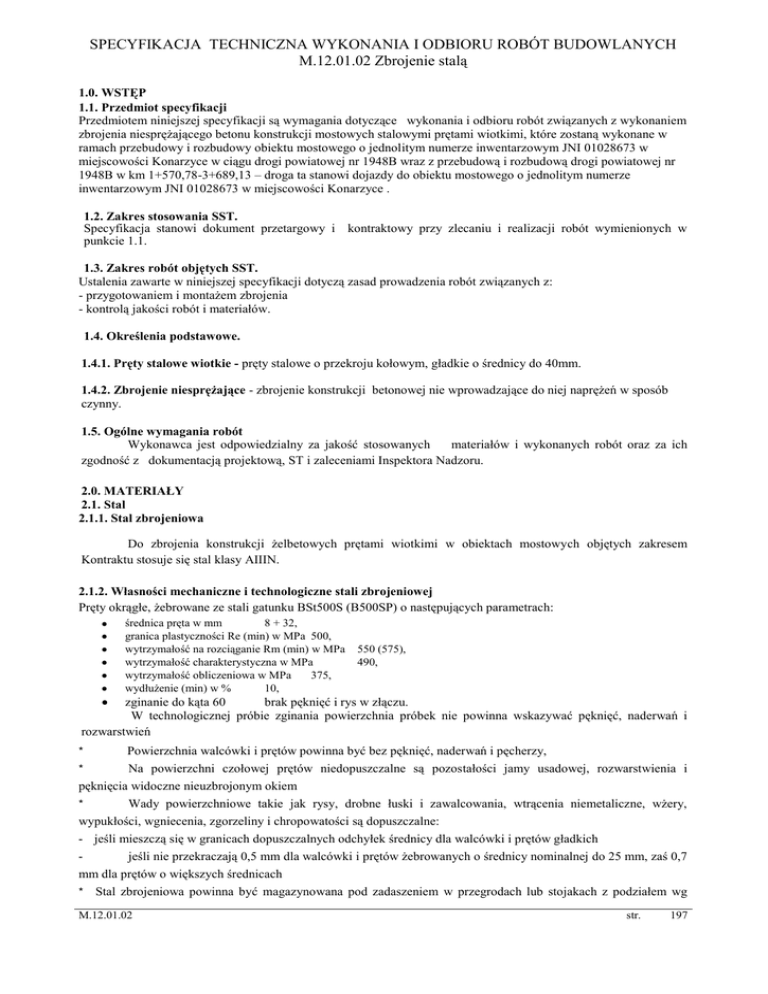 SPECYFIKACJA TECHNICZNA WYKONANIA I ODBIORU ROBÓT BUDOWLANYCH M.12.01.02 Zbrojenie stalą 1.0. WSTĘP 1.1. Przedmiot specyfikacji Przedmiotem niniejszej specyfikacji są wymagania dotyczące wykonania i odbioru robót związanych z wykonaniem zbrojenia niesprężającego betonu konstrukcji mostowych stalowymi prętami wiotkimi, które zostaną wykonane w ramach przebudowy i rozbudowy obiektu mostowego o jednolitym numerze inwentarzowym JNI 01028673 w miejscowości Konarzyce w ciągu drogi powiatowej nr 1948B wraz z przebudową i rozbudową drogi powiatowej nr 1948B w km 1+570,78-3+689,13 – droga ta stanowi dojazdy do obiektu mostowego o jednolitym numerze inwentarzowym JNI 01028673 w miejscowości Konarzyce . 1.2. Zakres stosowania SST. Specyfikacja stanowi dokument przetargowy i kontraktowy przy zlecaniu i realizacji robót wymienionych w punkcie 1.1. 1.3. Zakres robót objętych SST. Ustalenia zawarte w niniejszej specyfikacji dotyczą zasad prowadzenia robót związanych z: - przygotowaniem i montażem zbrojenia - kontrolą jakości robót i materiałów. 1.4. Określenia podstawowe. 1.4.1. Pręty stalowe wiotkie - pręty stalowe o przekroju kołowym, gładkie o średnicy do 40mm. 1.4.2. Zbrojenie niesprężające - zbrojenie konstrukcji betonowej nie wprowadzające do niej naprężeń w sposób czynny. 1.5. Ogólne wymagania robót Wykonawca jest odpowiedzialny za jakość stosowanych materiałów i wykonanych robót oraz za ich zgodność z dokumentacją projektową, ST i zaleceniami Inspektora Nadzoru. 2.0. MATERIAŁY 2.1. Stal 2.1.1. Stal zbrojeniowa Do zbrojenia konstrukcji żelbetowych prętami wiotkimi w obiektach mostowych objętych zakresem Kontraktu stosuje się stal klasy AIIIN. 2.1.2. Własności mechaniczne i technologiczne stali zbrojeniowej Pręty okrągłe, żebrowane ze stali gatunku BSt500S (B500SP) o następujących parametrach: średnica pręta w mm 8 + 32, granica plastyczności Re (min) w MPa 500, wytrzymałość na rozciąganie Rm (min) w MPa wytrzymałość charakterystyczna w MPa wytrzymałość obliczeniowa w MPa 375, wydłużenie (min) w % 10, 550 (575), 490, zginanie do kąta 60 brak pęknięć i rys w złączu. W technologicznej próbie zginania powierzchnia próbek nie powinna wskazywać pęknięć, naderwań i rozwarstwień Powierzchnia walcówki i prętów powinna być bez pęknięć, naderwań i pęcherzy, * Na powierzchni czołowej prętów niedopuszczalne są pozostałości jamy usadowej, rozwarstwienia i pęknięcia widoczne nieuzbrojonym okiem * Wady powierzchniowe takie jak rysy, drobne łuski i zawalcowania, wtrącenia niemetaliczne, wżery, wypukłości, wgniecenia, zgorzeliny i chropowatości są dopuszczalne: - jeśli mieszczą się w granicach dopuszczalnych odchyłek średnicy dla walcówki i prętów gładkich * jeśli nie przekraczają 0,5 mm dla walcówki i prętów żebrowanych o średnicy nominalnej do 25 mm, zaś 0,7 mm dla prętów o większych średnicach * Stal zbrojeniowa powinna być magazynowana pod zadaszeniem w przegrodach lub stojakach z podziałem wg - M.12.01.02 str. 197 wymiarów i gatunków. 2.2. Drut montażowy Do montażu prętów zbrojenia należy używać wyżarzonego drutu stalowego tzw, wiązałkowego jeżeli nie stosuje się połączeń spawanych lub zgrzewanych. 2.3. Podkładki dystansowe Dopuszcza się stosowanie stabilizatorów i podkładek dystansowych z betonu lub zaprawy i z tworzyw sztucznych. Podkładki dystansowe muszą być przymocowane do prętów. Nie dopuszcza się stosowania prętów stalowych jako podkładki dystansowe. 3.0. SPRZĘT Sprzęt używany przy przygotowaniu i montażu zbrojenia wiotkiego w mostowych konstrukcjach powinien spełniać wymagania obowiązujące w budownictwie ogólnym. 4.0. TRANSPORT Przy transporcie stali jak również prefabrykatów transporcie drogowym i kolejowym. zbrojeniowych należy przestrzegać zasad obowiązujących w 5.0. WYKONANIE ROBÓT 5.1. Przygotowanie zbrojenia 5.1.1. Czyszczenie prętów Pręty zatłuszczone lub zabrudzone farbami można opalić lampami benzynowymi lub czyścić preparatami rozpuszczającymi tłuszcz. Stal narażoną na choćby chwilowy kontakt ze słoną wodą zmyć wodą słodką. Stal pokrytą łuszczącą się rdzą czyścić szczotkami drucianymi ręcznie lub mechanicznie lub też poddać piaskowaniu. Po oczyszczeniu należy sprawdzić średnice prętów. Pręty oblodzone odmraża się strumieniem ciepłej wody. 5.1.2. Prostowanie prętów Dopuszczalna wielkość miejscowego odchylenia od linii prostej wynosi 4mm. Dopuszcza się prostowanie prętów za pomocą kluczy, młotków, wciągarek. 5.1.3. Cięcie prętów zbrojeniowych Pręty ucina się z dokładnością do l,0cm. Cięcia dokonuje się przy użyciu mechanicznych noży. Dopuszcza się cięcie palnikiem acetylenowym. Należy ucinać pręty krótsze od długości podanej w projekcie o wydłużenie zależne od wielkości i ilości odgięć. Wydłużenia prętów ( cm ) powstające podczas odginania o dany kąt podaje poniższa tabela. Średnica Pręta Mm Kąt odgięcia 45' 90° 135° 180° 6 - 0,5 0,5 1,0 8 10 12 14 16 20 22 25 27 30 0,5 0,5 0,5 0,5 1,0 1,0 1,5 2,0 2,5 1,0 1,0 1,0 1,5 1,5 1,5 2,0 2,5 3,0 3,5 1,0 1,0 1,0 1,5 1,5 2,0 3,0 3,5 4,0 5,0 1,0 1,5 1,5 2,0 2,5 3,0 4,0 4,5 5,0 6,0 5.1.4. Odgięcia prętów, haki Średnica pręta zaginanego mm d< 10 M.12.01.02 Stal gładka miękka Rak = 240 MPa Do=3d str. 198 d - oznacza średnicę pręta Na zimno na budowie można wykonywać odgięcia prętów średnicy d < 12mm. Pręty o średnicy d> 12mm powinny być odginane z kontrolowanym podgrzewaniem. Wewnętrzna średnica odgięcia prętów zbrojenia głównego, poza odgięciem w obrębie haka powinna być mniejsza niż 5 d dla stali klasy A-0 i A-I. 5.2. Montaż zbrojenia 5.2.1. Wymagania ogólne Do zbrojenia betonu: • - stosować stal spawalną • - stosować stal pokrytą co najwyżej nalotem nie łuszczącej się rdzy • - można stosować pręty o innej średnicy i innym gat