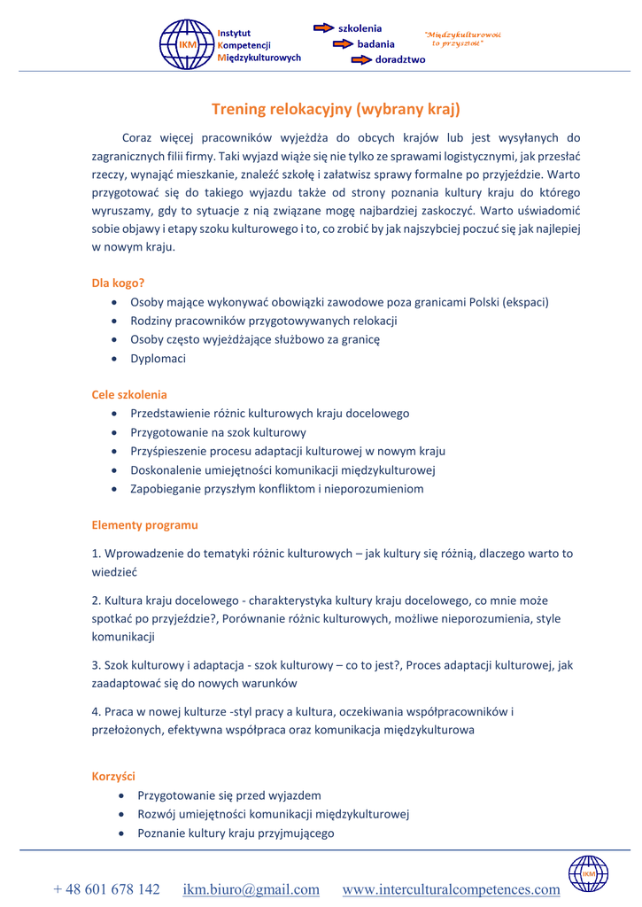 Trening relokacyjny (wybrany kraj) Coraz więcej pracowników wyjeżdża do obcych krajów lub jest wysyłanych do zagranicznych filii firmy. Taki wyjazd wiąże się nie tylko ze sprawami logistycznymi, jak przesłać rzeczy, wynająć mieszkanie, znaleźć szkołę i załatwisz sprawy formalne po przyjeździe. Warto przygotować się do takiego wyjazdu także od strony poznania kultury kraju do którego wyruszamy, gdy to sytuacje z nią związane mogę najbardziej zaskoczyć. Warto uświadomić sobie objawy i etapy szoku kulturowego i to, co zrobić by jak najszybciej poczuć się jak najlepiej w nowym kraju. Dla kogo? Osoby mające wykonywać obowiązki zawodowe poza granicami Polski (ekspaci) Rodziny pracowników przygotowywanych relokacji Osoby często wyjeżdżające służbowo za granicę Dyplomaci Cele szkolenia Przedstawienie różnic kulturowych kraju docelowego Przygotowanie na szok kulturowy Przyśpieszenie procesu adaptacji kulturowej w nowym kraju Doskonalenie umiejętności komunikacji międzykulturowej Zapobieganie przyszłym konfliktom i nieporozumieniom Elementy programu 1. Wprowadzenie do tematyki różnic kulturowych – jak kultury się różnią, dlaczego warto to wiedzieć 2. Kultura kraju docelowego - charakterystyka kultury kraju docelowego, co mnie może spotkać po przyjeździe?, Porównanie różnic kulturowych, możliwe nieporozumienia, style komunikacji 3. Szok kulturowy i adaptacja - szok kulturowy – co to jest?, Proces adaptacji kulturowej, jak zaadaptować się do nowych warunków 4. Praca w nowej kulturze -styl pracy a kultura, oczekiwania współpracowników i przełożonych, efektywna współpraca oraz komunikacja międzykulturowa Korzyści Przygotowanie się przed wyjazdem Rozwój umiejętności komunikacji międzykulturowej Poznanie kultury kraju przyjmującego + 48 601 678 142 [email protected] www.interculturalcompetences.com