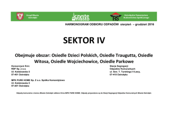 HARMONOGRAM ODBIORU ODPADÓW sierpień – grudzień 2016 SEKTOR IV Obejmuje obszar: Osiedle Dzieci Polskich, Osiedle Traugutta, Osiedle Witosa, Osiedle Wojciechowice, Osiedle Parkowe Konsorcjum firm: RDF Sp. z o.o. Ul. Kołobrzeska 5 07-401 Ostrołęka Stacja Segregacji Odpadów Komunalnych ul. Gen. T. Turskiego 4 Ławy, 07-410 Ostrołęka MPK PURE HOME Sp. Z o.o. Spółka Komandytowa Ul. Kołobrzeska 5 07-401 Ostrołęka Odpady komunalne z terenu Miasta Ostrołęki odbiera firma MPK PURE HOME. Odpady przywożone są do Stacji Segregacji Odpadów Komunalnych Miasta Ostrołęki. ZABUDOWA JEDNORODZINNA MIESIĄCE ODPADY KOMUNALNE ZMIESZANE pojemnik czarny odbiór raz na dwa tygodnie Sierpień 2016 Wrzesień 2016 Październik 2016 ODPADY ODPADY ODPADY SELEKTYWNE SELEKTYWNE SELEKTYWNE TWORZYWA PAPIER - pojemnik SZKŁO - pojemnik SZTUCZNE, METALE niebieski zielony pojemnik żółty odbiór odbiór odbiór raz w miesiącu raz w miesiącu raz w miesiącu ODPADY BIODEGRADOWALNE pojemnik brązowy odbiór raz na dwa tygodnie 8 22 19 19 19 8 22 5 19 16 16 16 5 19 28 28 28 3 14 3 17 31 Listopad 2016 14 28 18 18 18 Grudzień 2016 12 29* 16 16 16 12 17 31 ODPADY WIELKOGABARYTO WE odbiór dwa razy w roku 3 28 29* Wykaz obsługiowanych ulic: OSIEDLE DZIECI POLSKICH: 11 Listopada (numery nieparzyste od 23 do 59), Baśniowa, Dzieci Polskich, Gen. Józefa Hallera (numery nieparzyste), Guliwera, Kubusia Puchatka, Skrzatów, Syreny, Wodnika OSIEDLE TRAUGUTTA: 22 Lipca, Bojowników, Ciasna, Czeczotka, Dolna, Kaszubska, Gen. Ludwika Kickiego, Kujawska, Kurpiowska, Mazurska, Mostowa (numery nieparzyste), Obrońców, Pionierów, Podchorążych, Poległych, Pomorska, Płk. Edwarda Filochowskiego „Sana”, Płk. Stefana Chomicza, Szarych Szeregów, Szpitalna (numery parzyste od 24 do końca i numery nieparzyste od 15 do końca), Śląska, Romualda Traugutta (numery nieparzyste), Walecznych, Warmińska, Wioślarska, Zwycięzców, Żuławska OSIEDLE WITOSA: Aleja Solidarności, Bohaterów Westerplatte, Celna, Graniczna, Jaśminowa, Stefana Kijaka, Konwaliowa, 11 Listopada (numery nieparzyste od 61 do końca), Lokalna, Ławska, Mleczna, Olimpijska, Ostrowska (numery nieparzyste od 1 do 11), Oświatowa, Poziomkowa, Tadeusza Zawadzkiego „Zośki”, Targowa, Romualda Traugutta (numery parzyste od 32 do końca), Wincentego Witosa (numery nieparzyste), Wrzosowa, Zielona. OSIEDLE WOJCIECHOWICE: 5. Pułku Ułanów , Batalionu Czwartaków, Braterstwa Broni, Budowlanych, Elektryczna, Energetyczna, Fabryczna, Gen. Józefa Sowińskiego, Gen. Kazimierza Pułaskiego, Gen. Tomasza Turskiego, I Armii Wojska Polskiego, Jasna, Kołobrzeska, Konstantego Ildefonsa Gałczyńskiego, Koszarowa, Krańcowa, Ks. Antoniego Pęksy, Ks. Jana Krzemińskiego, Legionowa, Łomżyńska, Łużycka, Partyzantów, Piękna, Środkowa, Wiaduktowa, Wiery Bielik i Tatiany Makarowej, Wspólna, Władysława Broniewskiego. OSIEDLE PARKOWE: 26 Maja, Adama Chętnika, Celulozowa, Dr Józefa Psarskiego, Gen. Henryka Kamieńskiego, Gen. Józefa Hallera (numery parzyste od 2 do 8), Gen. Ludwika Bogusławskiego (numery nieparzyste od 1 do 19), Marszałka Józefa Piłsudskiego (numery nieparzyste), Oskara Kolberga, Papiernicza, Parkowa, Romualda Traugutta (numery parzyste od 2 do 30), Sędziego Tomasza Gocłowskiego, Sportowa, Szkolna, Tadeusza Sygietyńskiego, Wincentego Witosa (numery parzyste) Odpady komunalne z terenu Miasta Ostrołęki odbiera firma MPK PURE HOME. Odpady przywożone są do Stacji Segregacji Odpadów Komunalnych Miasta Ostrołęki. ZABUDOWA WIELORODZINNA MIESIĄCE ODPADY KOMUNALNE ZMIESZANE pojemnik czarny odbiór dwa razy w tygodniu ODPADY ODPADY ODPADY SELEKTYWNE SELEKTYWNE SELEKTYWNE PAPIER - pojemnik SZKŁO - pojemnik TWORZYWA niebieski zielony SZTUCZNE, METALE odbiór odbiór pojemnik żółty odbiór raz w tygodniu raz w tygodniu raz w tygodniu ODPADY BIODEGRADOWALNE pojemnik brązowy odbiór dwa razy w tygodniu ODPADY WIELKOGABARYTO WE 2..5..9..12..16..19..23..26..30 8 Sierpień 2016 2..5..9..12..16..19..23..26..30 2 9 16 23 30 5..12..19..26 Wrzesień 2016 2..6..9..13..16..20..23..27..30 6 13 20 27 2..9..16..23..30 5 12 19 26 2..6..9..13..16..20..23..27..30 19 4..7..11..14..18..21..25..28 4 11 18 25 7..14..21..28 3 10 17 24 31 4..7..11..14..18..21..25..28 24 Listopad 2016 2*..4..8..10*..15..18..22..25..29 2* 8 15 22 29 4..10*..18..25 7 14 21 28 2*..4..8..10*..15..18..22..25..29 14 Grudzień 2016 2..6..9..13..16..20..22*..23..27*..30 6 13 20 27 2..9..16..23..30 5 12 19 27* 2..6..9..13..16..20..22*..23..27*..30 12 Październik 2016 1 8 17* 22 29 Wykaz obsługiowanych ulic: OSIEDLE DZIECI POLSKICH: 11 Listopada (numery nieparzyste od 23 do 59), Baśniowa, Dzieci Polskich, Gen. Józefa Hallera (numery nieparzyste), Guliwera, Kubusia Puchatka, Skrzatów, Syreny, Wodnika OSIEDLE TRAUGUTTA: 22 Lipca, Bojowników, Ciasna, Czeczotka, Dolna, Kaszubska, Gen. Ludwika Kickiego, Kujawska, Kurpiowska, Mazurska, Mostowa (numery nieparzyste), Obrońców, Pionierów, Podchorążych, Poległych, Pomorska, Płk. Edwarda Filochowskiego „Sana”, Płk. Stefana Chomicza, Szarych Szeregów, Szpitalna (numery parzyste od 24 do końca i numery nieparzyste od 15 do końca), Śląska, Romualda Traugutta (numery nieparzyste), Walecznych, Warmińska, Wioślarska, Zwycięzców, Żuławska OSIEDLE WITOSA: Aleja Solidarności, Bohaterów Westerplatte, Celna, Graniczna, Jaśminowa, Stefana Kijaka, Konwaliowa, 11 Listopada (numery nieparzyste od 61 do końca), Lokalna, Ławska, Mleczna, Olimpijska, Ostrowska (numery nieparzyste od 1 do 11), Oświatowa, Poziomkowa, Tadeusza Zawadzkiego „Zośki”, Targowa, Romualda Traugutta (numery parzyste od 32 do końca), Wincentego Witosa (numery nieparzyste), Wrzosowa, Zielona. OSIEDLE WOJCIECHOWICE: 5. Pułku Ułanów , Batalionu Czwartaków, Braterstwa Broni, Budowlanych, Elektryczna, Energetyczna, Fabryczna, Gen. Józefa Sowińskiego, Gen. Kazimierza Pułaskiego, Gen. Tomasza Turskiego, I Armii Wojska Polskiego, Jasna, Koło