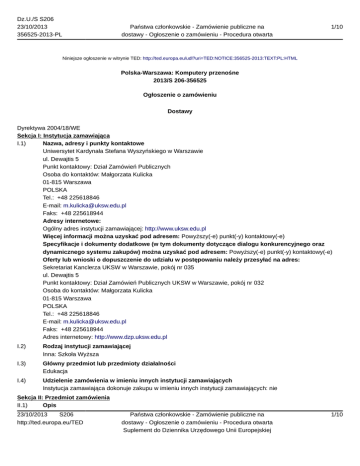 Dz.U./S S206 23/10/2013 356525-2013-PL Państwa członkowskie - Zamówienie publiczne na dostawy - Ogłoszenie o zamówieniu - Procedura otwarta 1/10 Niniejsze ogłoszenie w witrynie TED: http://ted.europa.eu/udl?uri=TED:NOTICE:356525-2013:TEXT:PL:HTML Polska-Warszawa: Komputery przenośne 2013/S 206-356525 Ogłoszenie o zamówieniu Dostawy Dyrektywa 2004/18/WE Sekcja I: Instytucja zamawiająca I.1) Nazwa, adresy i punkty kontaktowe Uniwersytet Kardynała Stefana Wyszyńskiego w Warszawie ul. Dewajtis 5 Punkt kontaktowy: Dział Zamówień Publicznych Osoba do kontaktów: Małgorzata Kulicka 01-815 Warszawa POLSKA Tel.: +48 225618846 E-mail: [email protected] Faks: +48 225618944 Adresy internetowe: Ogólny adres instytucji zamawiającej: http://www.uksw.edu.pl Więcej informacji można uzyskać pod adresem: Powyższy(-e) punkt(-y) kontaktowy(-e) Specyfikacje i dokumenty dodatkowe (w tym dokumenty dotyczące dialogu konkurencyjnego oraz dynamicznego systemu zakupów) można uzyskać pod adresem: Powyższy(-e) punkt(-y) kontaktowy(-e) Oferty lub wnioski o dopuszczenie do udziału w postępowaniu należy przesyłać na adres: Sekretariat Kanclerza UKSW w Warszawie, pokój nr 035 ul. Dewajtis 5 Punkt kontaktowy: Dział Zamówień Publicznych UKSW w Warszawie, pokój nr 032 Osoba do kontaktów: Małgorzata Kulicka 01-815 Warszawa POLSKA Tel.: +48 225618846 E-mail: [email protected] Faks: +48 225618944 Adres internetowy: http://www.dzp.uksw.edu.pl I.2) Rodzaj instytucji zamawiającej Inna: Szkoła Wyższa I.3) Główny przedmiot lub przedmioty działalności Edukacja I.4) Udzielenie zamówienia w imieniu innych instytucji zamawiających Instytucja zamawiająca dokonuje zakupu w imieniu innych instytucji zamawiających: nie Sekcja II: Przedmiot zamówienia II.1) Opis 23/10/2013 S206 http://ted.europa.eu/TED Państwa członkowskie - Zamówienie publiczne na dostawy - Ogłoszenie o zamówieniu - Procedura otwarta Suplement do Dziennika Urzędowego Unii Europejskiej 1/10 Dz.U./S S206 23/10/2013 356525-2013-PL Państwa członkowskie - Zamówienie publiczne na dostawy - Ogłoszenie o zamówieniu - Procedura otwarta 2/10 II.1.1) Nazwa nadana zamówieniu przez instytucję zamawiającą: Dostawa sprzętu komputerowego i sieciowego. II.1.2) Rodzaj zamówienia oraz lokalizacja robót budowlanych, miejsce realizacji dostawy lub świadczenia usług Dostawy Kupno Główne miejsce lub lokalizacja robót budowlanych, miejsce realizacji dostawy lub świadczenia usług: Uniwersytet Kardynała Stefana Wyszyńskiego w Warszawie, ul. Dewajtis 5, 01-815 Warszawa. Kod NUTS PL127 II.1.3) Informacje na temat zamówienia publicznego, umowy ramowej lub dynamicznego systemu zakupów (DSZ) Ogłoszenie dotyczy zamówienia publicznego II.1.4) Informacje na temat umowy ramowej II.1.5) Krótki opis zamówienia lub zakupu Przedmiotem niniejszego zamówienia jest dostawa sprzętu komputerowego i sieciowego, którego szczegółowy opis znajduje się w Rozdziale III SIWZ, w Kosztorysach ofertowych, stanowiących odpowiednio załączniki do formularza Oferty dla poszczególnych części od I do VII. Zamawiający wymaga, aby oferowany sprzęt dostarczany w ramach umowy był fabrycznie nowy, nieużywany, wolny od wszelkich wad i uszkodzeń, nieużywany oraz powinien posiadać instrukcję obsługi w języku polskim. Oprogramowanie powinno pochodzić z legalnych źródeł i zawierać wszystkie składniki niezbędne do potwierdzenia jego legalności (np. oryginalny nośnik, umowa licencyjna, certyfikat autentyczności). Wykonawca jest obowiązany wskazać w ofercie części zamówienia, których wykonanie zamierza powierzyć podwykonawcom. Nie wskazanie podwykonawcy będzie rozumiane, że zamówienie w całości realizowane jest przez Wykonawcę składającego ofertę. II.1.6) Wspólny Słownik Zamówień (CPV) 30213100, 30213300, 48820000, 30211200, 30231300, 30237410, 30237460, 32413100, 31330000, 32562000, 32572000 II.1.7) Informacje na temat Porozumienia w sprawie zamówień rządowych (GPA) II.1.8) Części To zamówienie podzielone jest na części: tak Oferty można składać w odniesieniu do jednej lub więcej części II.1.9) Informacje o ofertach wariantowych Dopuszcza się składanie ofert wariantowych: nie II.2) Wielkość lub zakres zamówienia II.2.1) Całkowita wielkość lub zakres: część I – Laptop I (8 szt.). część II – Laptop II (3 szt.). część III – Zestaw komputerowy I (10 szt.). część IV – Zestaw komputerowy II (15 szt.). część V – Serwer (1 szt.). część VI – Stacja robocza z monitorem 24 cal (1 szt.). część VII – Sprzęt sieciowy (23 elementy). II.2.2) Informacje o opcjach 23/10/2013 S206 http://ted.europa.eu/TED Państwa członkowskie - Zamówienie publiczne na dostawy - Ogłoszenie o zamówieniu - Procedura otwarta Suplement do Dziennika Urzędowego Unii Europejskiej 2/10 Dz.U./S S206 23/10/2013 356525-2013-PL Państwa członkowskie - Zamówienie publiczne na dostawy - Ogłoszenie o zamówieniu - Procedura otwarta 3/10 Opcje: nie II.2.3) Informacje o wznowieniach Jest to zamówienie podlegające wznowieniu: nie II.3) Czas trwania zamówienia lub termin realizacji w dniach: 14 (od udzielenia zamówienia) Informacje o częściach zamówienia Część nr: 1 Nazwa: Część I - Laptopy I 1) Krótki opis Przedmiotem zamówienia jest dostawa laptopów, których dokładny opis znajduje się w SIWZ w Kosztorysie ofertowym. Zamawiający wymaga, aby oferowany sprzęt dostarczany w ramach umowy był fabrycznie nowy, nieużywany, wolny od wszelkich wad i uszkodzeń, nieużywany oraz powinien posiadać instrukcję obsługi w języku polskim. Oprogramowanie powinno pochodzić z legalnych źródeł i zawierać wszystkie składniki niezbędne do potwierdzenia jego legalności (np. oryginalny nośnik, umowa licencyjna, certyfikat autentyczności). 2) Wspólny Słownik Zamówień (CPV) 30213100 3) Wielkość lub zakres 4) Informacje o różnych datach dotyczących czasu trwania lub rozpoczęcia/