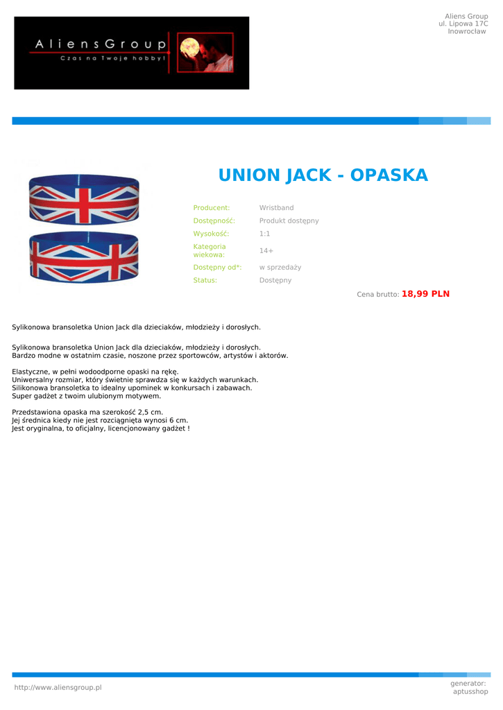 Aliens Group ul. Lipowa 17C Inowrocław UNION JACK - OPASKA Producent: Wristband Dostępność: Produkt dostępny Wysokość: 1:1 Kategoria wiekowa: 14+ Dostępny od*: w sprzedaży Status: Dostępny Cena brutto: 18,99 PLN Sylikonowa bransoletka Union Jack dla dzieciaków, młodzieży i dorosłych. Sylikonowa bransoletka Union Jack dla dzieciaków, młodzieży i dorosłych. Bardzo modne w ostatnim czasie, noszone przez sportowców, artystów i aktorów. Elastyczne, w pełni wodoodporne opaski na rękę. Uniwersalny rozmiar, który świetnie sprawdza się w każdych warunkach. Silikonowa bransoletka to idealny upominek w konkursach i zabawach. Super gadżet z twoim ulubionym motywem. Przedstawiona opaska ma szerokość 2,5 cm. Jej średnica kiedy nie jest rozciągnięta wynosi 6 cm. Jest oryginalna, to oficjalny, licencjonowany gadżet ! http://www.aliensgroup.pl generator: aptusshop