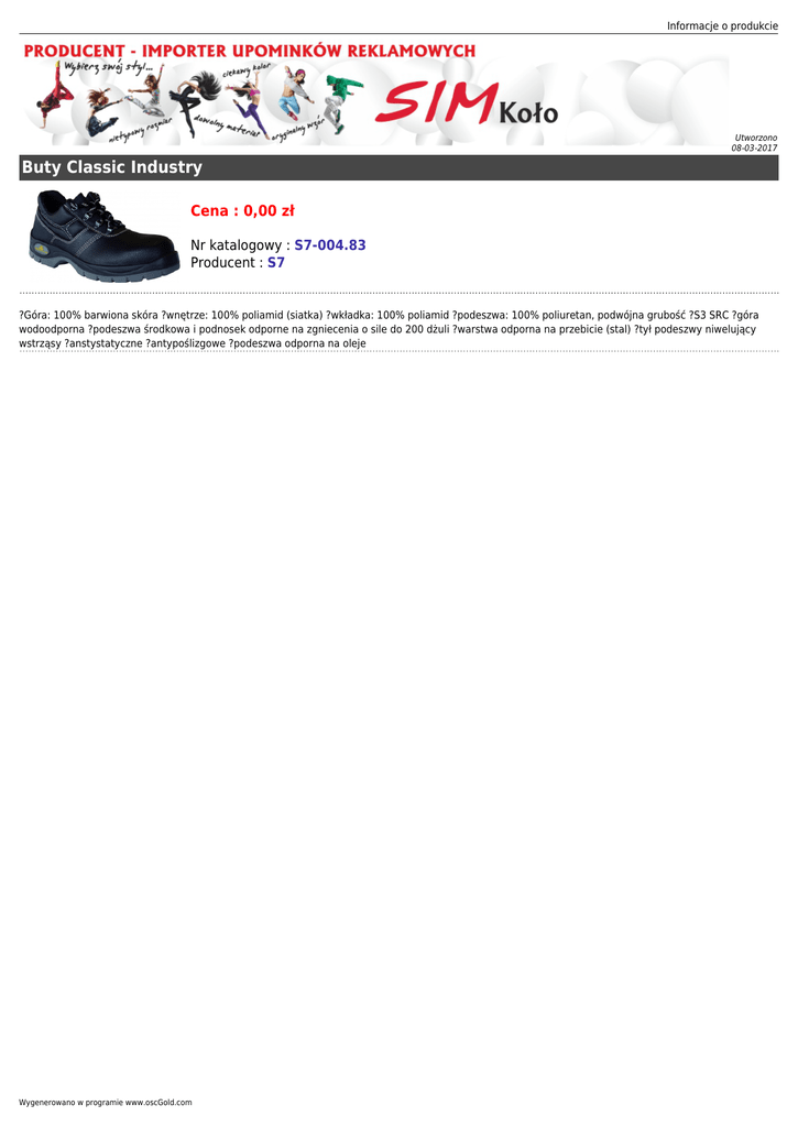 Informacje o produkcie Utworzono 08-03-2017 Buty Classic Industry Cena : 0,00 zł Nr katalogowy : S7-004.83 Producent : S7 ?Góra: 100% barwiona skóra ?wnętrze: 100% poliamid (siatka) ?wkładka: 100% poliamid ?podeszwa: 100% poliuretan, podwójna grubość ?S3 SRC ?góra wodoodporna ?podeszwa środkowa i podnosek odporne na zgniecenia o sile do 200 dżuli ?warstwa odporna na przebicie (stal) ?tył podeszwy niwelujący wstrząsy ?anstystatyczne ?antypoślizgowe ?podeszwa odporna na oleje Wygenerowano w programie www.oscGold.com