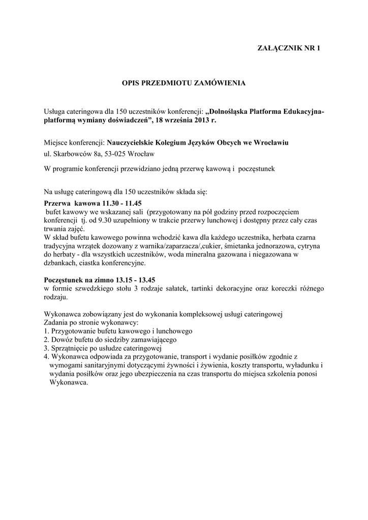 ZAŁĄCZNIK NR 1 OPIS PRZEDMIOTU ZAMÓWIENIA Usługa cateringowa dla 150 uczestników konferencji: ,,Dolnośląska Platforma Edukacyjnaplatformą wymiany doświadczeń”, 18 września 2013 r. Miejsce konferencji: Nauczycielskie Kolegium Języków Obcych we Wrocławiu ul. Skarbowców 8a, 53-025 Wrocław W programie konferencji przewidziano jedną przerwę kawową i poczęstunek Na usługę cateringową dla 150 uczestników składa się: Przerwa kawowa 11.30 - 11.45 bufet kawowy we wskazanej sali (przygotowany na pół godziny przed rozpoczęciem konferencji tj. od 9.30 uzupełniony w trakcie przerwy lunchowej i dostępny przez cały czas trwania zajęć. W skład bufetu kawowego powinna wchodzić kawa dla każdego uczestnika, herbata czarna tradycyjna wrzątek dozowany z warnika/zaparzacza/,cukier, śmietanka jednorazowa, cytryna do herbaty - dla wszystkich uczestników, woda mineralna gazowana i niegazowana w dzbankach, ciastka konferencyjne. Poczęstunek na zimno 13.15 - 13.45 w formie szwedzkiego stołu 3 rodzaje sałatek, tartinki dekoracyjne oraz koreczki różnego rodzaju. Wykonawca zobowiązany jest do wykonania kompleksowej usługi cateringowej Zadania po stronie wykonawcy: 1. Przygotowanie bufetu kawowego i lunchowego 2. Dowóz bufetu do siedziby zamawiającego 3. Sprzątnięcie po usłudze cateringowej 4. Wykonawca odpowiada za przygotowanie, transport i wydanie posiłków zgodnie z wymogami sanitaryjnymi dotyczącymi żywności i żywienia, koszty transportu, wyładunku i wydania posiłków oraz jego ubezpieczenia na czas transportu do miejsca szkolenia ponosi Wykonawca.