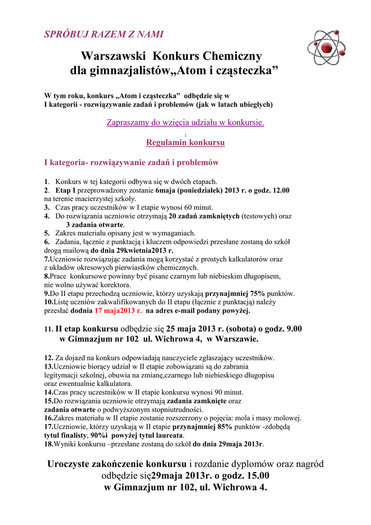 SPRÓBUJ RAZEM Z NAMI Warszawski Konkurs Chemiczny dla gimnazjalistów„Atom gimnazjalistów i cząsteczka” ąsteczka” W tym roku, konkurs „Atom i cząsteczka” cz odbędzie się w I kategorii - rozwiązywanie zywanie zadań zada i problemów (jak w latach ubiegłych) Zapraszamy do wzięcia wzi udziału w konkursie. . Regulamin konkursu I kategoria- rozwiązywanie ązywanie zadań zada i problemów 1.. Konkurs w tej kategorii odbywa się si w dwóch etapach. 2. Etap I przeprowadzony zostanie 6maja (poniedziałek) 2013 r. o godz. 12.00 na terenie macierzystej szkoły. 3. Czas pracy uczestników w I etapie wynosi 60 minut. 4. Do rozwiązania zania uczniowie otrzymają otrzymaj 20 zadań zamkniętych (testowych) oraz 3 zadania otwarte. 5. Zakres materiału opisany jest w wymaganiach. 6. Zadania, łącznie cznie z punktacją i kluczem odpowiedzi przesłane zostanąą do szkół drogą mailową do dnia 29kwietnia2013 r. 7.Uczniowie rozwiązując ąc zadania mogą mog korzystać z prostych kalkulatorów oraz z układów okresowych pierwiastków chemicznych. 8.Prace konkursowe kursowe powinny być by pisane czarnym lub niebieskim długopisem, nie wolno używać korektora. 9.Do II etapu przechodząą uczniowie, którzy uzyskają uzyskaj przynajmniej 75% punktów. 10.Listę uczniów zakwalifikowanych do II etapu (łącznie (ł z punktacją) ą) należy należ przesłać dodnia 17 maja2013 r. na adres e-mail podany powyżej. 11. II etap konkursu odbędzie odbę się 25 maja 2013 r. (sobota) o godz. 9.00 w Gimnazjum nr 102 ul. Wichrowa 4, w Warszawie. 12. Za dojazd na konkurs odpowiadają odpowiadaj nauczyciele zgłaszający uczestników. 13.Uczniowie biorący cy udział w II etapie zobowiązani zobowi są do zabrania legitymacji szkolnej, obuwia na zmianę,czarnego zmian ,czarnego lub niebieskiego długopisu oraz ewentualnie kalkulatora. 14.Czas Czas pracy uczestników w II etapie konkursu wynosi 90 minut. 15.Do rozwiązania zania uczniowie otrzymają otrzymaj zadania zamknięte oraz zadania otwarte o podwyższonym ższonym stopniutrudności. stopniu 16.Zakres Zakres materiału w II etapie zostanie rozszerzony o pojęcia: mola i masy molowej. 17.Uczniowie, Uczniowie, którzy uzyskają w II etapie przynajmniej 85% punktów -zdob zdobędą tytuł finalisty, 90%i powyżej żej tytuł laureata. laureata 18.Wyniki konkursu –przesłane przesłane zostaną zostan do szkół do dnia 29maja 2013r. Uroczyste zakończenie ńczenie konkursu i rozdanie dyplomów oraz nagród odbędzie ędzie się29maja si 2013r. o godz. 15.00 w Gimnazjum nr 102, ul. Wichrowa 4. Wymagania na Warszawski Konkurs Chemiczny „Atom i cząsteczka” Atom i cząsteczka. Praktyczne wykorzystanie układu okresowego pierwiastków chemicznych. 1. Budowa atomu (uproszczony model) dla danego pierwiastka o określonej liczbie Z, obliczanie ilości cząstek elementarnych (podstawowych). Zapis konfiguracji elektronowej atomu danego pierwiastka. 2. Budowa atomu a położenie pierwiastka w układzie okresowym (numer grupy a ilość elektronów walencyjnych i wartościowość, numer okresu a ilość powłok elektronowych, liczba atomowa a ilość protonów i elektronów). 3. Charakter chemiczny pierwiastków w układzie okresowym ( metale, niemetale i ich właściwości ); zmiana właściwości pierwiastków w układzie okresowym (w grupach i w okresach). 4. Izotopy jako odmiany tego samego pierwiastka. Nuklidy. 5. Masa atomowa i jej odczytywanie z układu okresowego (u); obliczanie średniej masy atomowej. 6. Zapis wzorów sumarycznych cząsteczek tlenków, wodorków, siarczków, chlorków. 7. Obliczanie masy cząsteczkowej związków oraz procentowej zawartości pierwiastka w związku chemicznym. 8. Wiązania chemiczne (kowalencyjne, kowalencyjne spolaryzowane, jonowe), zapisywanie wzorów elektronowych kropkowych. 9. Jony – liczba cząstek elementarnych np. w jonie Al 3+ . 10. Wzory strukturalne dla związków o wiązaniach kowalencyjnych. 11. Zapisywanie i bilansowanie równań reakcji chemicznych. Zależności stechiometryczne w reakcjach chemicznych. 1. Prawo zachowania masy. 2. Prawo stałości składu. 3. Obliczenia stechiometryczne na podstawie równań reakcji chemicznych. 4. Mol, masa molowa, zastosowanie moli w zadaniach (tylko w II etapie). 5. Objętość molowa (tylko w II etapie). Roztwory wodne 1. Rodzaje roztworów. 2. Stężenie procentowe. Zatężanie i rozcieńczanie roztworów. 3. Rozpuszczalność. Literatura Zatwierdzone przez MEN podręczniki i zbiory zadań z chemii dla gimnazjum, zgodne z nową podstawą programową. a) „Chemia dla gimnazjum klasa I” wyd. Nowa Era b) ,,Ciekawa chemia” WSiP c) „Chemia dla gimnazjum” wyd.WSiP d) „Chemia dla gimnazjum klasa I” wyd. Żak e) „Chemia dla gimnazjum” wyd. OPERON f) Zbiór zadań - Pazdro ,,Od zadań łatwych do trudnych’’ g) Zbiory zadań z chemii dla gimnazjum, wyd. Nowa Era, wyd. WSiP, wyd. OPERON, wyd. Żak. Konkurs „ Atom i cząsteczka” jest BEZPŁATNY. W razie jakichkolwiek wątpliwości prosimy o kontakt mailowy.