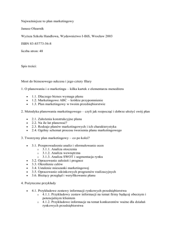 Najważniejsze to plan marketingowy Janusz Olearnik Wyższa Szkoła Handlowa, Wydawnictwo I-BiS, Wrocław 2003 ISBN 83-85773-56-8 liczba stron: 48 Spis treści: Most do biznesowego sukcesu i jego cztery filary 1. O planowaniu i o marketingu – kilka kartek z elementarza menedżera 1.1. Dlaczego biznes wymaga planu 1.2. Marketingowe ABC – krótkie przypomnienie 1.3. Plan marketingowy w twoim przedsiębiorstwie 2. Metodyka planowania marketingowego – czyli jak rozpocząć i dobrze ułożyć swój plan 2.1. Założenia konstrukcyjne planu 2.2. Na ile lat planować? 2.3. Rodzaje planów marketingowych i ich charakterystyka 2.4. Ogólny schemat procesu tworzenia planu marketingowego 3. Tworzymy plan marketingowy – co po kolei? 3.1. Przeprowadzenie analiz i sformułowanie ocen o 3.1.1. Analiza otoczenia o 3.1.2. Analiza wewnętrzna o 3.1.3. Analiza SWOT i segmentacja rynku 3.2. Opracowanie założeń i prognoz 3.3. Określenie celów 3.4. Ustalenie mieszanki marketingowej 3.5. Opracowanie odcinkowych programów realizacyjnych 3.6. Bieżący przegląd i weryfikowanie planu 4. Pożyteczne przykłady 4.1. Przykładowe zestawy informacji rynkowych przedsiębiorstwa o 4.1.1. Przykładowy zestaw informacji na temat firmy będącej obecnym i potencjalnym klientem o 4.1.2. Przykładowe informacje na temat konkurentów ważne dla działań rynkowych przedsiębiorstwa 4.1.3. Przykładowe informacje na temat innych podmiotów otoczenia ważne dla działań rynkowych przedsiębiorstwa 4.2. Przykładowa struktura treści planu marketingowego 4.3. Przykładowe sposoby opisu zadań w odcinkowym programie realizacyjnym planu marketingowego o 5. Dylematy planisty Słowo na zakończenie