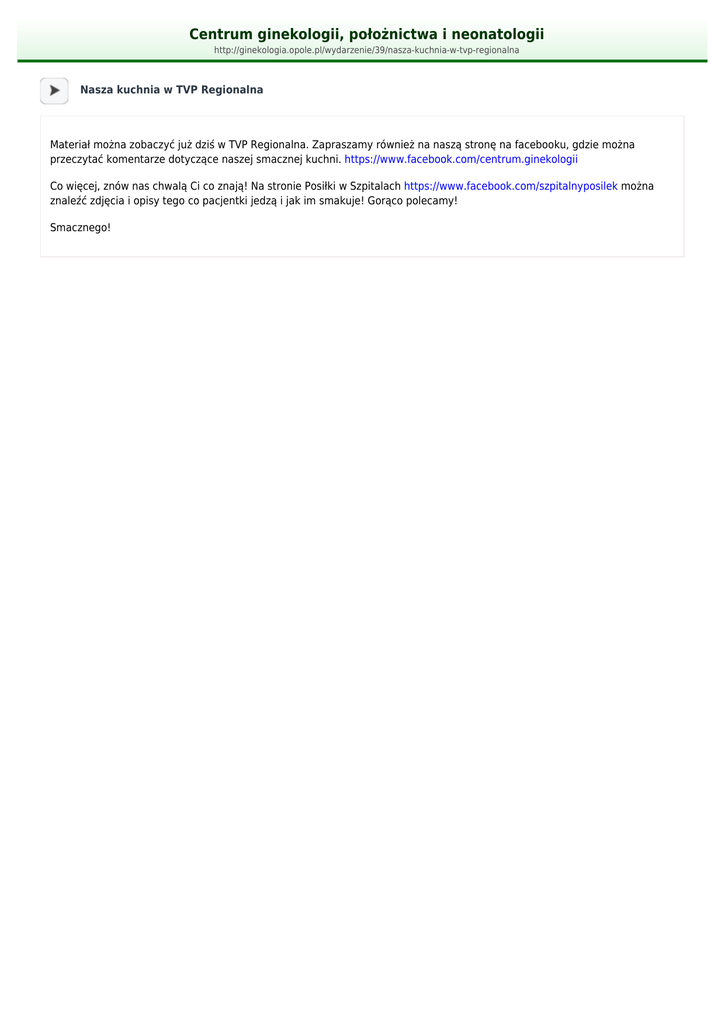 Centrum ginekologii, położnictwa i neonatologii http://ginekologia.opole.pl/wydarzenie/39/nasza-kuchnia-w-tvp-regionalna Nasza kuchnia w TVP Regionalna Materiał można zobaczyć już dziś w TVP Regionalna. Zapraszamy również na naszą stronę na facebooku, gdzie można przeczytać komentarze dotyczące naszej smacznej kuchni. https://www.facebook.com/centrum.ginekologii Co więcej, znów nas chwalą Ci co znają! Na stronie Posiłki w Szpitalach https://www.facebook.com/szpitalnyposilek można znaleźć zdjęcia i opisy tego co pacjentki jedzą i jak im smakuje! Gorąco polecamy! Smacznego!
