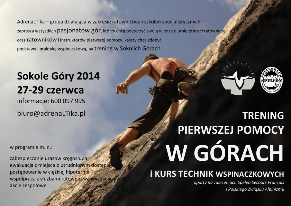 AdrenaLTika – grupa działająca w zakresie ratownictwa i szkoleń specjalistycznych – zaprasza wszystkich pasjonatów gór, którzy chcą poszerzyć swoją wiedzę o umiejętności ratownicze oraz ratowników i instruktorów pierwszej pomocy, którzy chcą zdobyć podstawy i praktykę wspinaczkową, na trening w Sokolich Górach. Sokole Góry 2014 27-29 czerwca informacje: 600 097 995 [email protected] TRENING PIERWSZEJ POMOCY w programie m.in.: zabezpieczanie urazów kręgosłupa ewakuacja z miejsca o utrudnionym dostępie postępowanie w ciężkiej hipotermii współpraca z służbami ratownictwa wysokościowego akcje zespołowe W GÓRACH i KURS TECHNIK WSPINACZKOWYCH oparty na zaleceniach Speleo Secours Francais i Polskiego Związku Alpinizmu dzień 1 zasady oceny ryzyka w zakresie uprawiania turystyki kwalifikowanej ewakuacja bezpośrednia z terenu eksponowanego zabezpieczanie urazów kostno-stawowych postępowanie przy podejrzeniu urazu kręgosłupa współpraca z służbami ratownictwa wysokościowego zasady zachowania się podczas lądowania śmigłowca podstawy technik wspinaczkowych – obsługa przyrządów asekuracyjnych komunikacja partnerów podczas wspinaczki dobór sprzętu wspinaczkowego do określonych zadań, wiązanie węzłów: ósemka, podwójna ósemka, skrajny tatrzański, wyblinka zakładanie stanowiska i zjazd pionowy dzień 2 ewakuacja trening ratowniczy w zdarzeniach pozorowanych (techniki wspinaczkowe i standardy opieki nad poszkodowanym urazowym) zajęcia w terenie działania pozorowane w jaskini model partnerski a model autorytatywny w kierowaniu działaniami górskimi akcje zespołowe dzień 3 atrakcje linowe podsumowanie Gdzie? Sokole Góry z jaskiniami – Olsztyńską, Wszystkich Świętych, Urwistą Za ile? cena dla absolwentów naszych kursów 540 PLN/osoba. Katalogowa cena bez zniżek to 800 PLN/osoba. Podane ceny zawierają VAT 23%. Cena zawiera opiekę instruktorów i ratowników, korzystanie w czasie zajęć ze sprzętu wspinaczkowego i ratowniczego, udział w programie merytorycznym i zajęciach w terenie, certyfikat pierwszej pomocy w górach, certyfikat wspinaczki z górną asekuracją. Cena nie zawiera noclegu (śpimy pod namiotami, warto mieć karimatę i śpiwór), wyżywienia (polecamy lokalny sklep i posiłki przy ognisku), dojazdu (chętnie pomożemy we wzajemnym skontaktowaniu uczestników, by ułatwić zebranie ekip na dojazd), ubezpieczenia NNW (warto wykupić!). www.adrenaLTika.pl 600 097 995 [email protected]