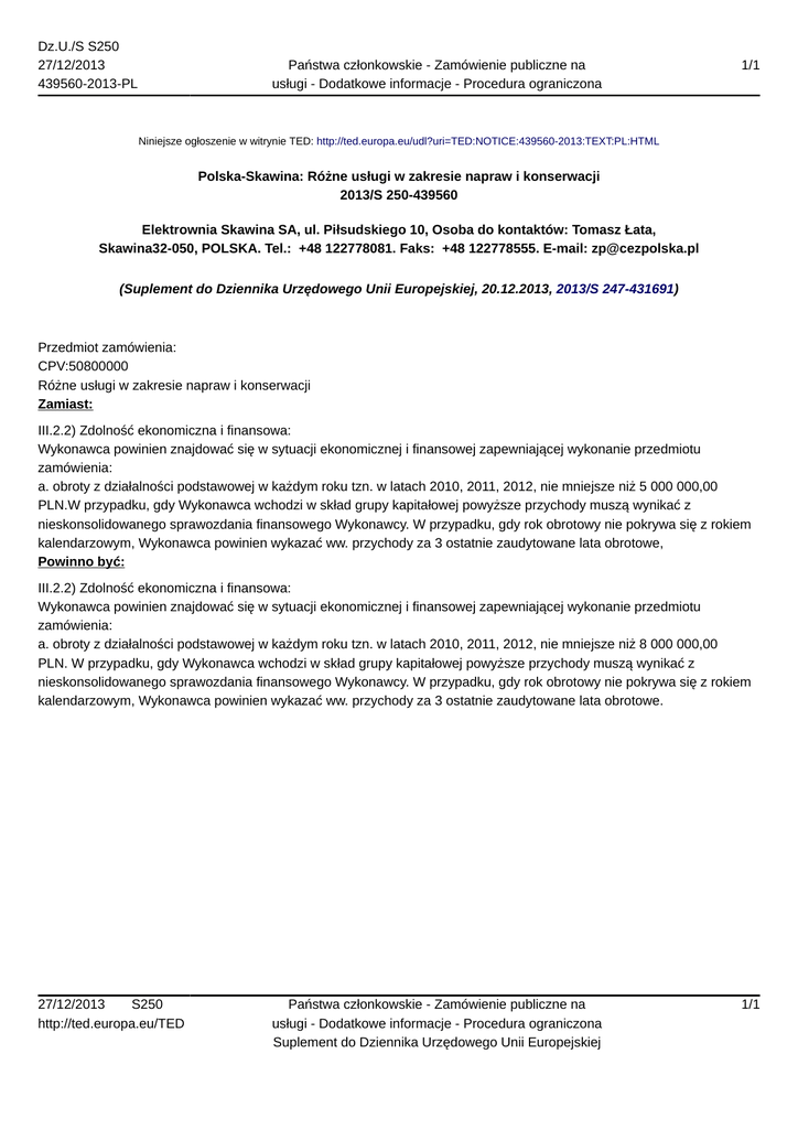 Dz.U./S S250 27/12/2013 439560-2013-PL Państwa członkowskie - Zamówienie publiczne na usługi - Dodatkowe informacje - Procedura ograniczona 1/1 Niniejsze ogłoszenie w witrynie TED: http://ted.europa.eu/udl?uri=TED:NOTICE:439560-2013:TEXT:PL:HTML Polska-Skawina: Różne usługi w zakresie napraw i konserwacji 2013/S 250-439560 Elektrownia Skawina SA, ul. Piłsudskiego 10, Osoba do kontaktów: Tomasz Łata, Skawina32-050, POLSKA. Tel.: +48 122778081. Faks: +48 122778555. E-mail: [email protected] (Suplement do Dziennika Urzędowego Unii Europejskiej, 20.12.2013, 2013/S 247-431691) Przedmiot zamówienia: CPV:50800000 Różne usługi w zakresie napraw i konserwacji Zamiast: III.2.2) Zdolność ekonomiczna i finansowa: Wykonawca powinien znajdować się w sytuacji ekonomicznej i finansowej zapewniającej wykonanie przedmiotu zamówienia: a. obroty z działalności podstawowej w każdym roku tzn. w latach 2010, 2011, 2012, nie mniejsze niż 5 000 000,00 PLN.W przypadku, gdy Wykonawca wchodzi w skład grupy kapitałowej powyższe przychody muszą wynikać z nieskonsolidowanego sprawozdania finansowego Wykonawcy. W przypadku, gdy rok obrotowy nie pokrywa się z rokiem kalendarzowym, Wykonawca powinien wykazać ww. przychody za 3 ostatnie zaudytowane lata obrotowe, Powinno być: III.2.2) Zdolność ekonomiczna i finansowa: Wykonawca powinien znajdować się w sytuacji ekonomicznej i finansowej zapewniającej wykonanie przedmiotu zamówienia: a. obroty z działalności podstawowej w każdym roku tzn. w latach 2010, 2011, 2012, nie mniejsze niż 8 000 000,00 PLN. W przypadku, gdy Wykonawca wchodzi w skład grupy kapitałowej powyższe przychody muszą wynikać z nieskonsolidowanego sprawozdania finansowego Wykonawcy. W przypadku, gdy rok obrotowy nie pokrywa się z rokiem kalendarzowym, Wykonawca powinien wykazać ww. przychody za 3 ostatnie zaudytowane lata obrotowe. 27/12/2013 S250 http://ted.europa.eu/TED Państwa członkowskie - Zamówienie publiczne na usługi - Dodatkowe informacje - Procedura ograniczona Suplement do Dziennika Urzędowego Unii Europejskiej 1/1