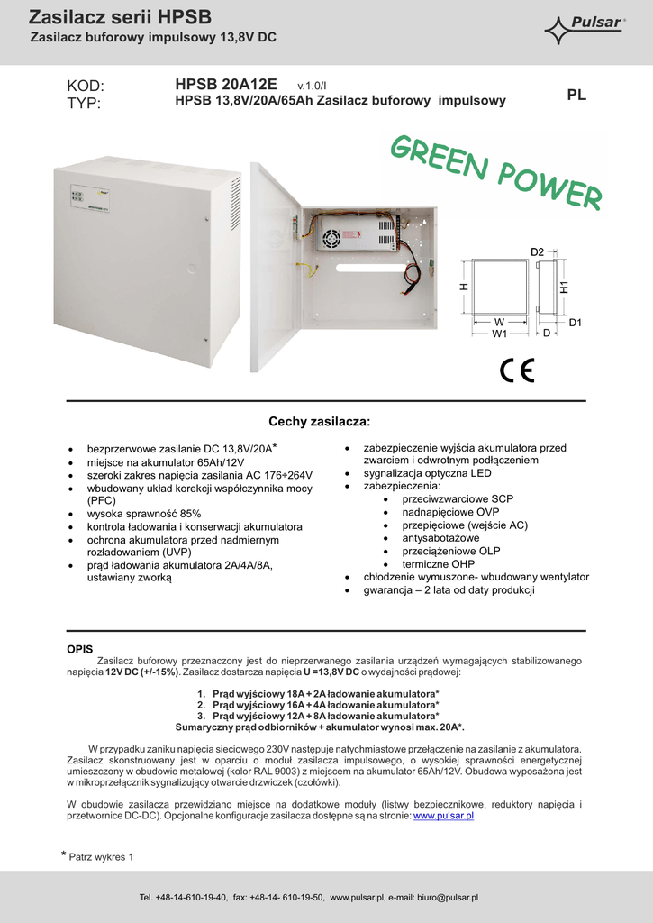 Zasilacz serii HPSB Pulsar Zasilacz buforowy impulsowy 13,8V DC KOD: TYP: HPSB 20A12E v.1.0/I HPSB 13,8V/20A/65Ah Zasilacz buforowy impulsowy PL Cechy zasilacza: · · · · · · · · bezprzerwowe zasilanie DC 13,8V/20A* miejsce na akumulator 65Ah/12V szeroki zakres napięcia zasilania AC 176÷264V wbudowany układ korekcji współczynnika mocy (PFC) wysoka sprawność 85% kontrola ładowania i konserwacji akumulatora ochrona akumulatora przed nadmiernym rozładowaniem (UVP) prąd ładowania akumulatora 2A/4A/8A, ustawiany zworką · · · · · zabezpieczenie wyjścia akumulatora przed zwarciem i odwrotnym podłączeniem sygnalizacja optyczna LED zabezpieczenia: · przeciwzwarciowe SCP · nadnapięciowe OVP · przepięciowe (wejście AC) · antysabotażowe · przeciążeniowe OLP · termiczne OHP chłodzenie wymuszone- wbudowany wentylator gwarancja – 2 lata od daty produkcji OPIS Zasilacz buforowy przeznaczony jest do nieprzerwanego zasilania urządzeń wymagających stabilizowanego napięcia 12V DC (+/-15%). Zasilacz dostarcza napięcia U =13,8V DC o wydajności prądowej: 1. Prąd wyjściowy 18A + 2A ładowanie akumulatora* 2. Prąd wyjściowy 16A + 4A ładowanie akumulatora* 3. Prąd wyjściowy 12A + 8A ładowanie akumulatora* Sumaryczny prąd odbiorników + akumulator wynosi max. 20A*. W przypadku zaniku napięcia sieciowego 230V następuje natychmiastowe przełączenie na zasilanie z akumulatora. Zasilacz skonstruowany jest w oparciu o moduł zasilacza impulsowego, o wysokiej sprawności energetycznej umieszczony w obudowie metalowej (kolor RAL 9003) z miejscem na akumulator 65Ah/12V. Obudowa wyposażona jest w mikroprzełącznik sygnalizujący otwarcie drzwiczek (czołówki). W obudowie zasilacza przewidziano miejsce na dodatkowe moduły (listwy bezpiecznikowe, reduktory napięcia i przetwornice DC-DC). Opcjonalne konfiguracje zasilacza dostępne są na stronie: www.pulsar.pl * Patrz wykres 1 Tel. +48-14-610-19-40, fax: +48-14- 610-19-50, www.pulsar.pl, e-mail: [email protected] ® Zasilacz serii HPSB Pulsar Zasilacz buforowy impulsowy 13,8V DC DANE TECHNICZNE Typ zasilacza Napięcie zasilania Pobór prądu Moc zasilacza Sprawność Współczynnik mocy PF Napięcie wyjściowe Prąd wyjściowy tAMB<30°C Prąd wyjściowy tAMB=40°C Zakres regulacji napięcia wyjściowego Napięcie tętnienia Pobór prądu przez układy zasilacza Prąd ładowania akumulatora Zabezpieczenie przed zwarciem SCP Zabezpieczenie przeciążeniowe OLP Zabezpieczenie w obwodzie akumulatora SCP i odwrotna polaryzacja podłączenia Zabezpieczenie przepięciowe Zabezpieczenie nadnapięciowe OVP Zabezpieczenie akumulatora przed nadmiernym rozładowaniem UVP Zabezpieczenie antysabotażowe: - TAMPER wyjście sygnalizujące otwarcie obudowy zasilacza Optyczna sygnalizacja pracy Warunki pracy Obudowa Wymiary Waga netto/brutto Miejsce na akumulator Zamykanie Deklaracje, gwarancja Uwagi: A (EPS - External Power Source) 176÷264V AC 50Hz 1,5A@230V AC max. 300W max. 85% >0,95 @230V AC 11V÷ 13,8V DC – praca buforowa 9,5V÷13,8V DC – praca bateryjna 18A + 2A ładowanie akumulatora - patrz wykres 1 16A + 4A ładowanie akumulatora - patrz wykres 1 12A + 8A ładowanie akumulatora - patrz wykres 1 12A + 2A ładowanie akumulatora - patrz wykres 1 10A + 4A ładowanie akumulatora - patrz wykres 1 6A + 8A ładowanie akumulatora - patrz wykres 1 12÷14V DC 120 mV p-p max. 170 mA 2A, 4A lub 8A ustawiany zworką elektroniczne, automatyczny powrót 105-150% mocy zasilacza, automatyczny powrót bezpiecznik topikowy 30A warystory >16V (zadziałanie wymaga odłączenia napięcia zasilania na czas min. 20 s.) U<9,5V (± 5%) – odłączenie zacisku akumulatora - microswitch, styki NC (obudowa zamknięta), 0,5A@50V DC (max.) tak - diody LED II klasa środowiskowa, -10 oC÷40 oC Blacha stalowa, DC01 1,0mm kolor RAL 9003 400 x 350 x 170+8 [mm] (WxHxD) 6,7/ 7,0 kg 65Ah/12V (SLA) max. H W 360 x 175 x 165mm (WxHxD) max D wkręt walcowy x 2 (z czoła), możliwość montażu zamka CE, RoHS, 2 lata od daty produkcji Obudowa posiada dystans od podłoża montażowego w celu prowadzenia okablowania. Chłodzenie zasilacza: wymuszone - wbudowany wentylator Wykres 1. Dopuszczalny prąd wyjściowy zasilacza w zależności od temperatury otoczenia. wyjście TAMPER : przewody 30cm Tel. +48-14-610-19-40, fax: +48-14- 610-19-50, www.pulsar.pl, e-mail: [email protected] ®