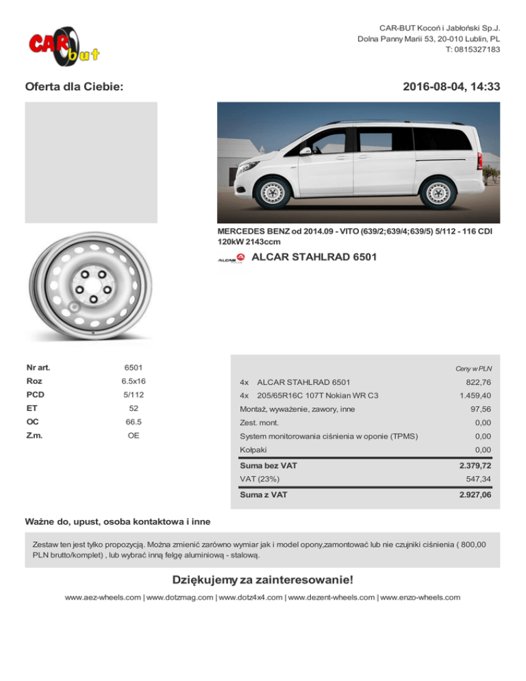 CAR-BUT Kocoń i Jabłoński Sp.J. Dolna Panny Marii 53, 20-010 Lublin, PL T: 0815327183 Oferta dla Ciebie: 2016-08-04, 14:33 MERCEDES BENZ od 2014.09 - VITO (639/2;639/4;639/5) 5/112 - 116 CDI 120kW 2143ccm ALCAR STAHLRAD 6501 Nr art. 6501 Ceny w PLN Roz 6.5x16 4x ALCAR STAHLRAD 6501 PCD 5/112 4x 205/65R16C 107T Nokian WR C3 822,76 1.459,40 ET 52 OC 66.5 Zest. mont. 0,00 Z.m. OE System monitorowania ciśnienia w oponie (TPMS) 0,00 Kołpaki 0,00 Montaż, wyważenie, zawory, inne Suma bez VAT 97,56 2.379,72 VAT (23%) Suma z VAT 547,34 2.927,06 Ważne do, upust, osoba kontaktowa i inne Zestaw ten jest tylko propozycją. Można zmienić zarówno wymiar jak i model opony,zamontować lub nie czujniki ciśnienia ( 800,00 PLN brutto/komplet) , lub wybrać inną felgę aluminiową - stalową. Dziękujemy za zainteresowanie! www.aez-wheels.com | www.dotzmag.com | www.dotz4x4.com | www.dezent-wheels.com | www.enzo-wheels.com