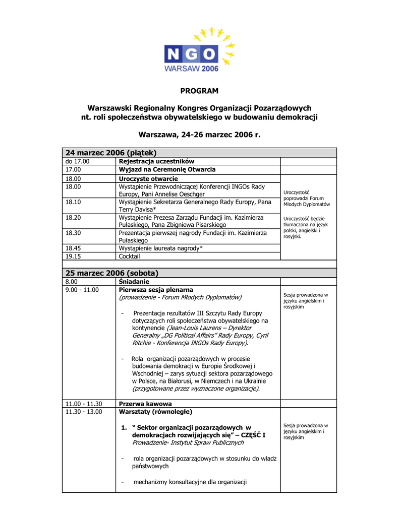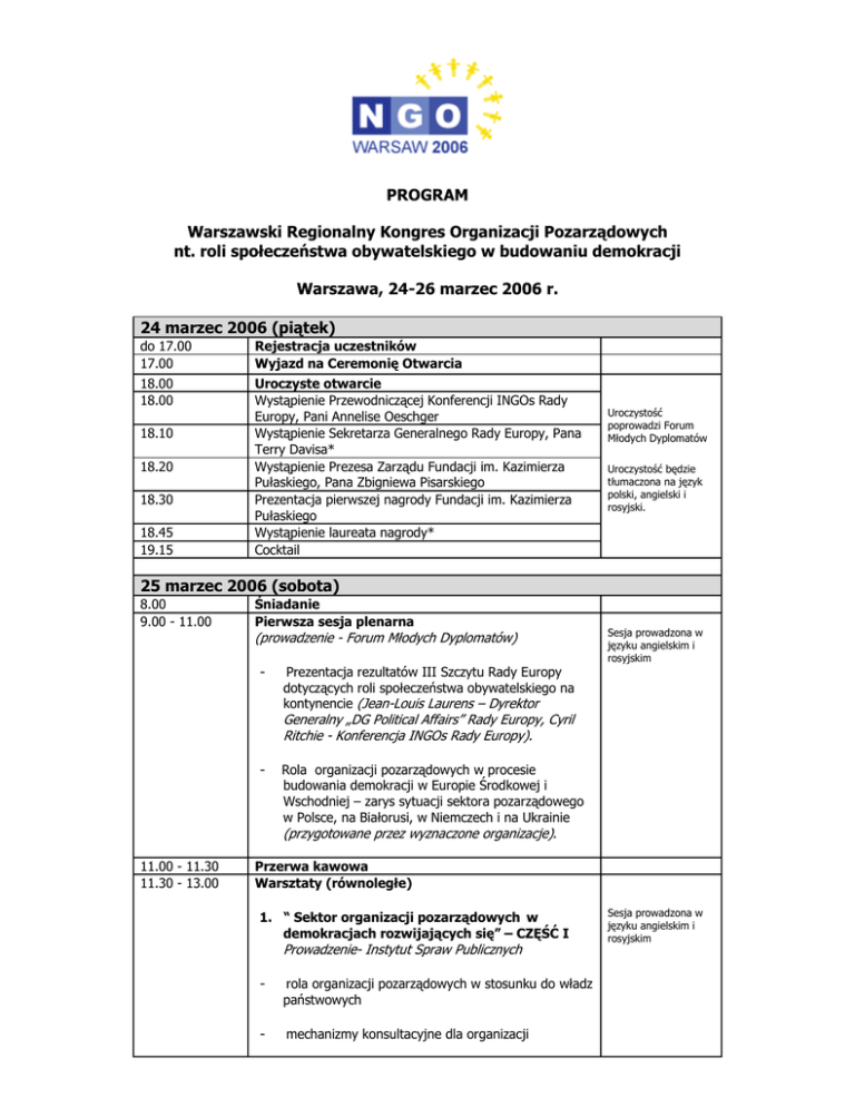 PROGRAM Warszawski Regionalny Kongres Organizacji Pozarządowych nt. roli społeczeństwa obywatelskiego w budowaniu demokracji Warszawa, 24-26 marzec 2006 r. 24 marzec 2006 (piątek) do 17.00 17.00 Rejestracja uczestników Wyjazd na Ceremonię Otwarcia 18.00 18.00 Uroczyste otwarcie Wystąpienie Przewodniczącej Konferencji INGOs Rady Europy, Pani Annelise Oeschger Wystąpienie Sekretarza Generalnego Rady Europy, Pana Terry Davisa* Wystąpienie Prezesa Zarządu Fundacji im. Kazimierza Pułaskiego, Pana Zbigniewa Pisarskiego Prezentacja pierwszej nagrody Fundacji im. Kazimierza Pułaskiego Wystąpienie laureata nagrody* Cocktail 18.10 18.20 18.30 18.45 19.15 Uroczystość poprowadzi Forum Młodych Dyplomatów Uroczystość będzie tłumaczona na język polski, angielski i rosyjski. 25 marzec 2006 (sobota) 8.00 9.00 - 11.00 Śniadanie Pierwsza sesja plenarna (prowadzenie - Forum Młodych Dyplomatów) - Prezentacja rezultatów III Szczytu Rady Europy dotyczących roli społeczeństwa obywatelskiego na kontynencie (Jean-Louis Laurens – Dyrektor Sesja prowadzona w języku angielskim i rosyjskim Generalny „DG Political Affairs” Rady Europy, Cyril Ritchie - Konferencja INGOs Rady Europy). - 11.00 - 11.30 11.30 - 13.00 Rola organizacji pozarządowych w procesie budowania demokracji w Europie Środkowej i Wschodniej – zarys sytuacji sektora pozarządowego w Polsce, na Białorusi, w Niemczech i na Ukrainie (przygotowane przez wyznaczone organizacje). Przerwa kawowa Warsztaty (równoległe) 1. “ Sektor organizacji pozarządowych w demokracjach rozwijających się” – CZĘŚĆ I Prowadzenie- Instytut Spraw Publicznych - rola organizacji pozarządowych w stosunku do władz państwowych - mechanizmy konsultacyjne dla organizacji Sesja prowadzona w języku angielskim i rosyjskim pozarządowych na płaszczyźnie państwowej 2. “Wspieranie sektora pozarządowego na Białorusi.” – CZĘŚĆ I Prowadzenie - Fundacja im. Kazimierza Pułaskiego - obecny stan prawny III sektora na Białorusi - wpływ wyborów prezydenckich na Białorusi na białoruskie społeczeństwo obywatelskie 3. 13.00 - 14.00 14.30 - 16.00 “Praca na poziomie europejskim”– CZĘŚĆ I Prowadzenie - Konferencja INGOs Rady Europy - Konferencja INGOs Rady Europy, jej działalność i skład - udział organizacji pozarządowych w tworzeniu polityki Rady Europy - wskazanie głównych przeszkód dla organizacji pozarządowych we współpracy międzynarodowej w Europie oraz sposoby ich przezwyciężania Sesja prowadzona w języku angielskim i rosyjskim Sesja prowadzona w języku angielskim Obiad Kontynuacja warsztatów 1. “Sektor organizacji pozarządowych w demokracjach rozwijających się” – CZĘŚĆ II Prowadzenie - Instytut Spraw Publicznych - główne przeszkody dla sektora pozarządowego na Ukrainie i Federacji Rosyjskiej oraz sposoby ich przezwyciężania - prezentacja możliwych sposobów wymiany wiedzy i doświadczeń między organizacjami pozarządowymi z Ukrainy i Federacji Rosyjskiej oraz innymi organizacjami z regionu - Podsumowanie 2. “Wspieranie sektora pozarządowego na Białorusi.” – CZĘŚĆ II Sesja prowadzona w języku angielskim i rosyjskim Sesja prowadzona w języku angielskim i rosyjskim Prowadzenie – Wschodnioeuropejskie Centrum Demokratyczne - wskazanie możliwości poprawy współpracy i przepływu informacji między białoruskimi organizacjami pozarządowymi a organizacjami pozarządowymi z regionu - możliwości wprowadzenia wolnego dostępu to zróżnicowanych źródeł informacji dla szeregu białoruskich organizacji pozarządowych. „Warsaw Regional NGO Congress” Organizing Committee ul. Mariana Sengera „Cichego” 10/2A, 02-790 Warszawa, Poland tel./fax +48 22 408 64 84, [email protected], www.warsawcongress.pl 2 - Podsumowanie 3. “Praca na poziomie europejskim”– CZĘŚĆ II Prowadzenie - Konferencja INGOs Rady Europy 16.00 – 16.30 16.30 – 17.15 - w poszukiwaniu europejskich instrumentów prawnych regulujących sytuację organizacji pozarządowych - zastosowanie artykułu 11 Europejskiej Konwencji o Ochronie Praw Człowieka i Podstawowych Wolności Wolności Zgromadzeń Podsumowanie Przerwa kawowa Druga sesja plenarna Prowadzenie - Daniel Zieliński – Konferencja INGOs Rady Europy 17.30 – 19.00 Sesja prowadzona w języku angielskim - podsumowanie pracy i dyskusji warsztatów (sprawozdania poszczególnych grup) - propozycje wniosków końcowych Sesja prowadzona w języku angielskim i rosyjskim Sesja interaktywna (Networking session) Praca w grupach mająca na celu zainicjowanie pomysłów na nowe projekty (grupy podzielone tematycznie na podstawie zgłoszonych w aplikacji przez uczestników zainteresowań) 19.30 20.00 Wyjazd na przyjęcie Przyjęcie 26 marzec 2006 (niedziela) 8.00 9.00 - 10.30 Śniadanie Warsztaty 1. “Europejska Polityka Sąsiedzka Unii Europejskiej wobec Białorusi i Ukrainy” Prowadzenie - Centrum Stosunków Międzynarodowych 2. “Rola fundacji politycznych w procesie budowania demokracji” Sesja prowadzona w języku angielskim i niemieckim “Umacnianie ruchów na rzecz praw człowieka i społeczeństwa obywatelskiego na Białorusi i Ukrainie “ Sesja prowadzona w języku angielskim i rosyjskim Prowadzenie - Fundacja im. Konrada Adenauera 3. Sesja prowadzona w języku angielskim i rosyjskim Prowadzenie – Helsińska Fundacja Praw Człowieka 10.30 - 11.00 11.00 - 12.30 Przerwa kawowa Końcowa sesja plenarna - prezentacja rekomendacji wypracowanych w ramach „Warsaw Regional NGO Congress” Organizing Committee ul. Mariana Sengera „Cichego” 10/2A, 02-790 Warszawa, Poland tel./fax +48 22 408 64 84, [email protected], www.warsawcongress.pl Sesja prowadzona w języku angielskim i rosyjskim 3 warsztatów - 13.00 15.00 prezentacja propozycji projektów zainicjowanych w trakcie trwania Kongresu Wnioski końcowe oraz zakończenie Kongresu Obiad Wyjazd uczestników * do potwierdzenia „Warsaw Regional NGO Congress” Organizing Committe