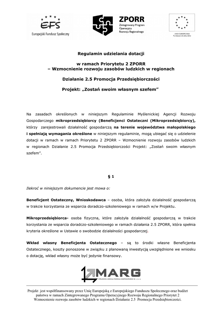 Regulamin udzielania dotacji w ramach Priorytetu 2 ZPORR – Wzmocnienie rozwoju zasobów ludzkich w regionach Działanie 2.5 Promocja Przedsiębiorczości Projekt: „Zostań swoim własnym szefem” Na zasadach określonych w niniejszym Regulaminie Myślenickiej Agencji Rozwoju Gospodarczego mikroprzedsiębiorcy (Beneficjenci Ostateczni (Mikroprzedsiębiorcy), którzy zarejestrowali działalność gospodarczą na terenie województwa małopolskiego i spełniają wymagania określone w niniejszym regulaminie, mogą ubiegać się o udzielenie dotacji w ramach w ramach Priorytetu 2 ZPORR – Wzmocnienie rozwoju zasobów ludzkich w regionach Działanie 2.5 Promocja Przedsiębiorczości Projekt: „Zostań swoim własnym szefem”. §1 Ilekroć w niniejszym dokumencie jest mowa o: Beneficjent Ostateczny, Wnioskodawca – osoba, która założyła działalność gospodarczą w trakcie korzystania ze wsparcia doradczo-szkoleniowego w ramach w/w Projektu. Mikroprzedsiębiorca- osoba fizyczna, które założyła działalność gospodarczą w trakcie korzystania ze wsparcia doradczo-szkoleniowego w ramach działania 2.5 ZPORR, która spełnia kryteria określone w Ustawie o swobodzie działalności gospodarczej. Wkład własny Beneficjenta Ostatecznego – są to środki własne Beneficjenta Ostatecznego, koszty ponoszone w związku z planowaną inwestycją uwzględnione we wniosku o dotację, wkład własny może być jedynie finansowy. Projekt jest współfinansowany przez Unię Europejską z Europejskiego Funduszu Społecznego oraz budżet państwa w ramach Zintegrowanego Programu Operacyjnego Rozwoju Regionalnego Priorytet 2 Wzmocnienie rozwoju zasobów ludzkich w regionach Działanie 2.5 Promocja Przedsiębiorczości. Wydatki kwalifikowalne – koszty, które kwalifikują się do finansowania ze środków, w ramach których powyższy Projekt jest realizowany. Pomoc de minimis – pomoc publiczna, która może być udzielana przedsiębiorcy w ograniczonej wysokości zgodnie z Rozporządzeniem Ministra Rozwoju Gospodarczego z dnia 16 lutego 2007 w sprawie udzielania pomocy de minimis na promocję przedsiębiorczości (Dz.u. Nr 30, poz.200) Komisja oceniająca – komisja powołana przez Myślenicką Agencję Rozwoju Gospodarczego do oceny składanych przez Beneficjentów Ostatecznych Biznes Planów, w skład której wchodzą koordynator Projektu, Zastępca Koordynatora Projektu, Trener Komisja Oceny Projektów – komisja powołana przez Urząd Marszałkowski Województwa Małopolskiego, której celem jest weryfikacja i ocena wniosków o przyznanie dotacji na podstawie składanych przez Beneficjantów Ostatecznych wniosków o wypłatę dotacji. Dotacja – bezzwrotna pomoc finansowa udzielana Beneficjentowi Ostatecznemu w ramach projektu. §2 Pomoc finansowa w postaci dotacji udzielana jest osobom, które założyły działalność gospodarczą w wyniku korzystania ze wsparcia doradczo-szkoleniowego w ramach projektu oraz: 1) spełniają kryteria określone dla mikroprzedsiębiorcy i 2) od momentu zarejestrowania przez nich działalności nie minęło więcej niż 36 miesięcy. Projekt jest współfinansowany przez Unię Europejską z Europejskiego Funduszu Społecznego oraz budżet państwa w ramach Zintegrowanego Programu Operacyjnego Rozwoju Regionalnego Priorytet 2 Wzmocnienie rozwoju zasobów ludzkich w regionach Działanie 2.5 Promocja Przedsiębiorczości. §3 Przekazywana pomocy finansowa mikroprzedsiębiorstwu spełniającemu w/w kryteria może przyjąć formę: • Podstawowego wsparcia pomostowego (dotacja w wys. 700 PLN wypłacana przez okres pierwszych 6 miesięcy działalności od momentu zarejestrowania firmy, ma ona ułatwić pokrycie comiesięcznych obligatoryjnych składek na rzecz ZUS) • Przedłużonego wsparcia pomostowego (dotacja w wys. 700 PLN wypłacana przez okres kolejnych 6 miesięcy, mająca na celu zapewnić uzyskanie i utrzymanie płynności finansowej mikroprzedsiębiorcy) • Jednorazowej dotacji inwestycyjnej na rozwój działalności poprzez sfinansowanie pierwszych wydatków inwestycyjnych np. sprzętu, mebli, maszyn, urządzeń (do 75% wartości inwestycji, jednak nie więcej niż 20 tys. PLN). §4 1. Wsparcie pomostowe wypłacane jest w miesięcznych transzach. Przed wypłatą drugiej i ostatniej transzy dotacji Beneficjent Ostateczny jest zobowiązany udokumentować dokonanie wpłaty składek na ubezpieczenia społeczne i zdrowotne wynikające z odrębnych przepisów. 2. Przedłużone wsparcie pomostowe wypłacane jest w miesięcznych transzach. Przed wypłatą drugiej i ostatniej transzy dotacji Beneficjent Ostateczny jest zobowiązany udokumentować dokonanie wpłaty składek na ubezpieczenia społeczne i zdrowotne wynikające z odrębnych przepisów. 3. Ze środków jednorazowej dotacji inwestycyjnej pokrywane jest 75% kosztów kwalifikowanych inwestycji, a pozostałe 25% ponosi Beneficjent Ostateczny ze Projekt jest współfinansowany przez Unię Europejską z Europejskiego Funduszu Społecznego oraz budżet państwa w ramach Zintegrowanego Programu Operacyjnego Rozwoju Regionalnego Priorytet 2 Wzmocnienie rozwoju zasobów ludzkich w regionach Działanie 2.5 Promocja Przedsiębiorczości. środków własnych. §5 Ilość i wielkość dotacji udzielanych w ramach projektu jest ograniczona zarezerwowanymi na ten cel środkami pochodzącymi ze środków Europejskiego Funduszu Społecznego i krajowych środków publicznych, które są określone w umowie między Myślenicką Agencją Rozwoju Gospodarczego a Urzędem Marszałkowskim Województwa Małopolskiego. §6 1. W celu otrzymania dotacji wnioskodawca wypełnia wniosek o właściwą dotację wraz z biznes planem i wymaganymi załącznikami. 2. Wniosek składany jest w Myślenickiej Agencji Rozwoju Gospodarczego. 3. Komisja Oceniająca dokonuje analizy wniosku i oceny przedsięwzięcia oraz opiniuje o przyznaniu/odrzuceniu wniosku o dotację. 4. Uzasadnienie decyzji jest jawne. Członkowie komisji uz